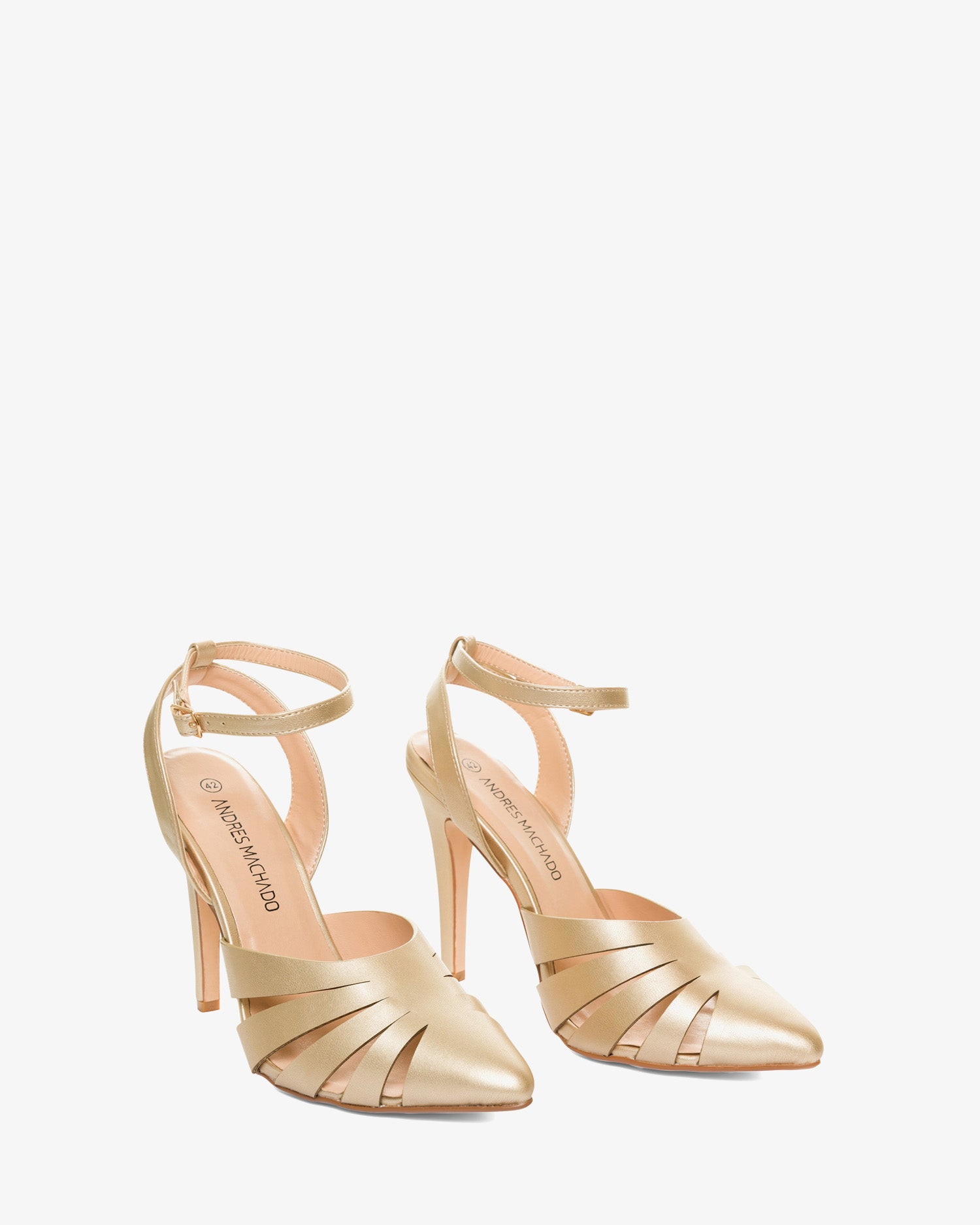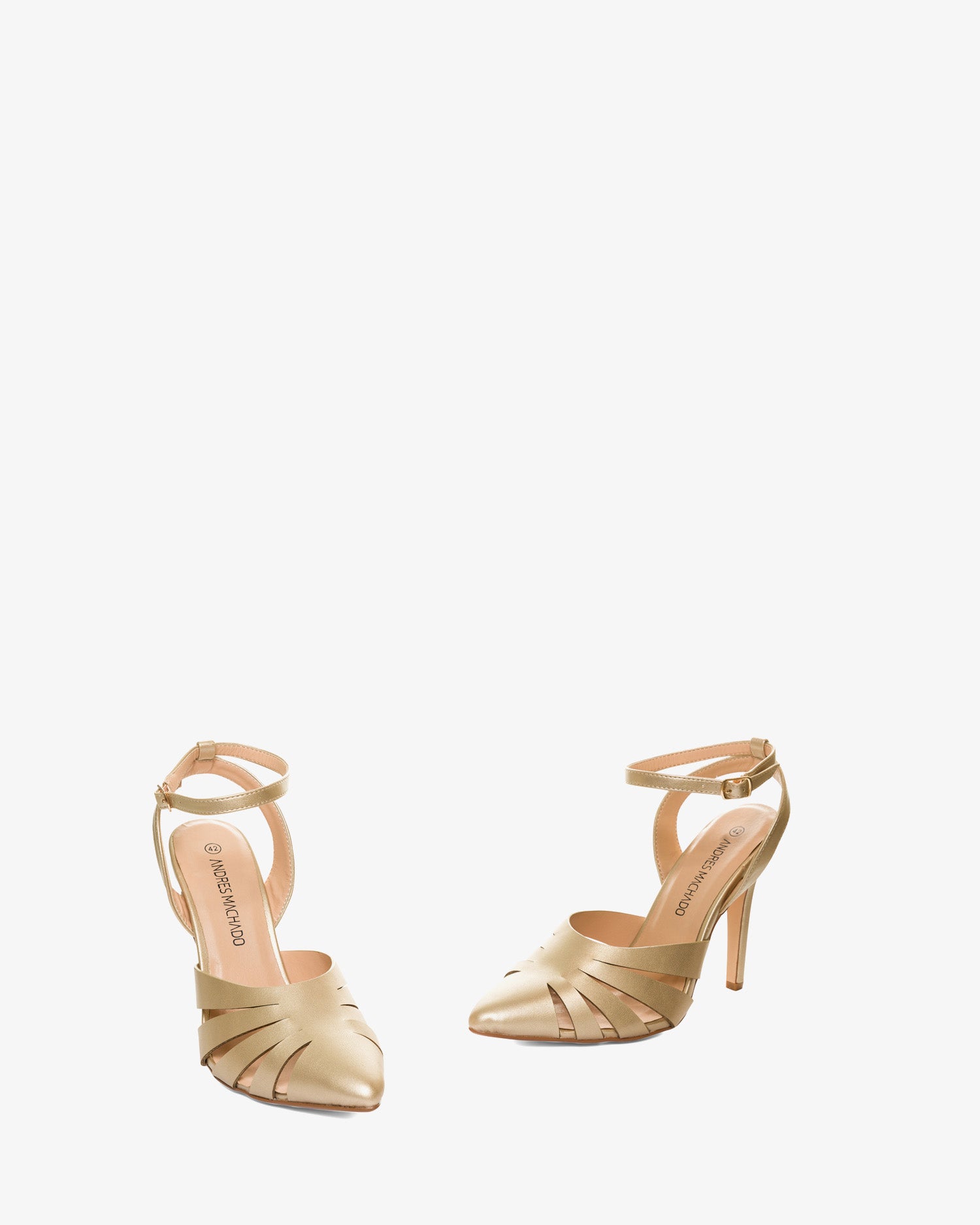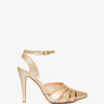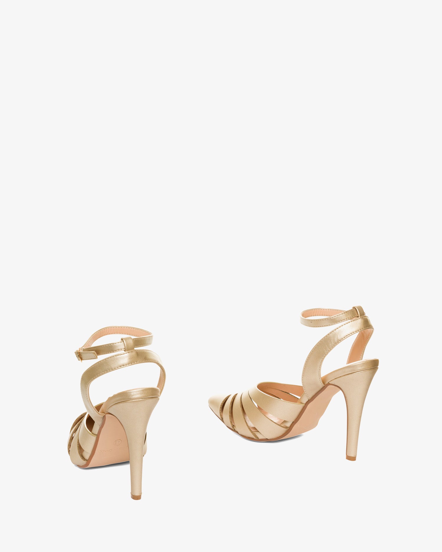 Gold faux leather heeled court shoes finished in a pointed toe. Slingback design and buckled strap closure. The thin, matching heel is 3,94`` for small sizes from 32 to 35 EU. The thin, matching heel is 4,72`` for small sizes from 42 to 45 EU.