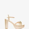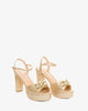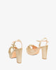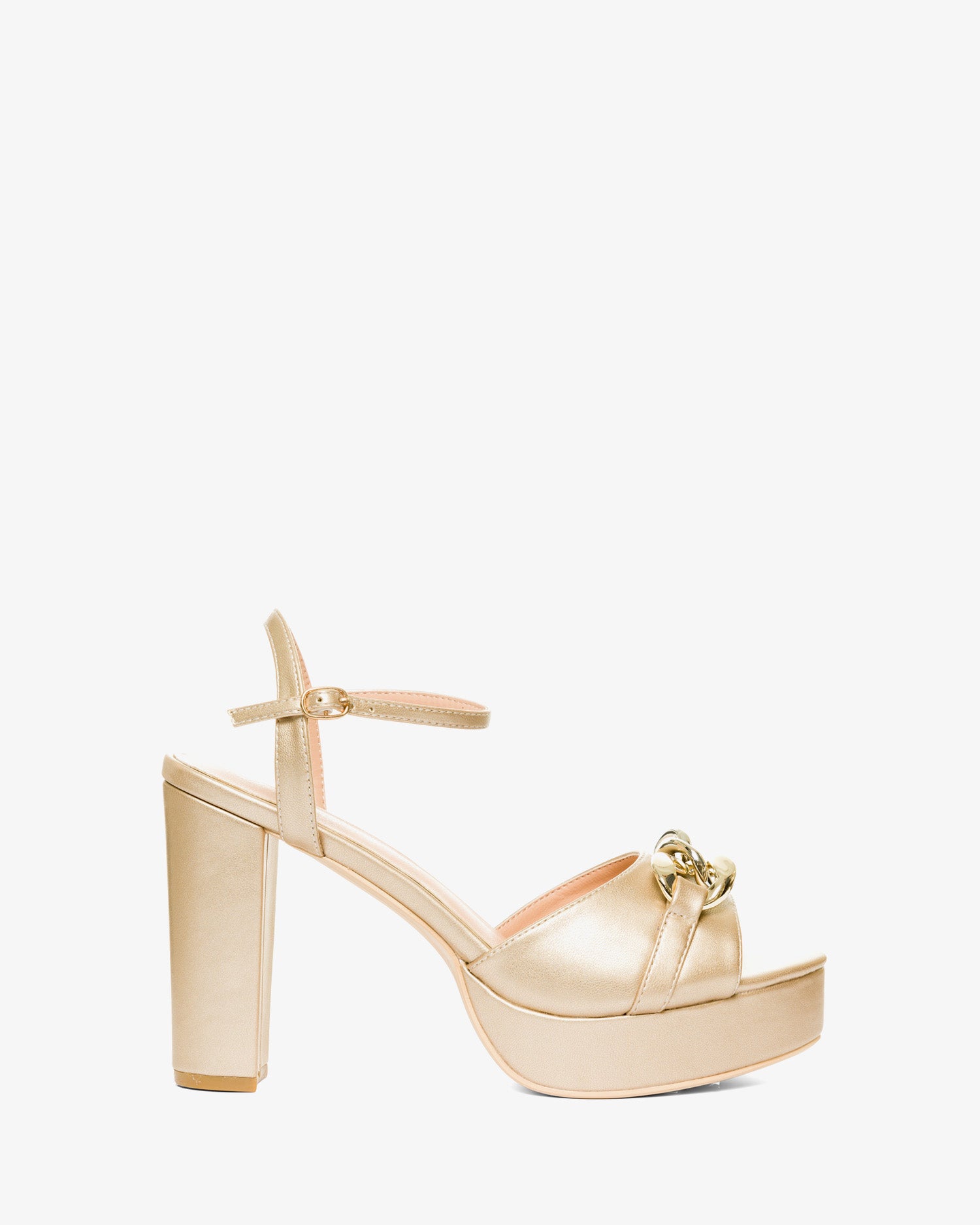 Gold faux leather heeled sandals. Slingback design with wide strap and chain link detail over the vamp. Matching buckled strap closure around the ankle. Round and open toe box. Heel of 4,33"/11cm and platform of 1,18"/3cm for small sizes from 32 to 35 EU. Heel of 4,72"/12cm and platform of 1,18"/3cm for large sizes from 42 to 45 EU.