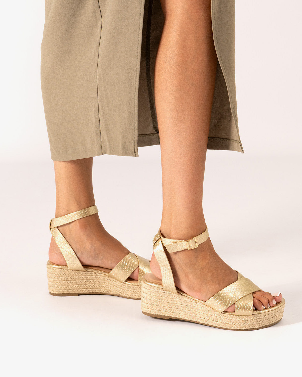 Gold sandals in soft coco material and jude wedge