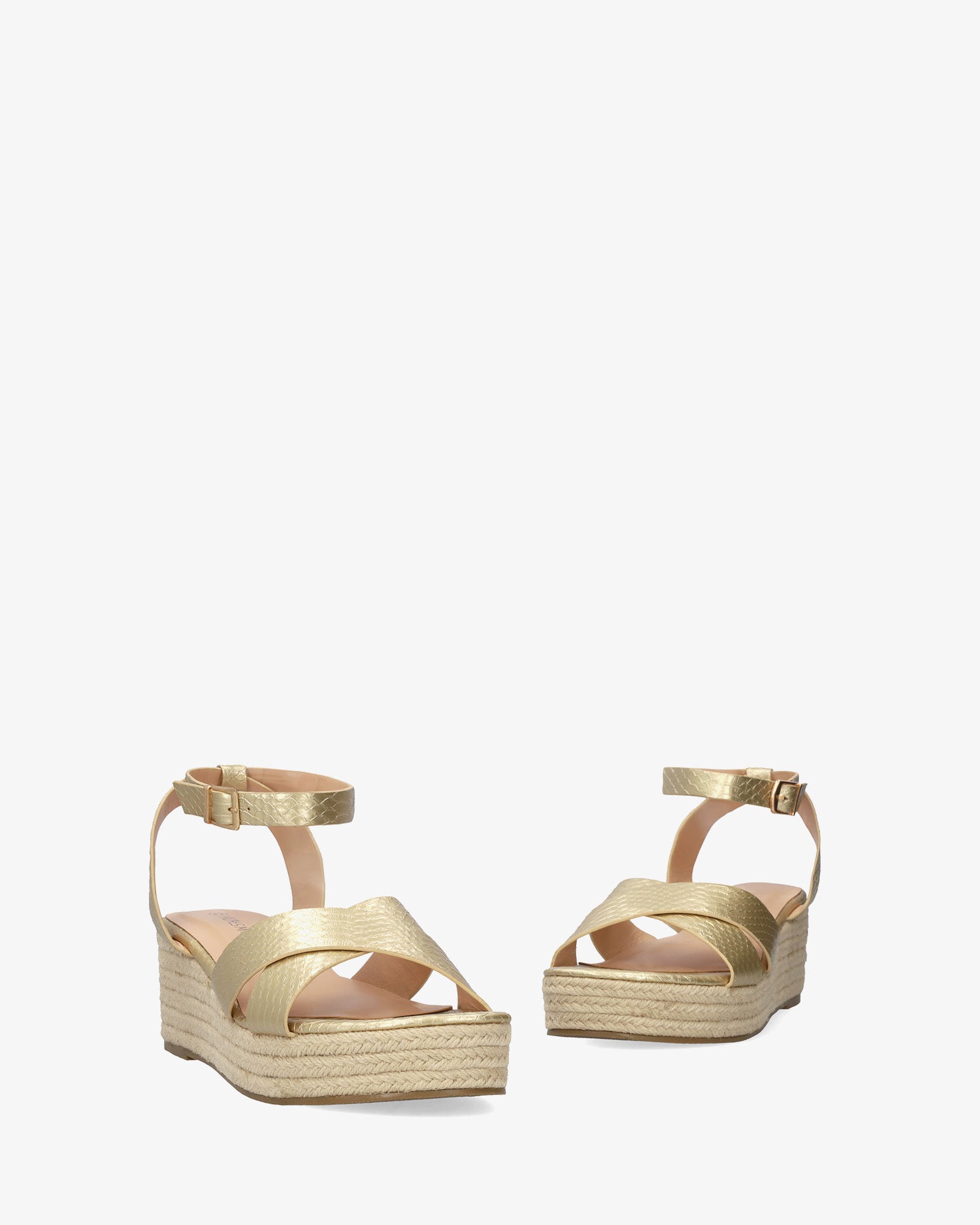 Gold coloured sandals in soft coco material and jude wedge. The design features two wide crisscross straps in matching tone at the front. Metallic buckle closure with adjustable back strap for better ankle support. Open, rounded toe. Wedges and front platform in jute. Wedge height 6 cm / 2.362 inch and platform 3 cm / 1.181 inch for small sizes 32 to 35. Wedge height 6,5 cm / 2.559 inch and platform 3 cm / 1.181 inch for large sizes 42 to 46.