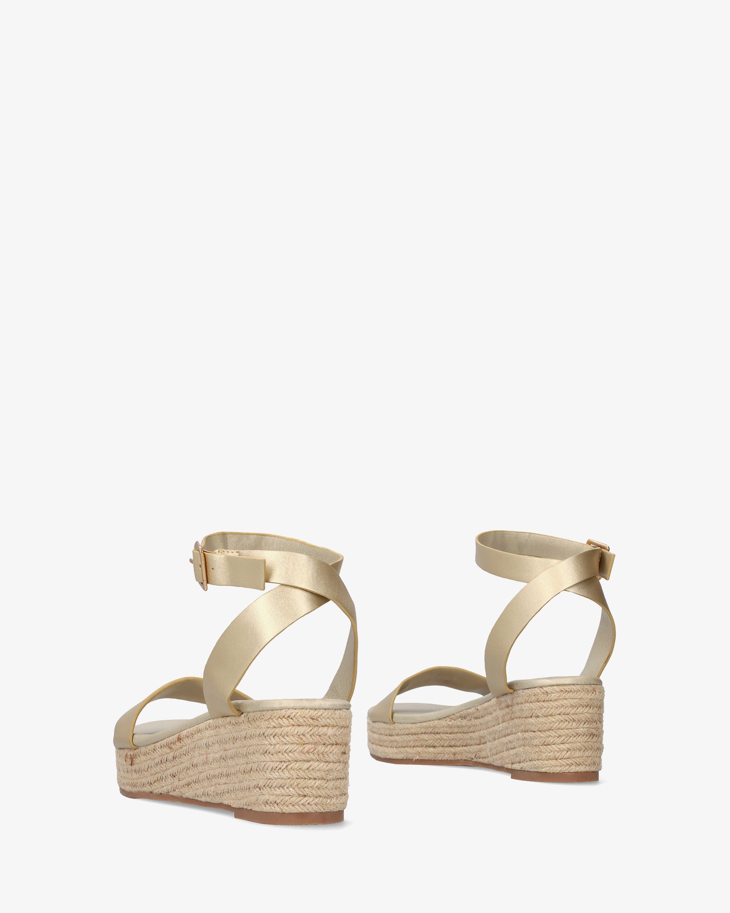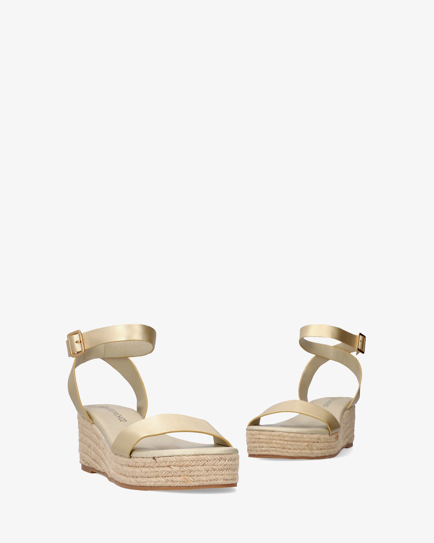 Gold soft sandals with a jute wedge. Backless design with a wide front strap. Metallic buckle closure with a strap in the same tone around the ankle. Open toe. Wedges and front platform in jute. Wedge measures 2,56", and the platform measures 1,18" for small sizes from 32 to 35. Wedge measures 2,56", and the platform measures 1,18" for large sizes from 42 to 45.