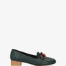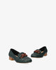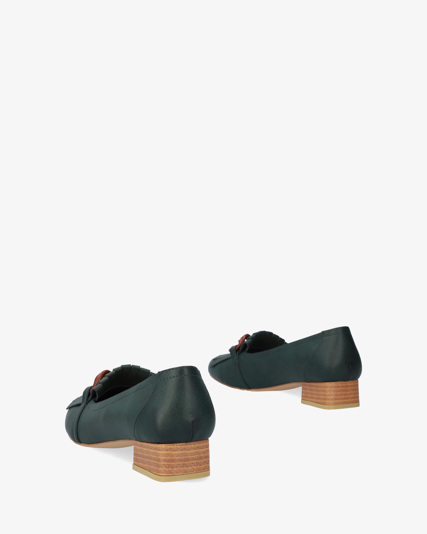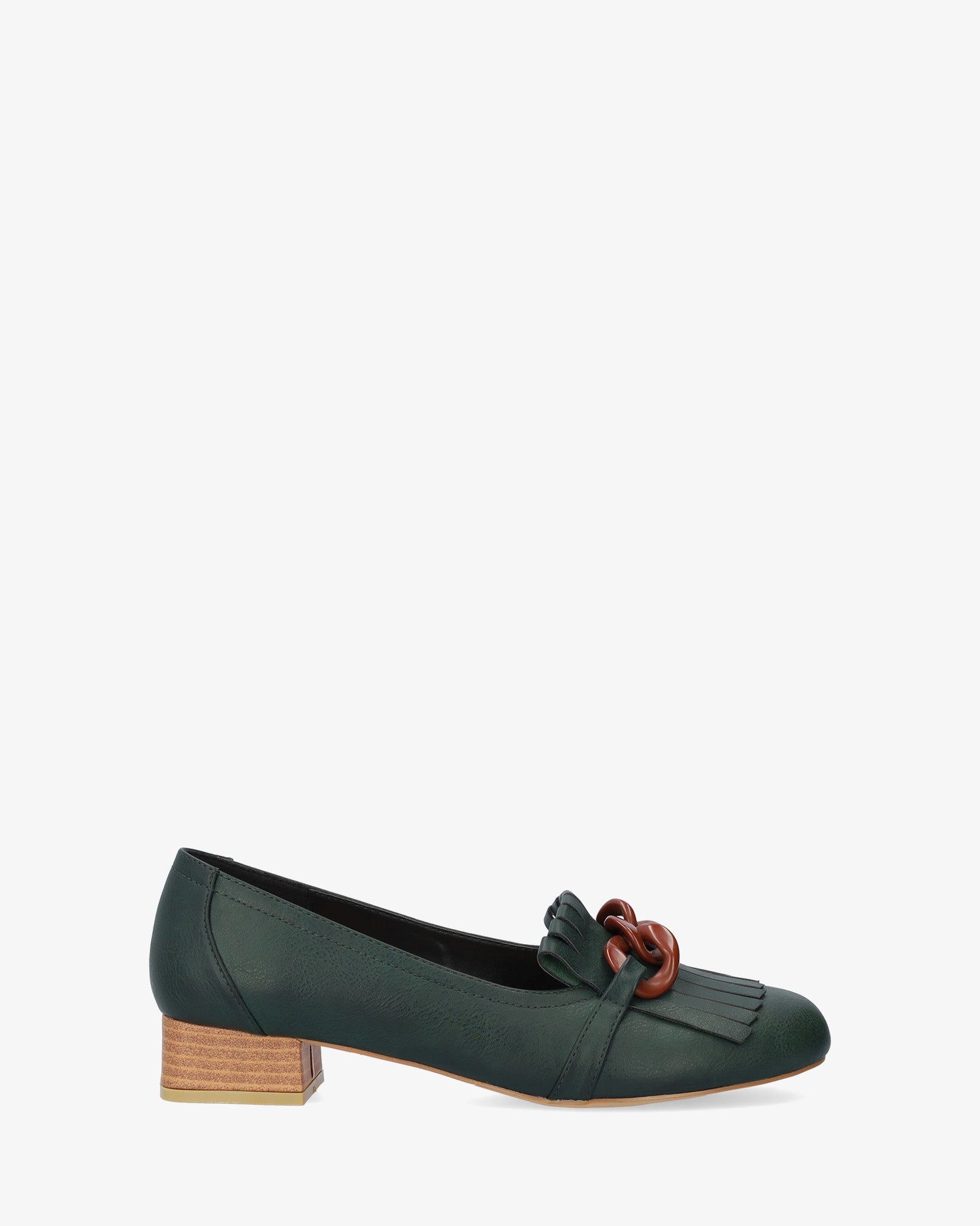 Green embossed faux leather shoes. Matching fringes detail on the vamp with a chocolate coloured linked chain. Tone-on-tone stitching over the heel. Finished with a rounded toe. The laminated wooden effect heel is 1,36" high for large sizes from 42 to 45 EU.