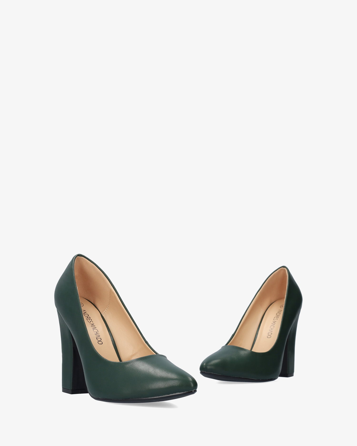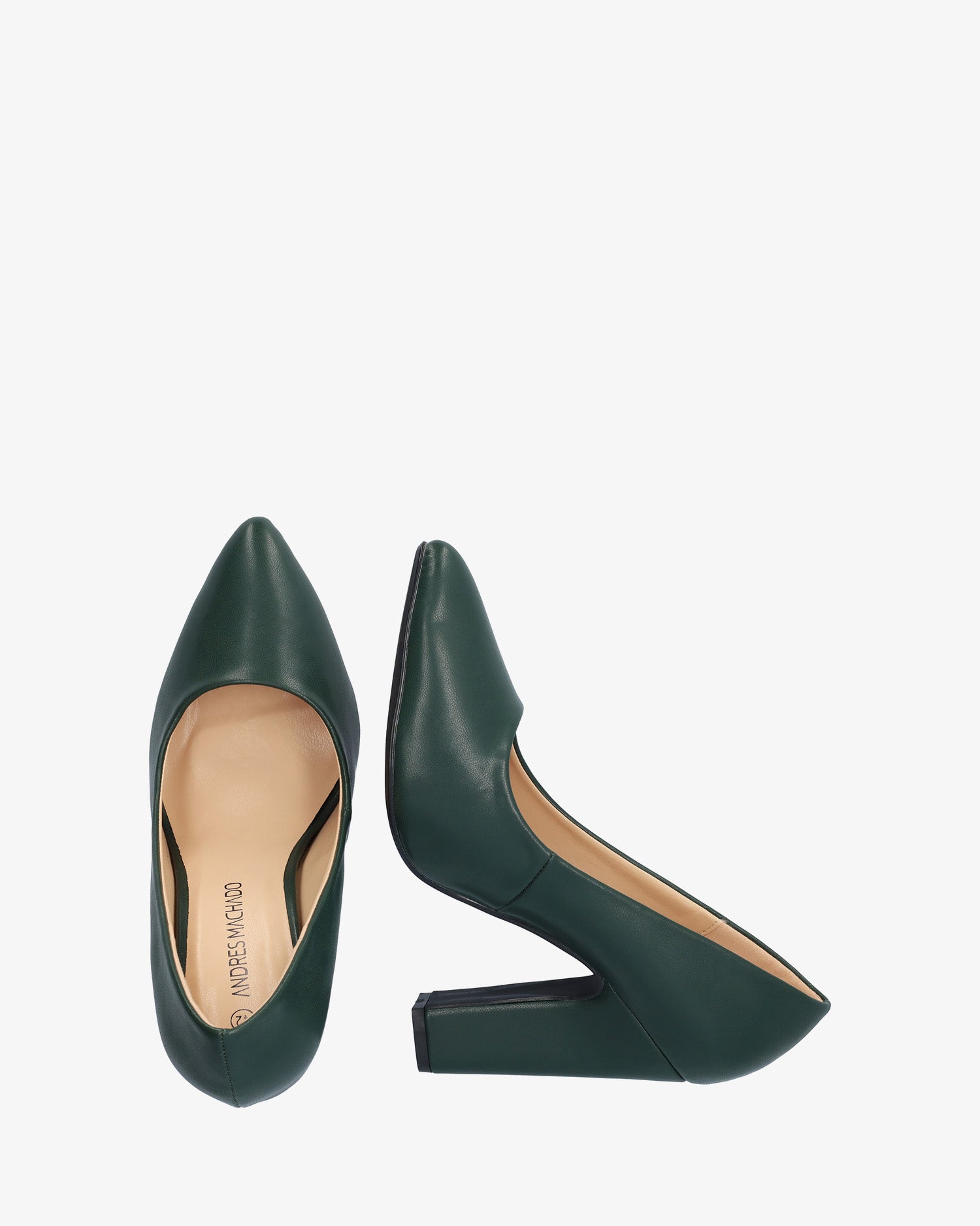 Classic pumps in green faux leather. Classic last and heel. Finished with a fine pointed toe. Square heel lined in tone 9,5 cm high for small sizes from 32 to 35. Heel 11 cm high for large sizes from 42 to 45. This model fits small, we recommend taking one size larger than usual.