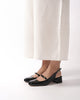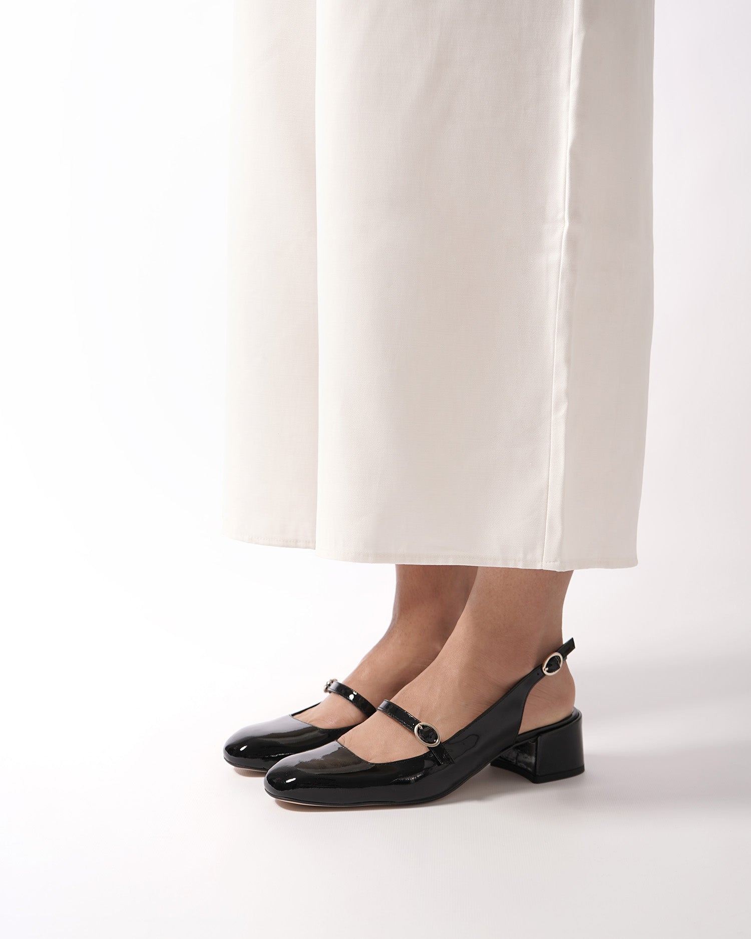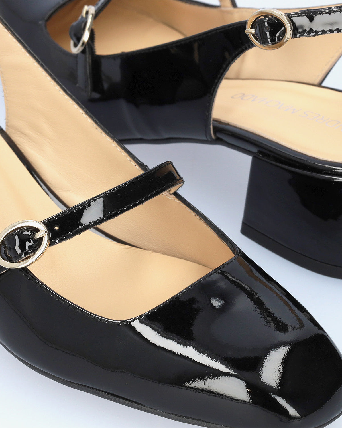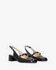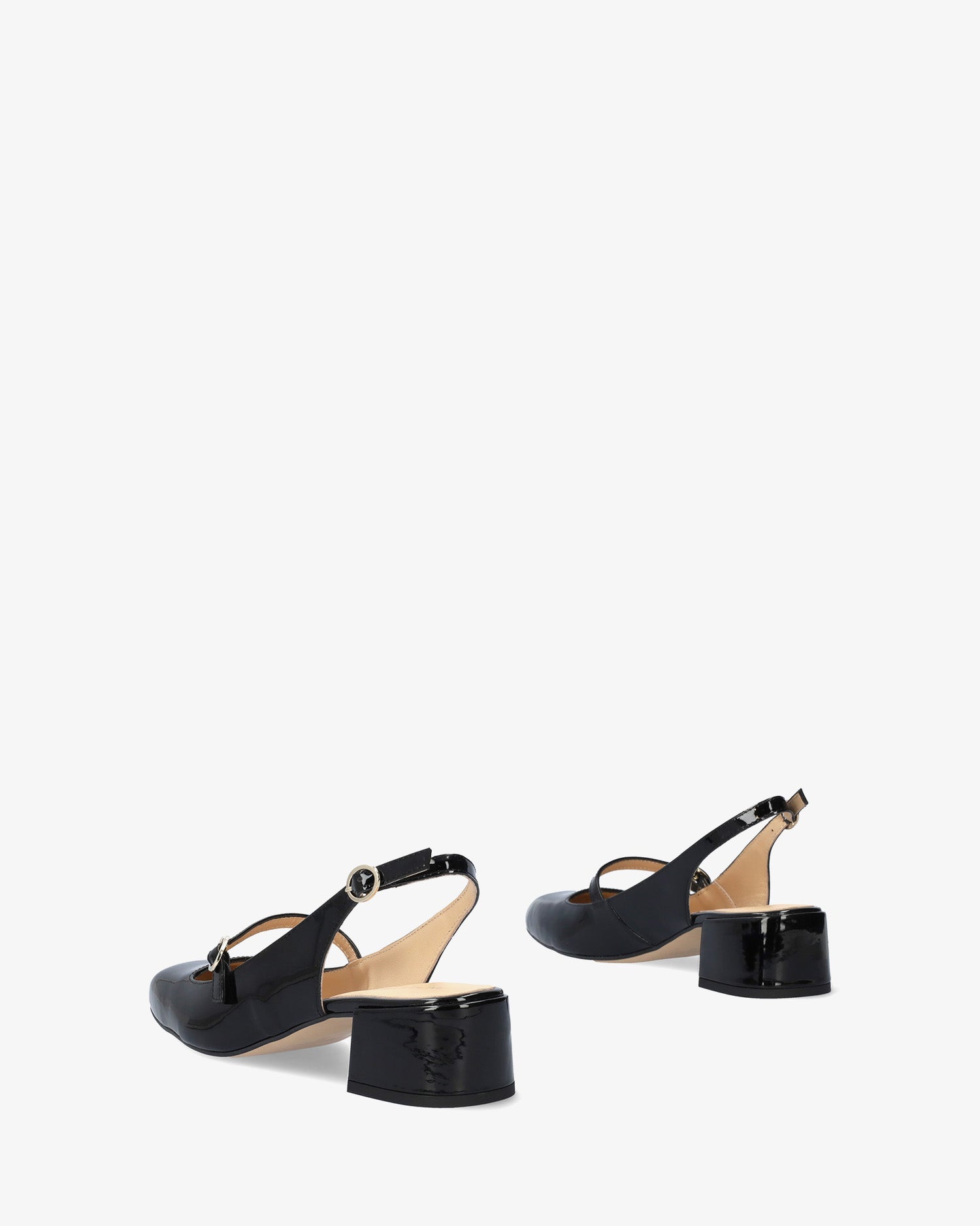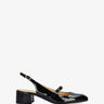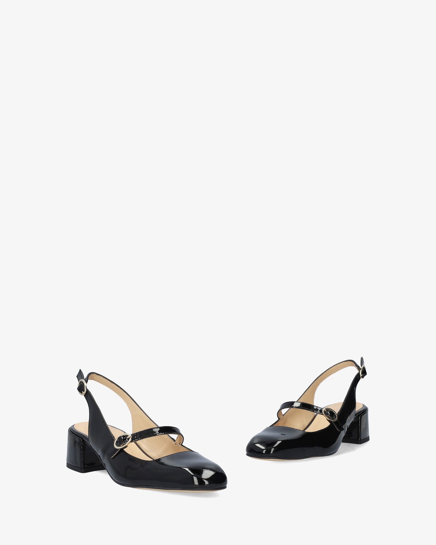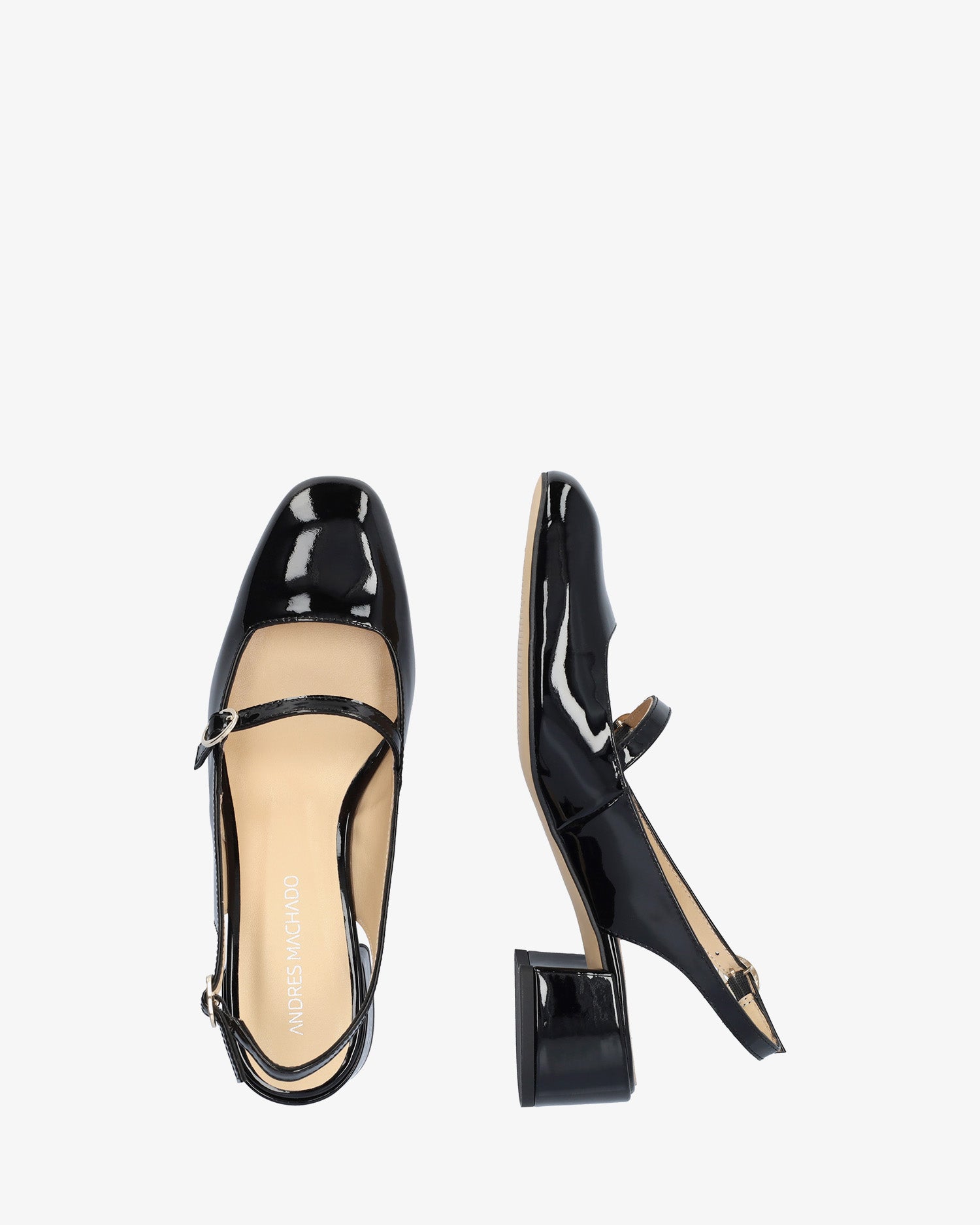 This heeled slingback Mary Janes in black patent leather, feature a rounded toe with a metallick buckled strap over the instep. Beige leather inner lining. The squared matching lined heel measures 1,96" for small sizes from 32 to 35 and 2,16" for large sizes from 42 to 45. Made in Spain.