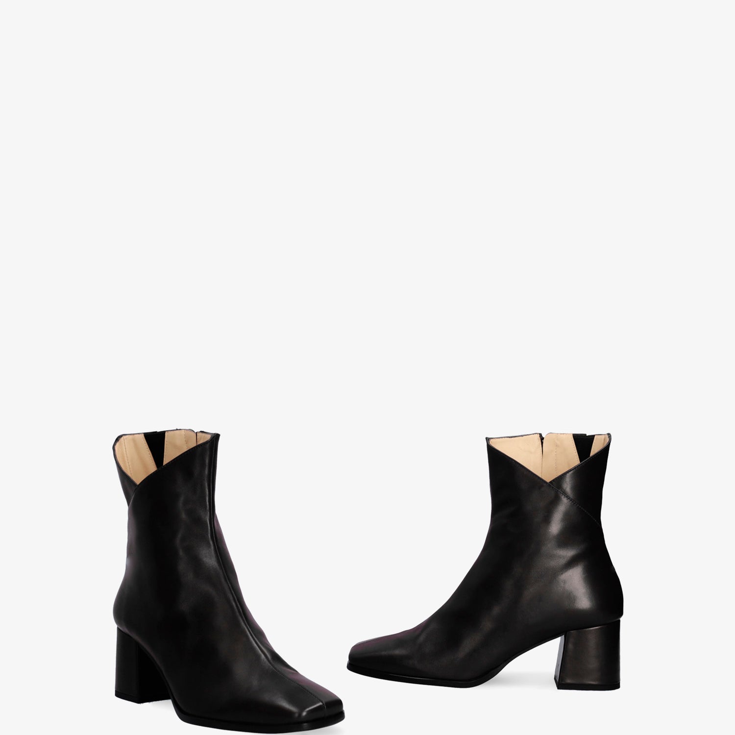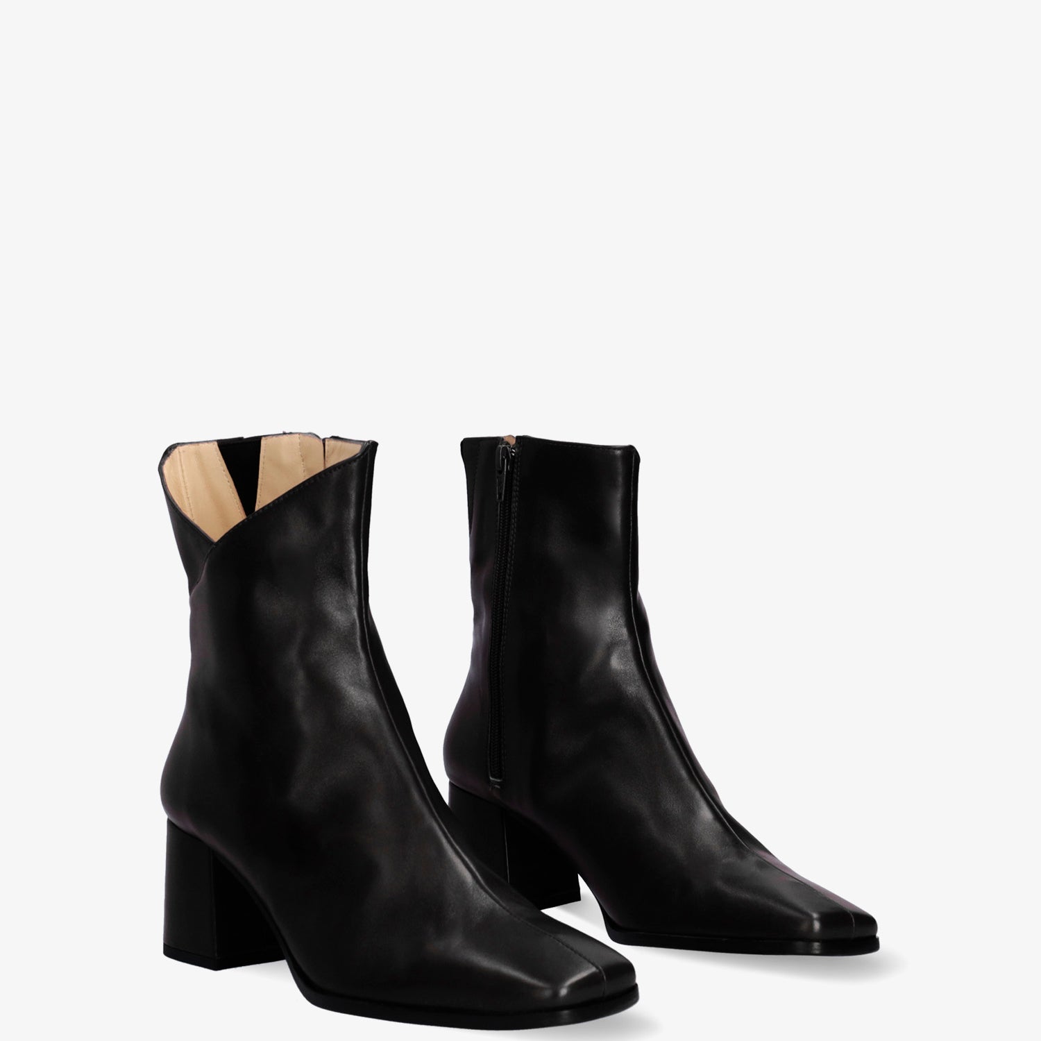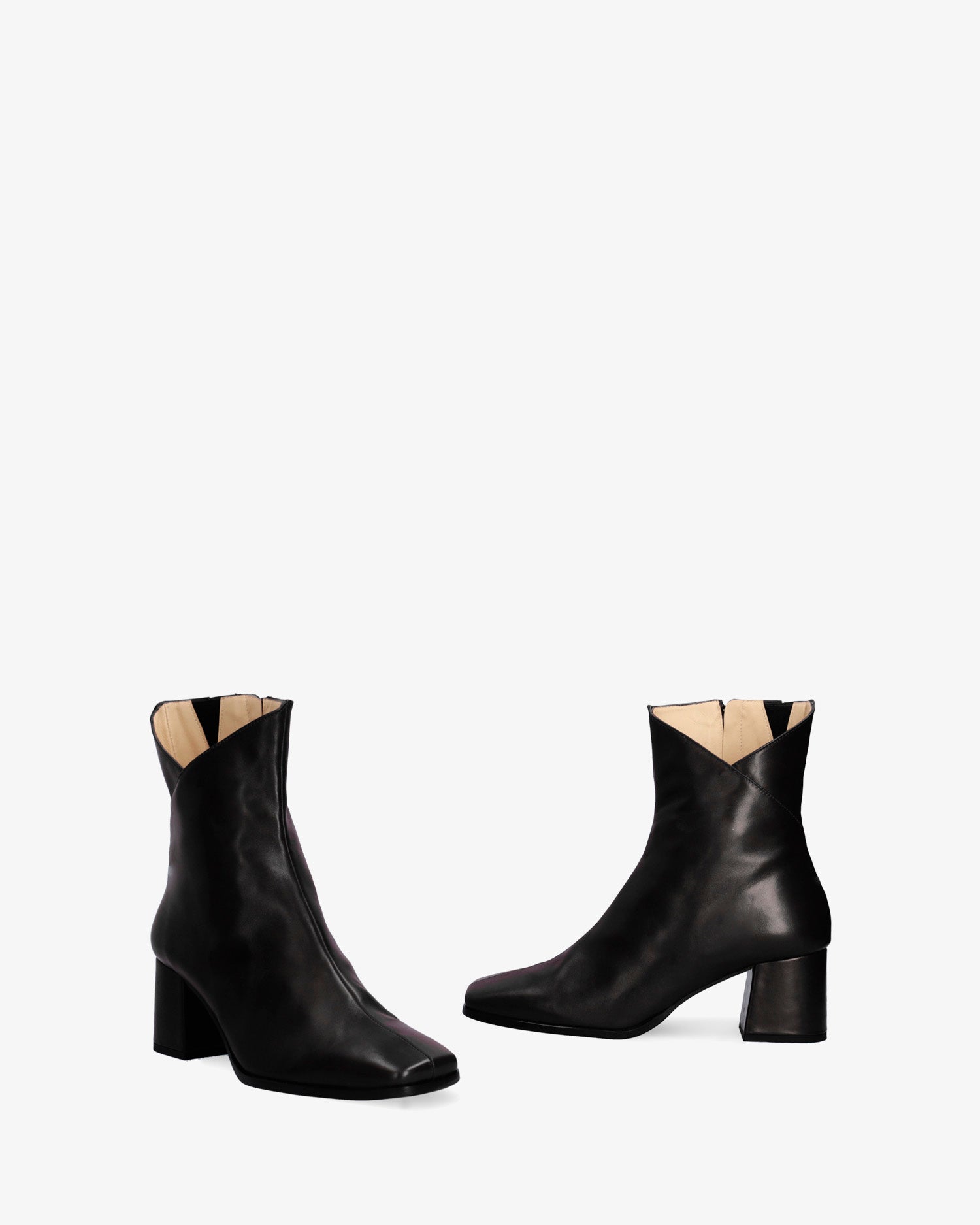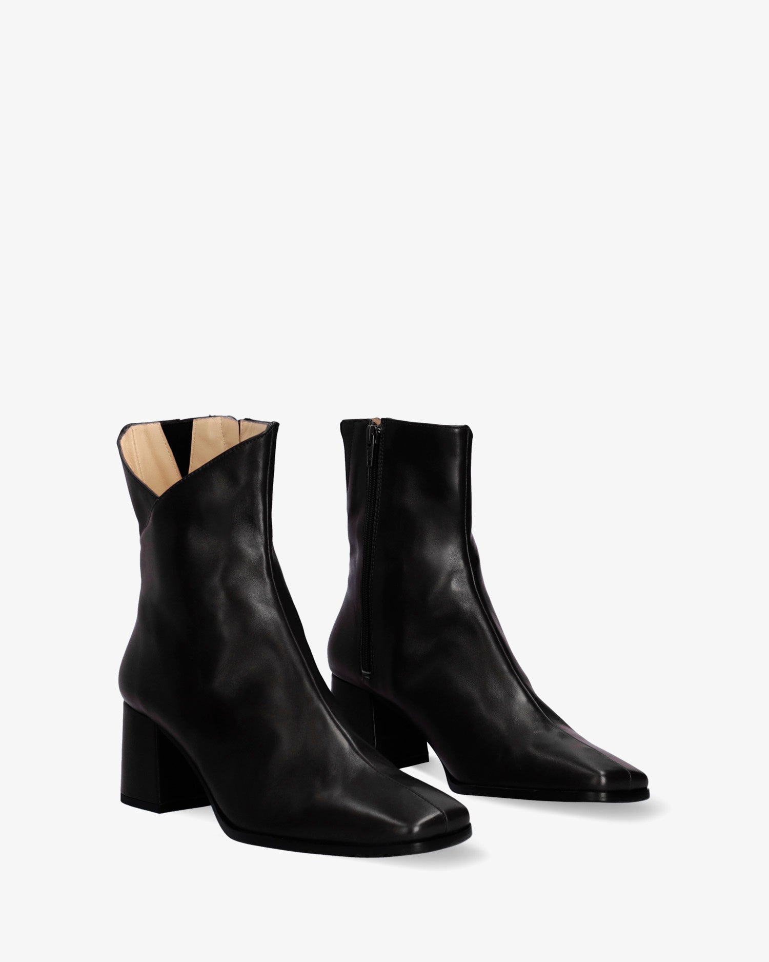 Black leather booties with stitching from the toe box to the upper edge of the shaft. V-shaped cut out detail on the external face of the shaft. Matching zipper closure. Beige leather inner lining. Finished in a square toe. The wide heel, lined in matching leather, is 6 cm / 2.36`` high for small sizes from 32 to 35 EU, 6 cm / 2.36`` high for medium sizes from 36 to 41 EU and 6.5 cm / 2.55`` high for large sizes from 42 to 45 EU. Made in Spain.