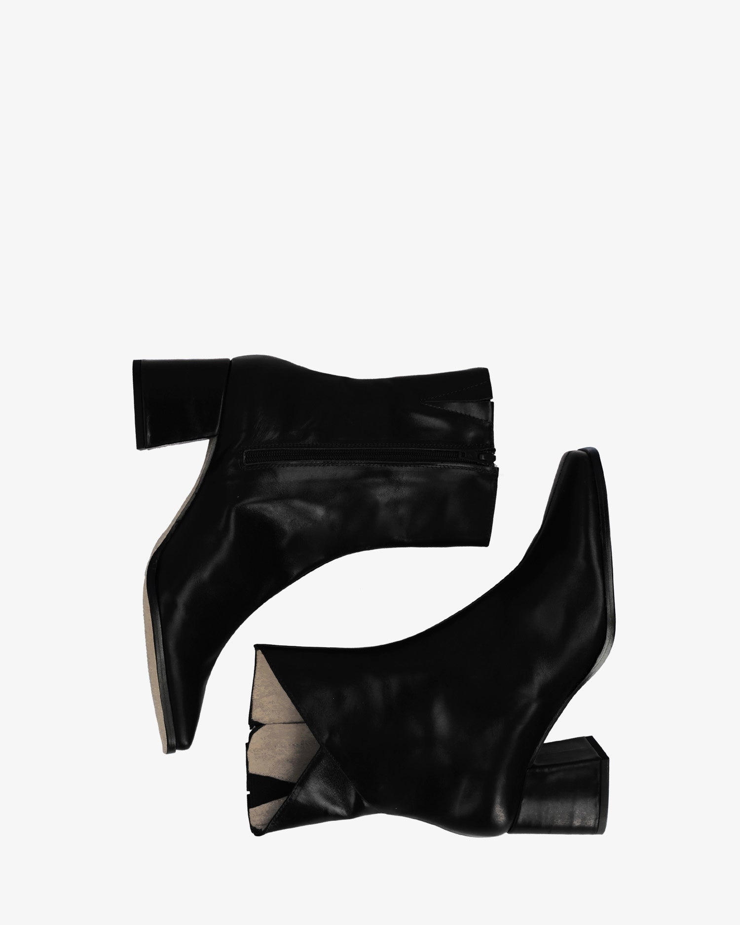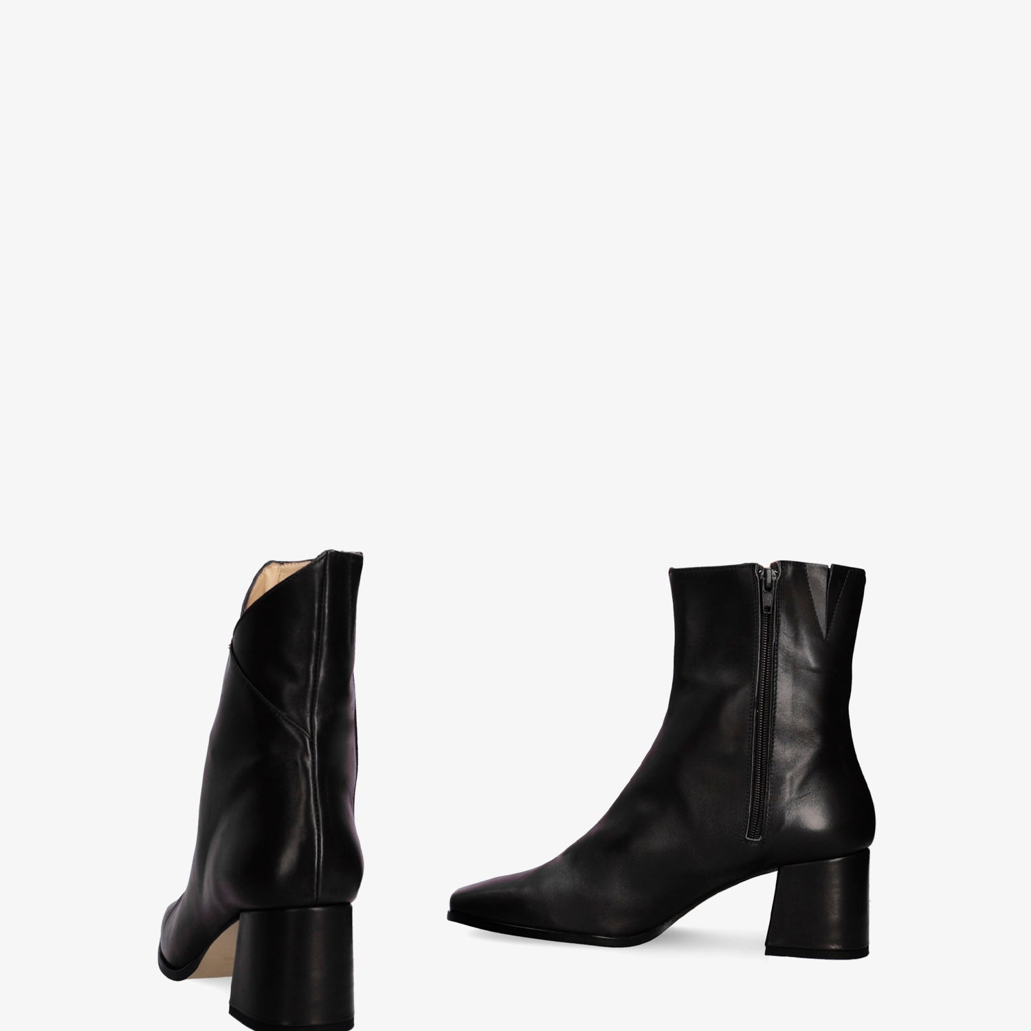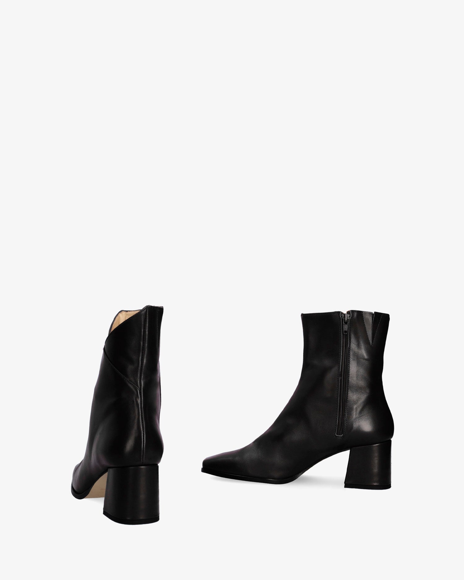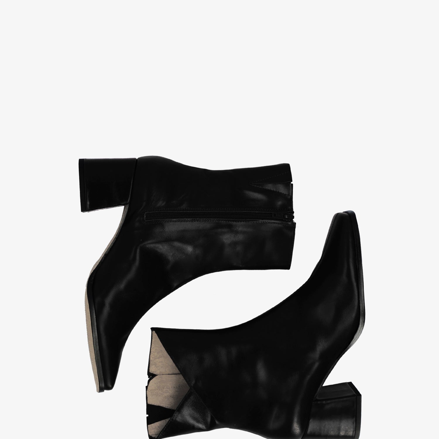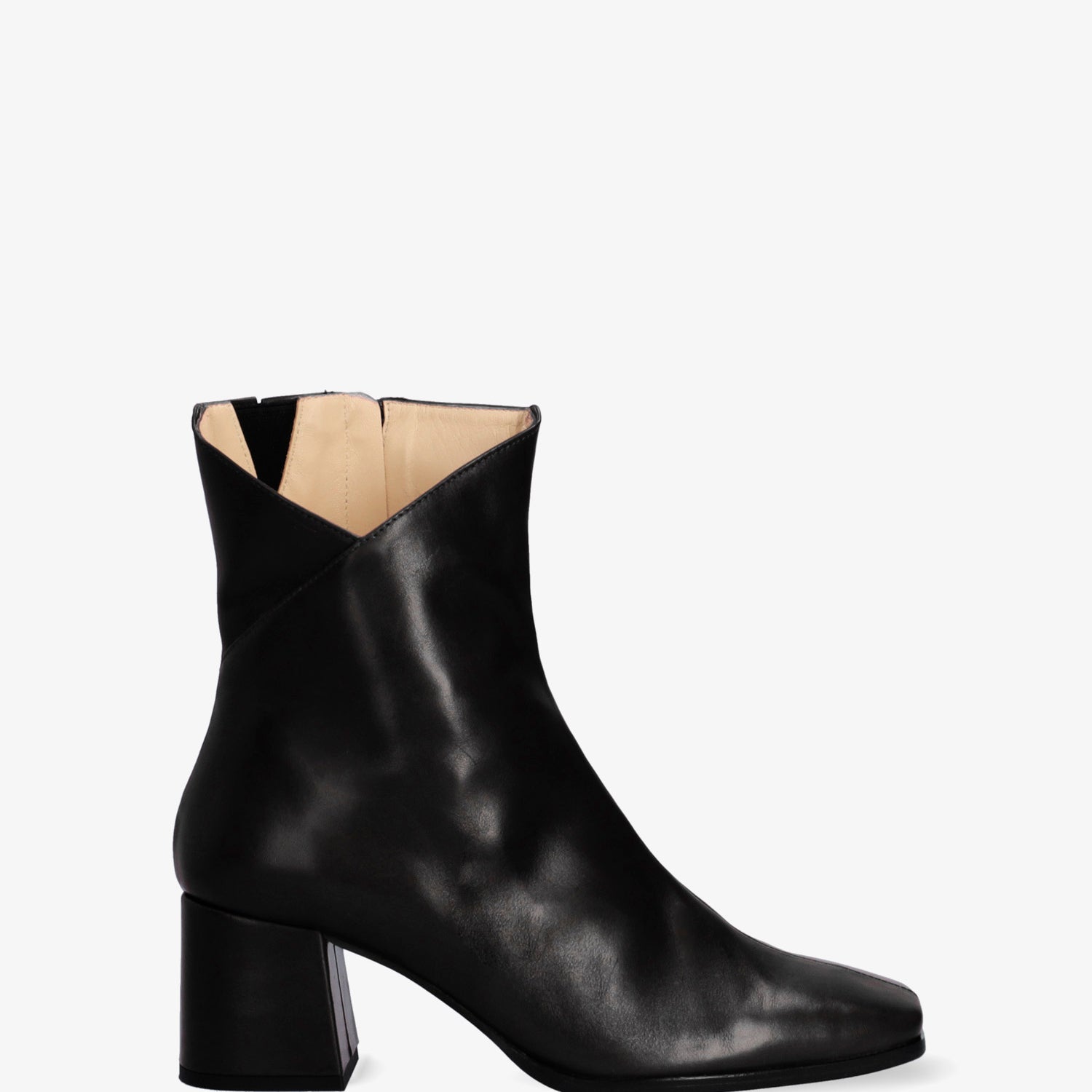 Black leather booties with stitching from the toe box to the upper edge of the shaft. V-shaped cut out detail on the external face of the shaft. Matching zipper closure. Beige leather inner lining. Finished in a square toe. The wide heel, lined in matching leather, is 6 cm / 2.36`` high for small sizes from 32 to 35 EU, 6 cm / 2.36`` high for medium sizes from 36 to 41 EU and 6.5 cm / 2.55`` high for large sizes from 42 to 45 EU. Made in Spain.