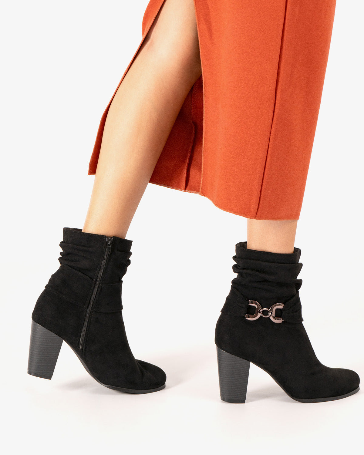 Black faux suede ankle boots with tone-on-tone zip fastening on the inside. Wide strap around the ankle with silver buckle on the outer side and crinkled shaft detail around the ankle. Finished with a round toe. 7,5cm / 2,95" square heel for small sizes 32 to 35. 10cm / 3,93" heel for large sizes 42 to 45.