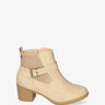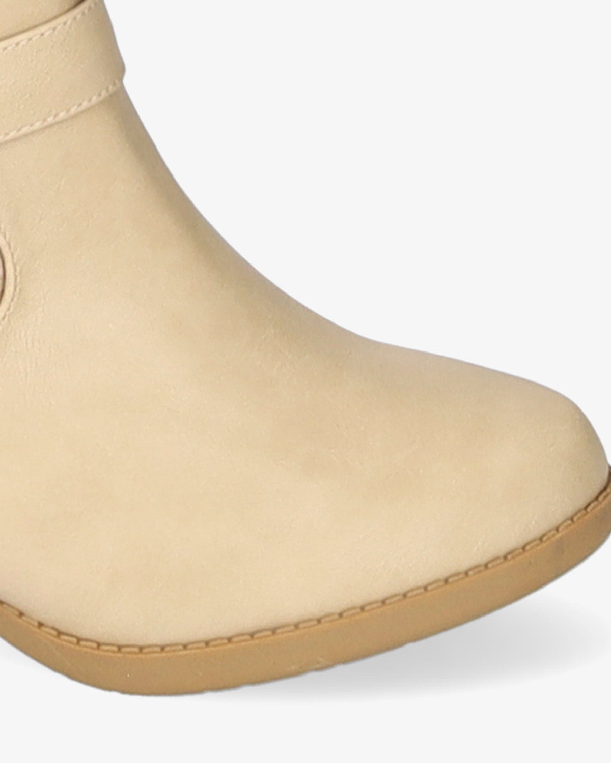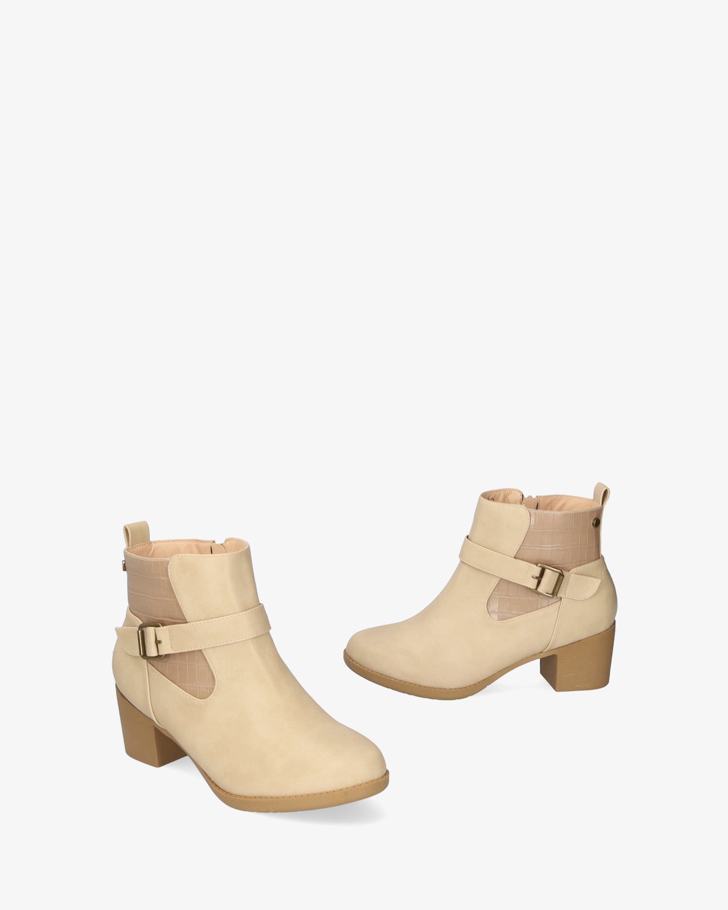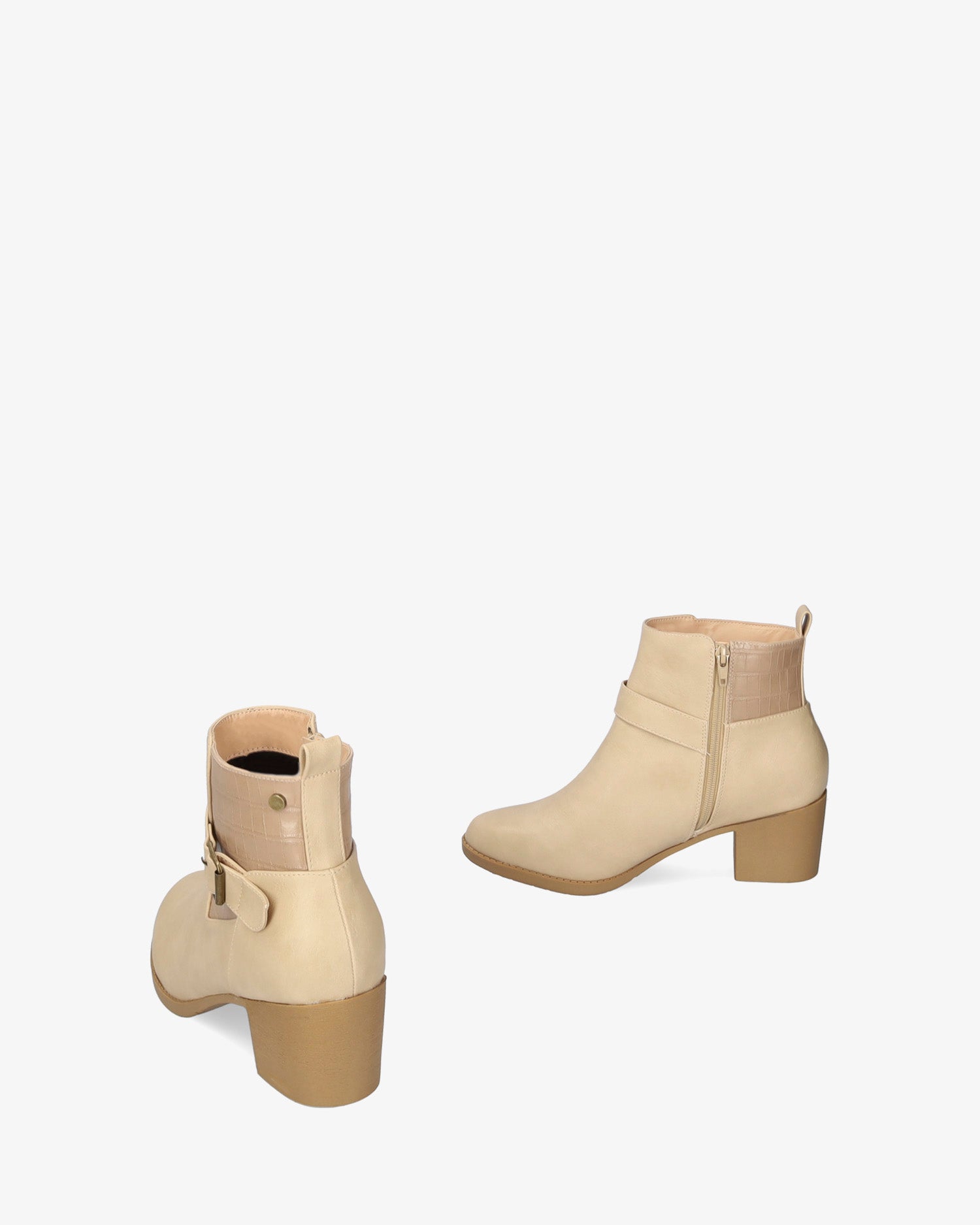 Heeled booties in off-white colored faux leather. Matching croc textile detail on the shaft and buckled strap closure around the ankle. Matching heel loop and zipper closure on the internal side of the shaft. Almond shaped toe box. The wide crepe heel is 4.5 cm / 11.43`` high for small sizes and 6 cm / 2.36`` high for large sizes from 42 to 45 EU.