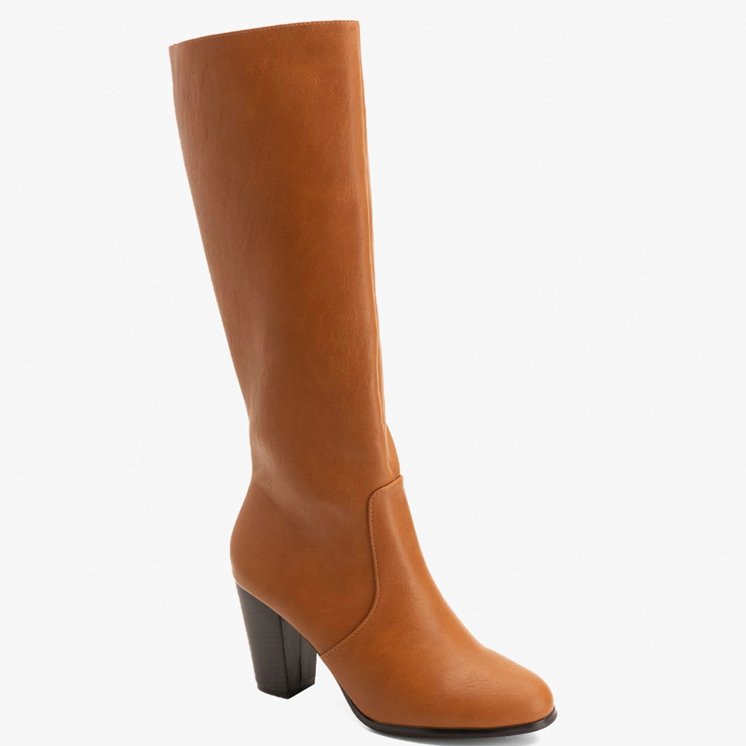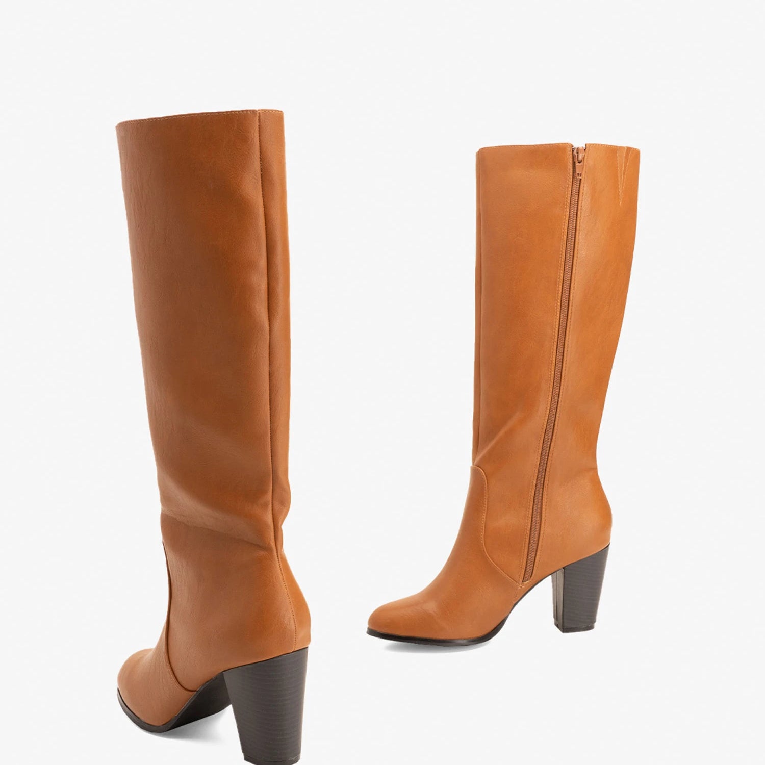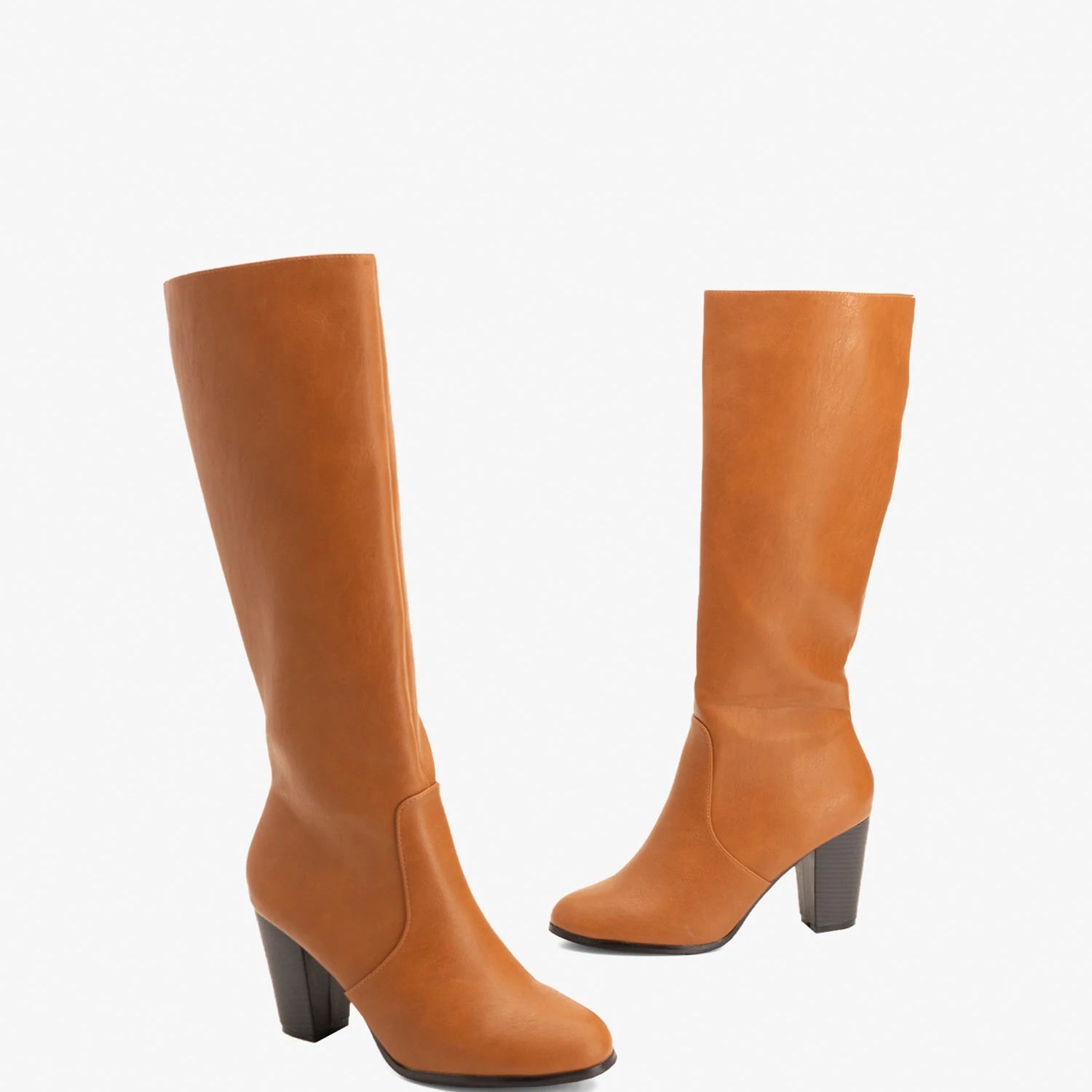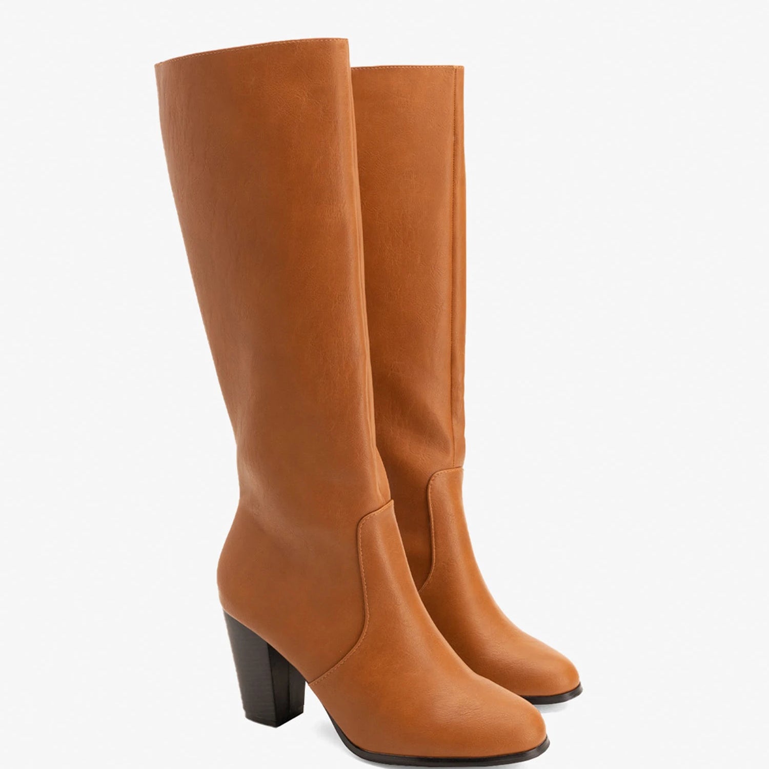 High boot in Camel colored faux leather. Matching straps around the ankle with decorative buckles. Matching Zip closure on the inside. Wide wood effect 1.77 inch / 4,5 cm high heel for small sizes from UK 0.5 to 3 / EU 32 to 35 and 2.36 inch / 6,0 cm high for large sizes from UK 8 to 11 / EU 42 to 45. This model fits small, we recommend taking one size larger than usual. According to our customers' feedback this model has a narrower boot shaft than usual.