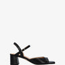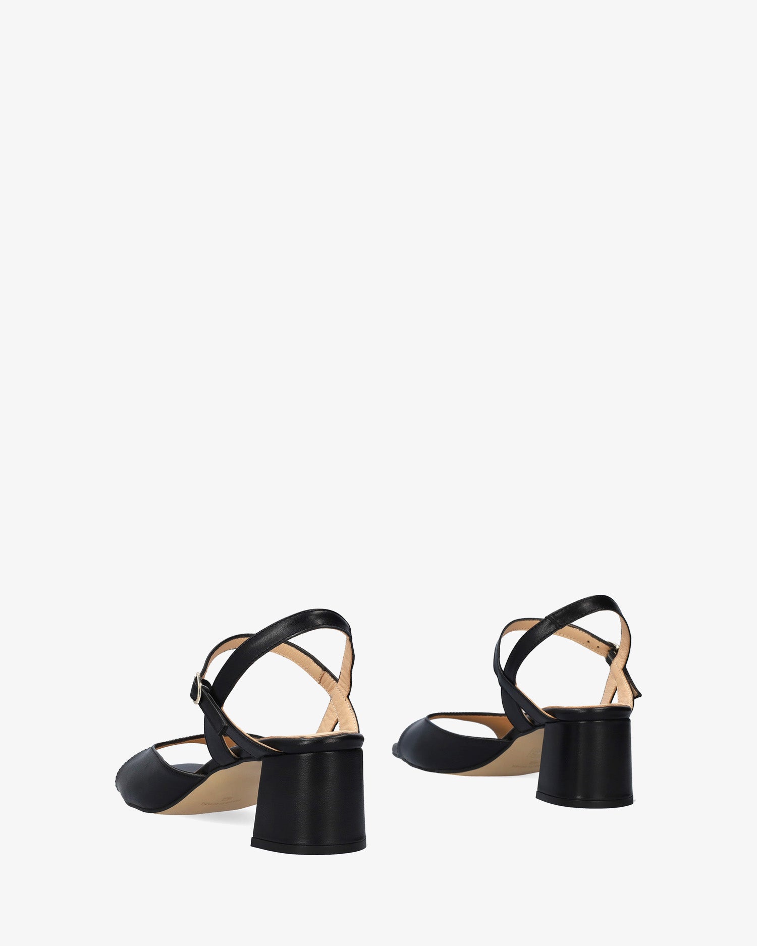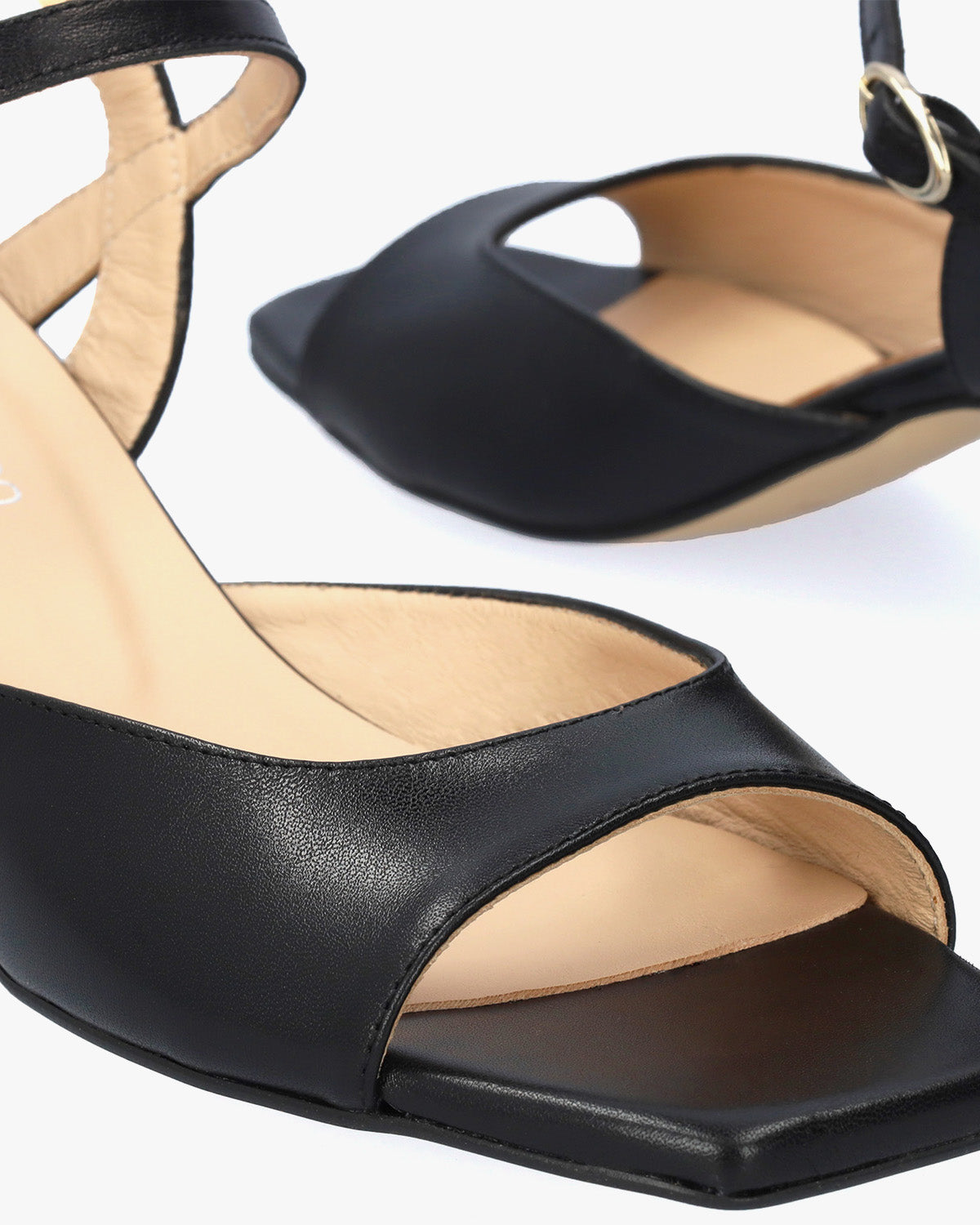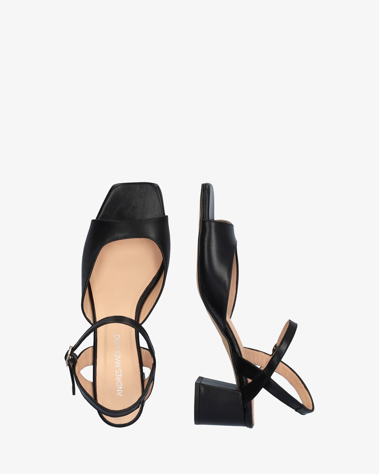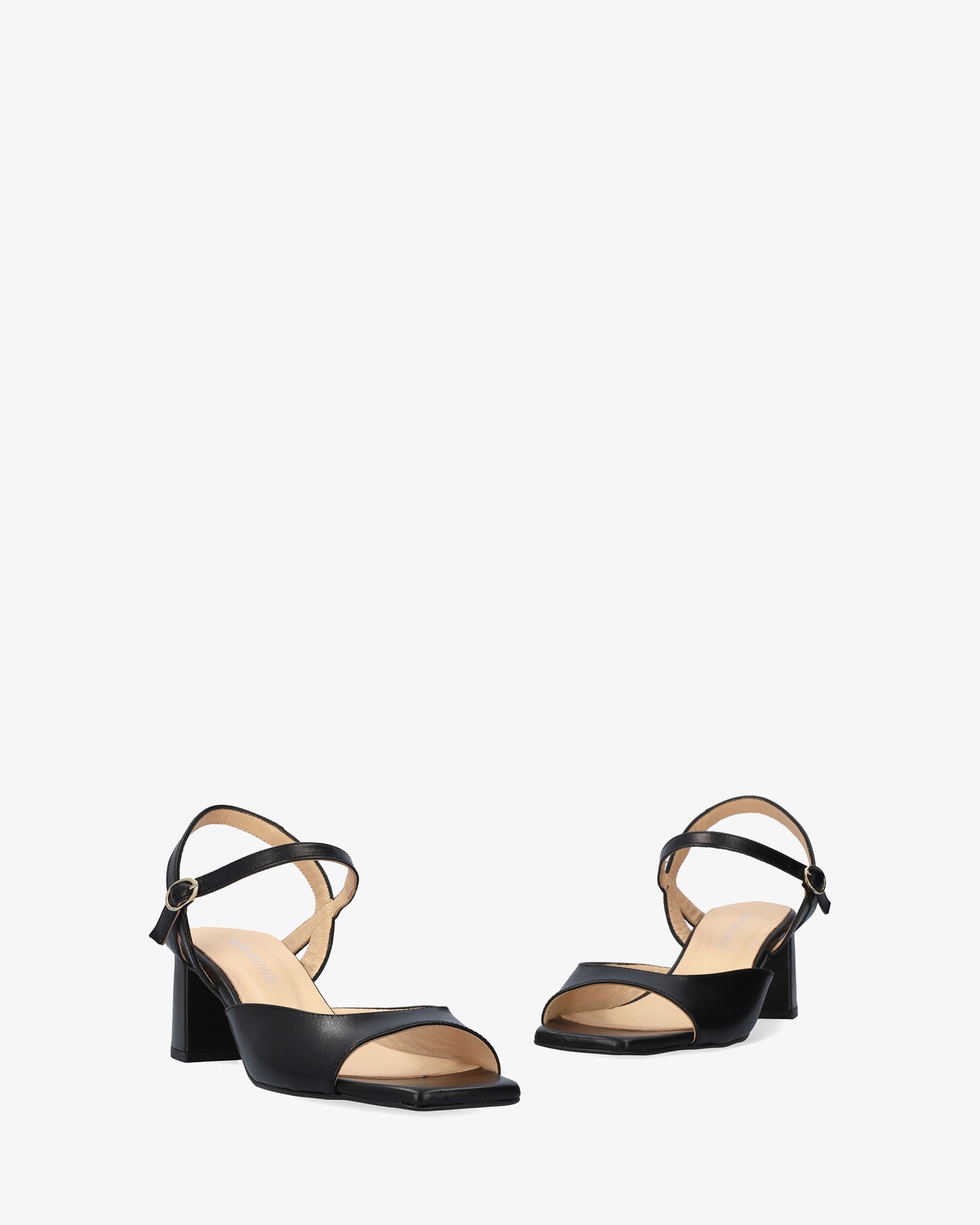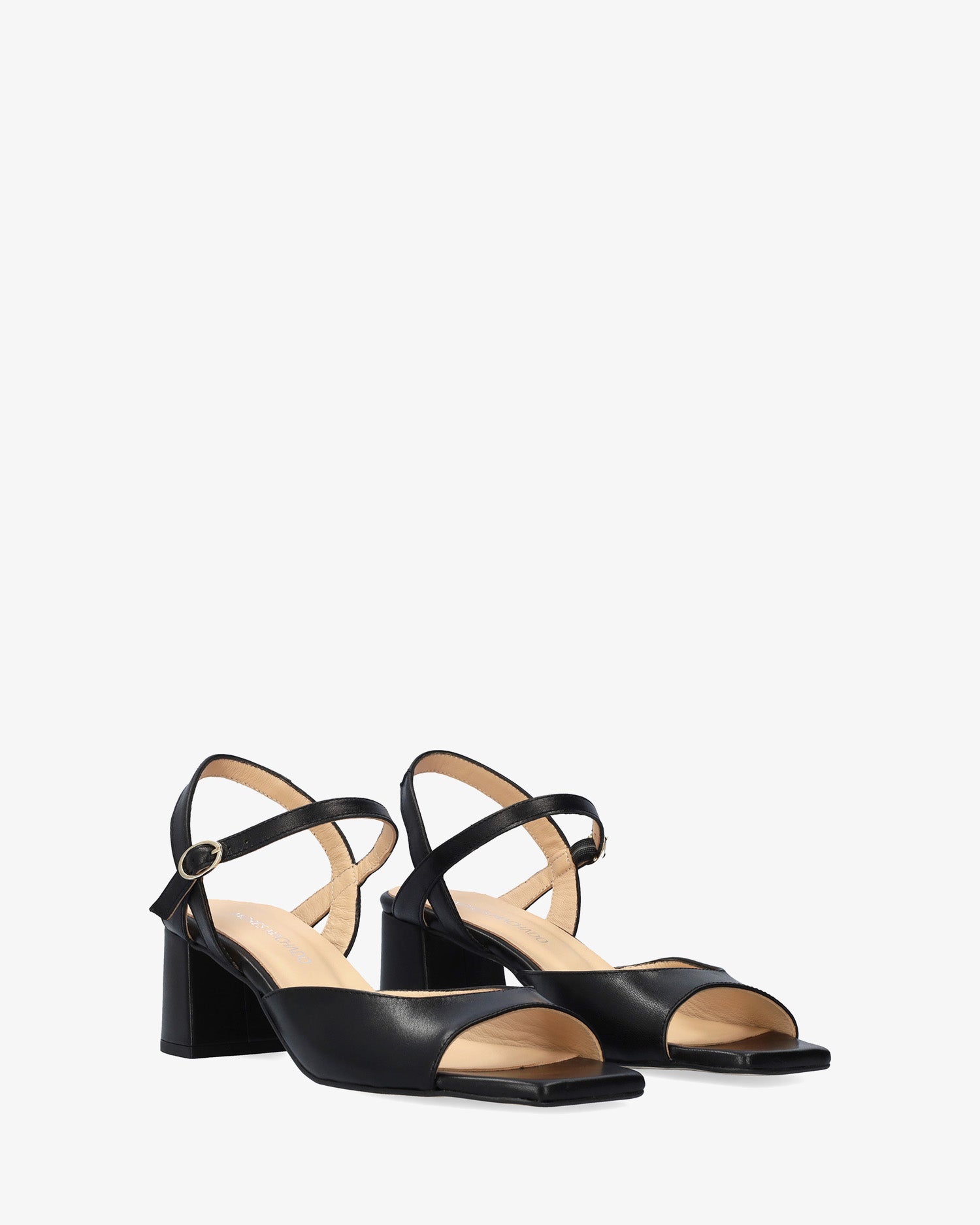 Heeled sandals in Black leather. Features a rounded heel and a front strap design. Secured with an ankle strap buckle fastening. Open square-toe finish. Beige leather lining. Covered heel measuring 1,968 inch for smaller sizes (32 to 35) and 2,165 inch for larger sizes (42 to 45). Made in Spain.