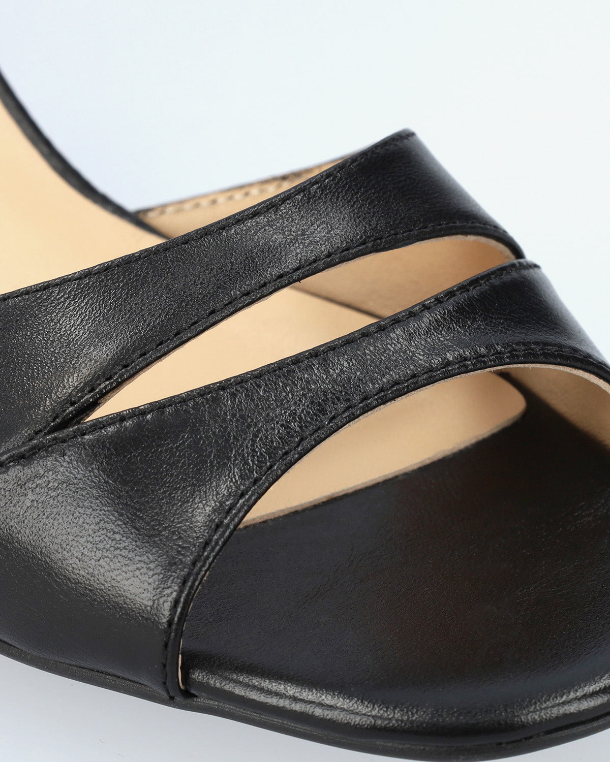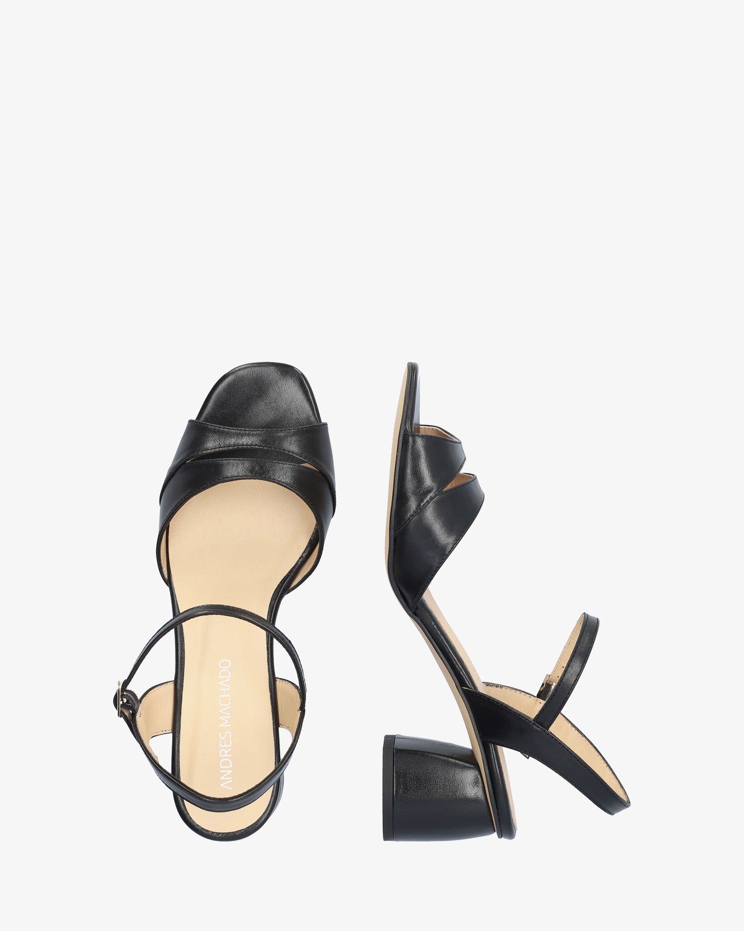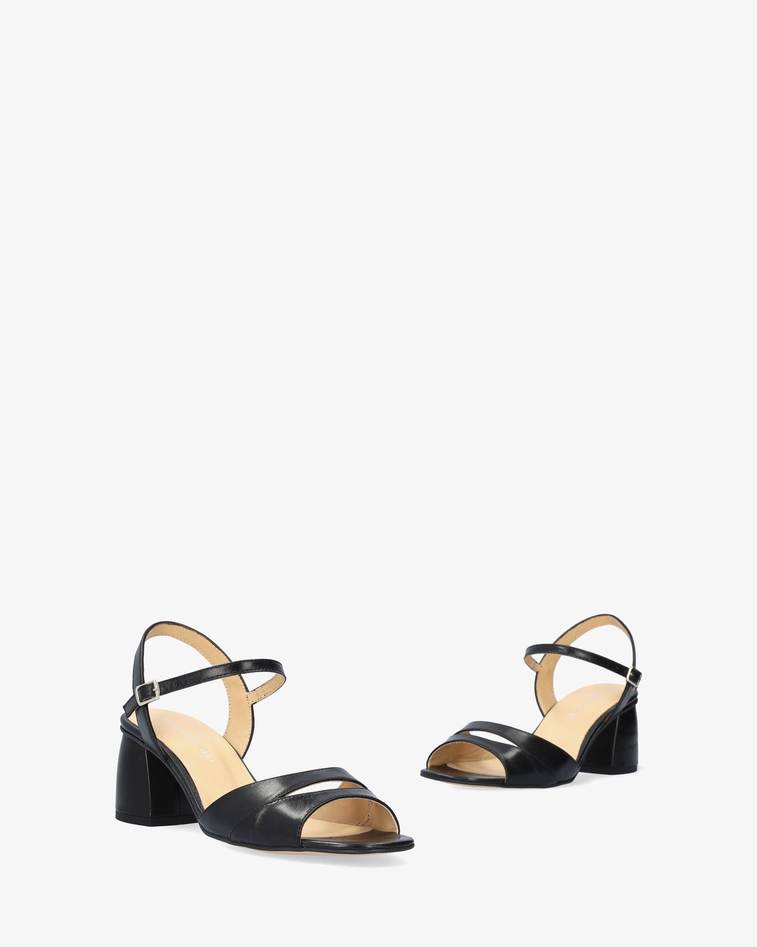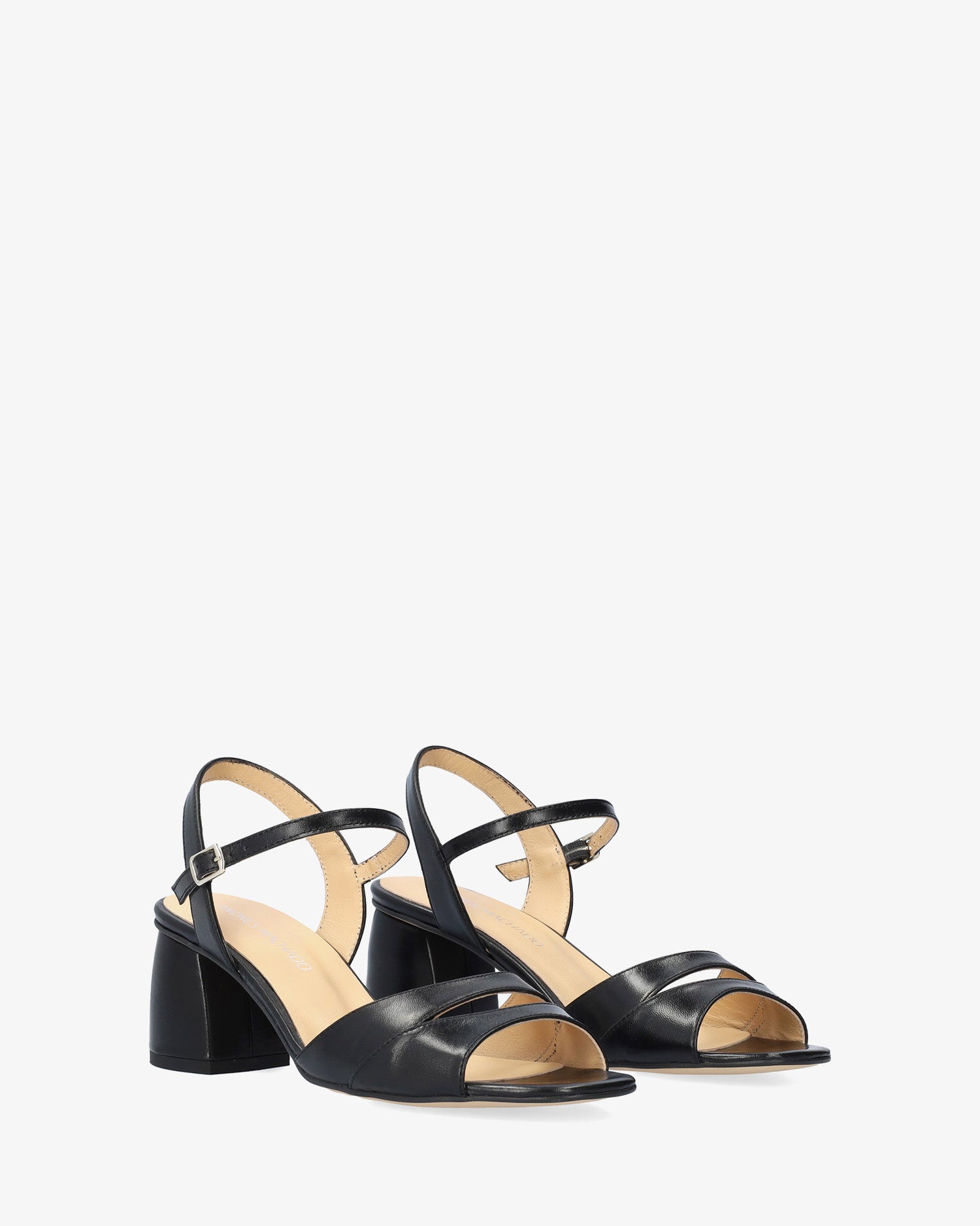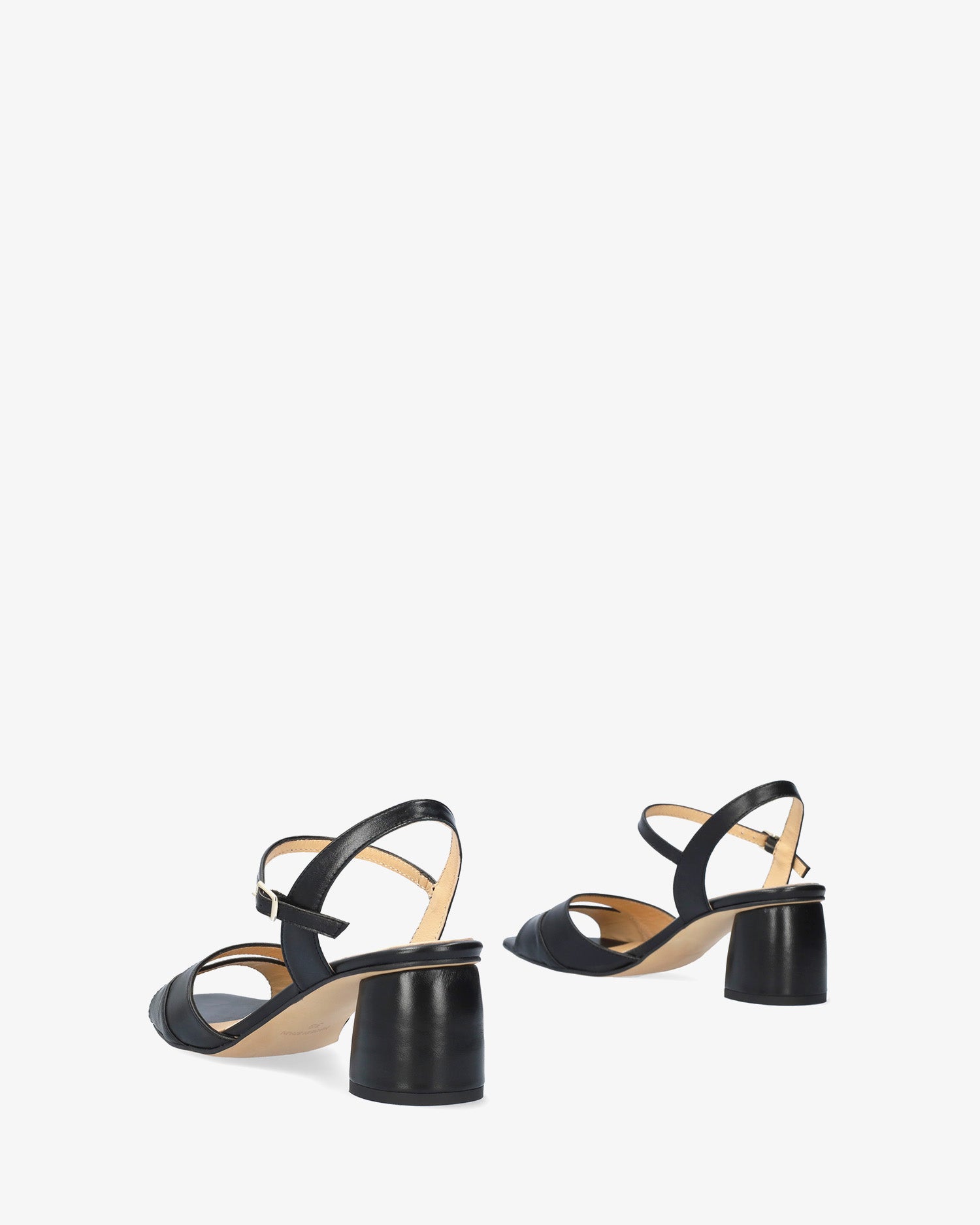 Heeled leather sandals in black colour. The round and opened toe features two thick straps with a central opening. The inner part is lined in beige-coloured leather and closes around the ankle with a metallic buckle. The rounded block heel is lined in a matching colour and it measures 2,55" for small sizes from 32 to 35 and 2,95" for large sizes from 42 to 45. Made in Spain.