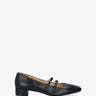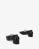 Leather black colour heeled shoes. The design features two fine straps over the instep finishing with a metallic buckle. Beige leather inner lining. Finished in a square-toe box. The tone on tone lined heel is 1,18" high for small sizes from 32 to 35 EU and 1,25" high for large sizes from 42 to 45 EU. Made in Spain.