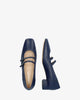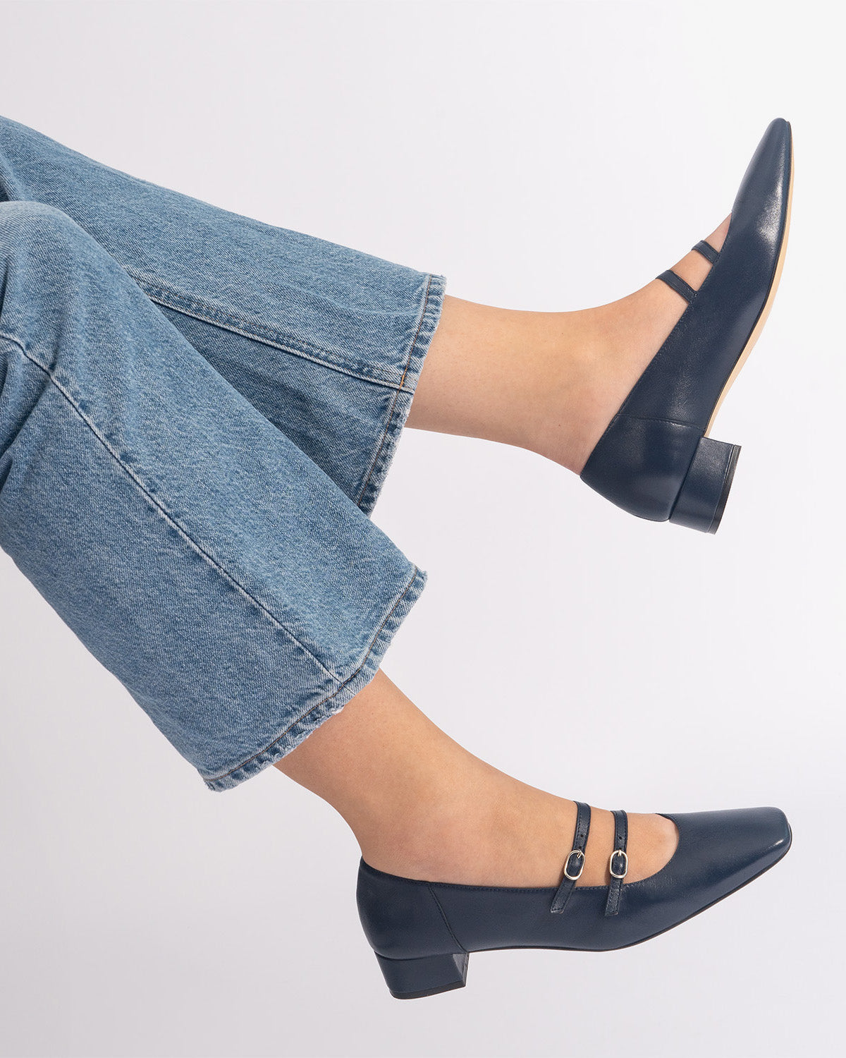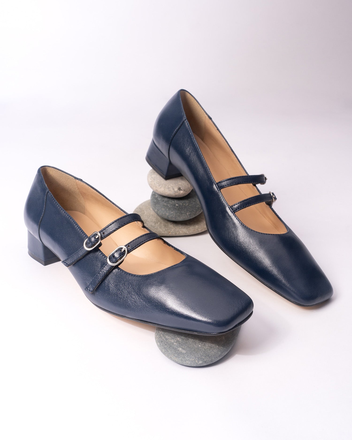 Leather navy colour heeled shoes. The design features two fine straps over the instep finishing with a metallic buckle. Beige leather inner lining. Finished in a square-toe box. The tone on tone lined heel is 1,18" high for small sizes from 32 to 35 EU and 1,25" high for large sizes from 42 to 45 EU. Made in Spain.