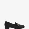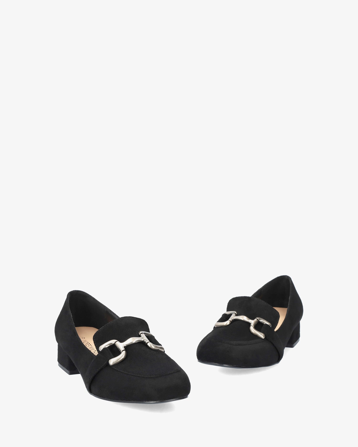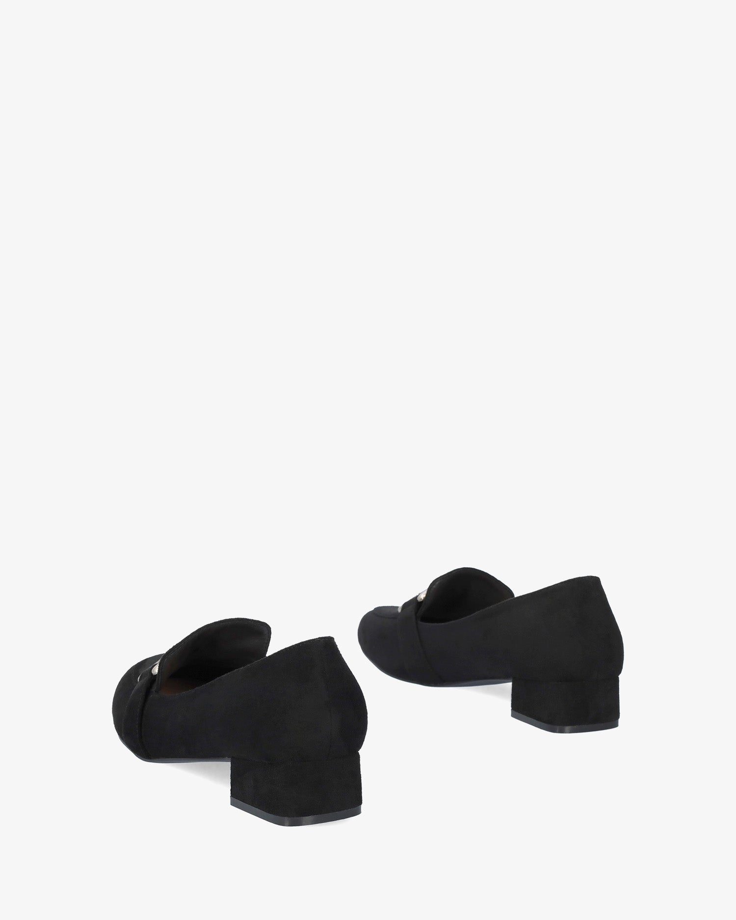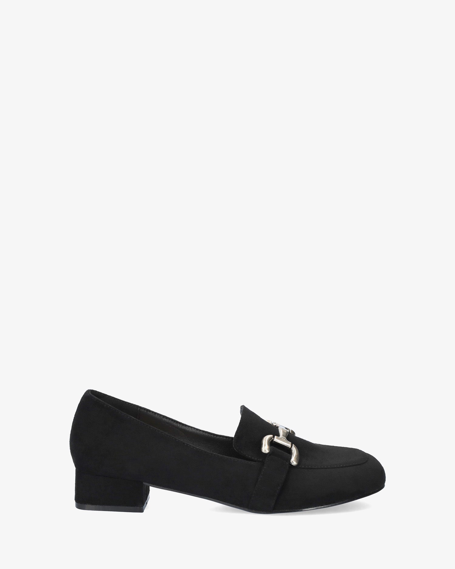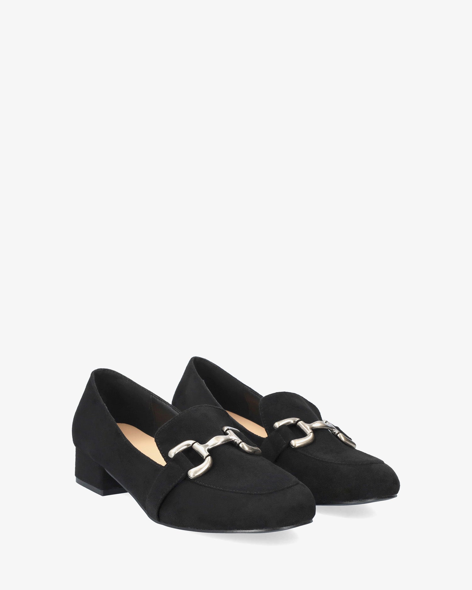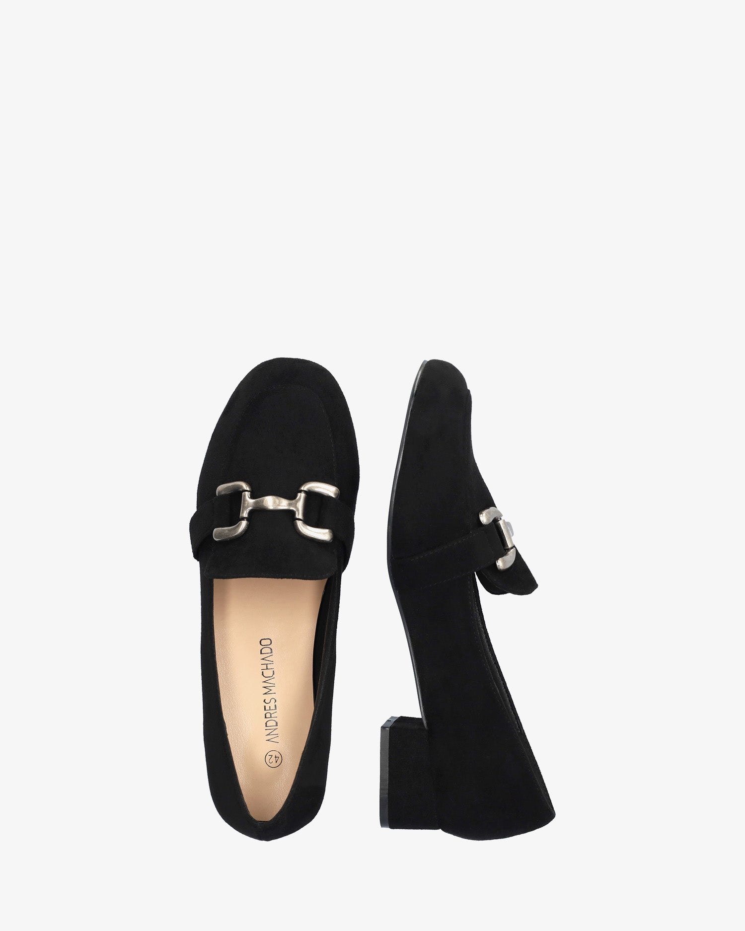 Heeled loafer in black suede material. The design features a matching stitching allaround the vamp and a metallic buckle over it, finishing with a rounded toe. The thick heel measures 3,5cm / 1,37" for large sizes from 42 to 46.