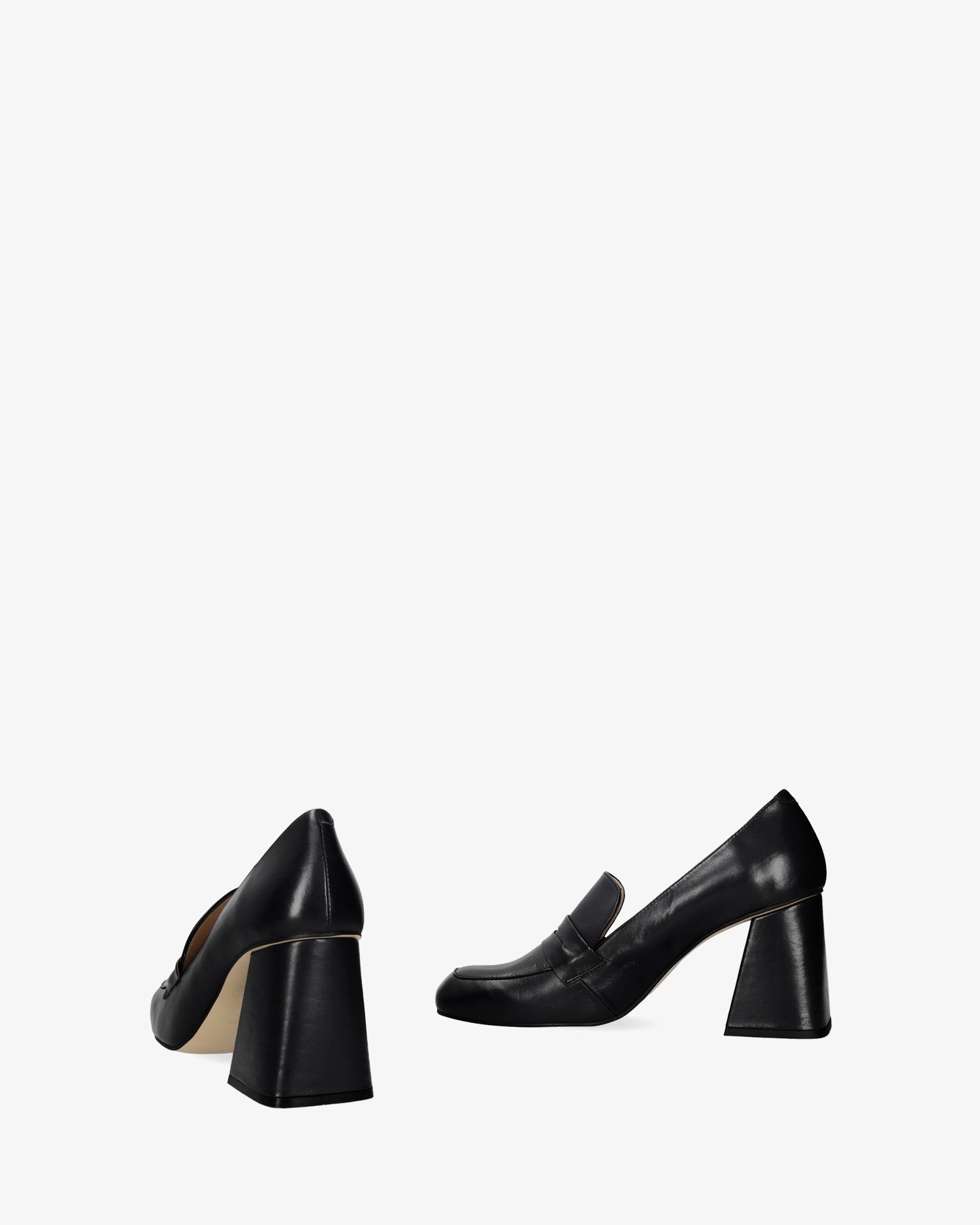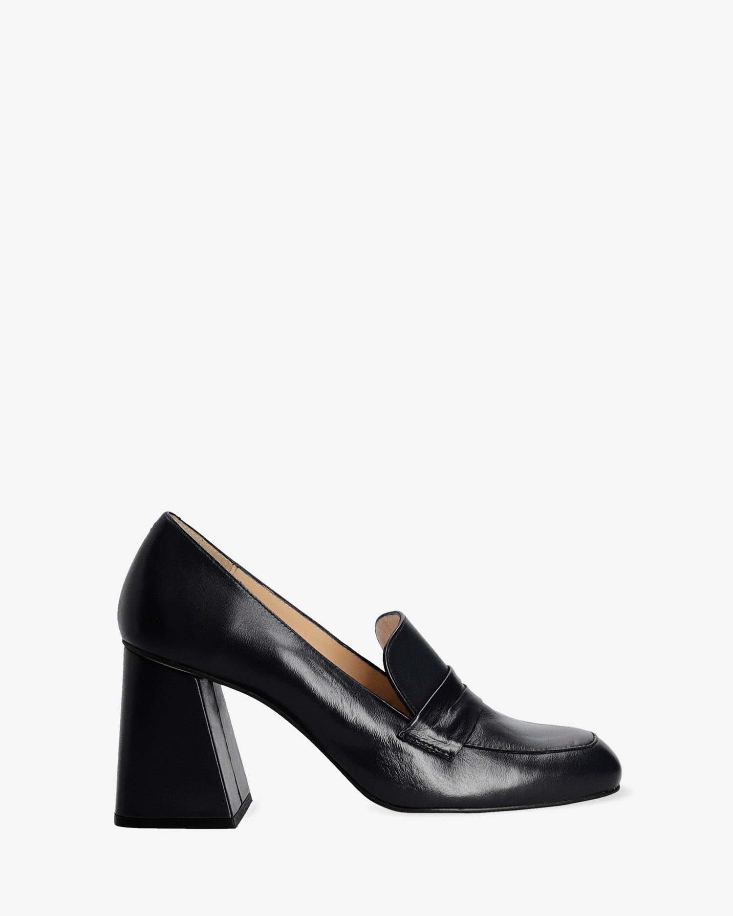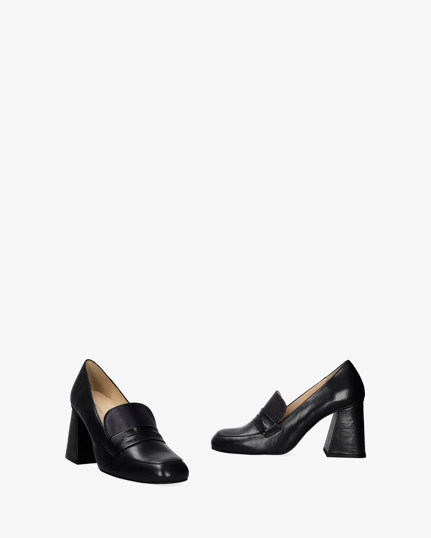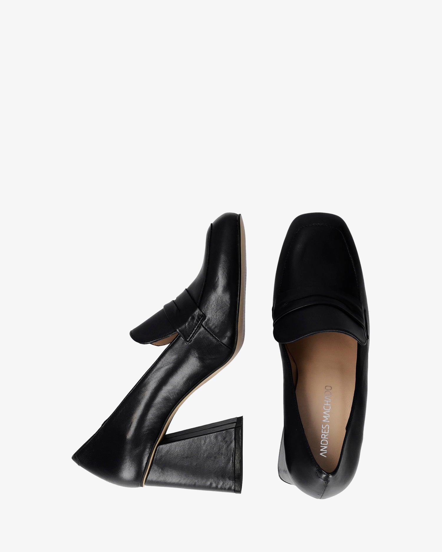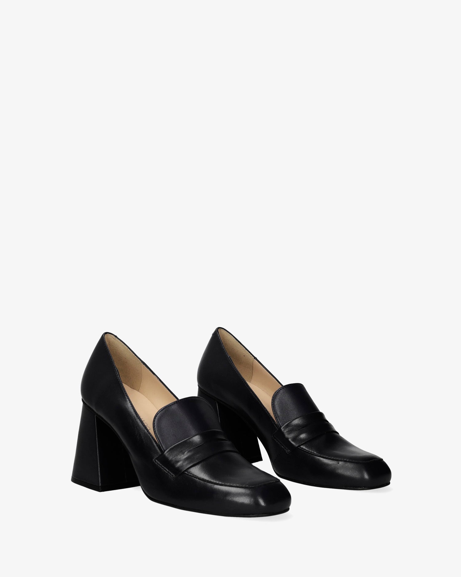 Heeled moccasins in black leather. Matching tongue and saddle. Finished in a square toe. Beige leather inner lining. The flare heel, lined in matching leather, is 7.5 cm / 2.95`` high for small sizes from 32 to 35 EU, 8 cm / 3.14`` high for medium sizes from 36 to 41 EU and 8.5 cm / 3.34`` high for large sizes from 42 to 45 EU. Made in Spain.