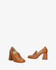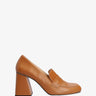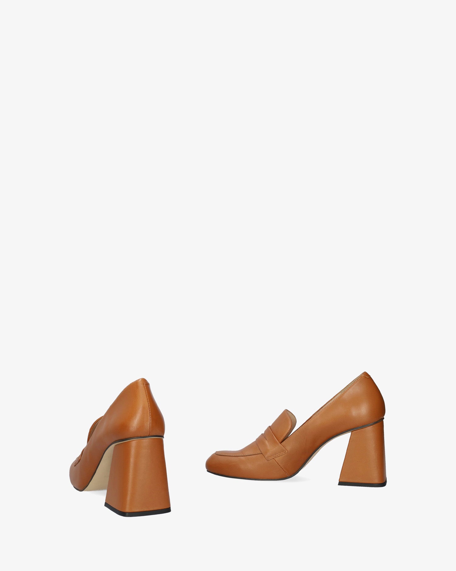 Heeled moccasins in brown leather. Matching tongue and saddle. Finished in a square toe. Beige leather inner lining. The flare heel, lined in matching leather, is 7.5 cm / 2.95`` high for small sizes from 32 to 35 EU, 8 cm / 3.14`` high for medium sizes from 36 to 41 EU and 8.5 cm / 3.34`` high for large sizes from 42 to 45 EU. Made in Spain.