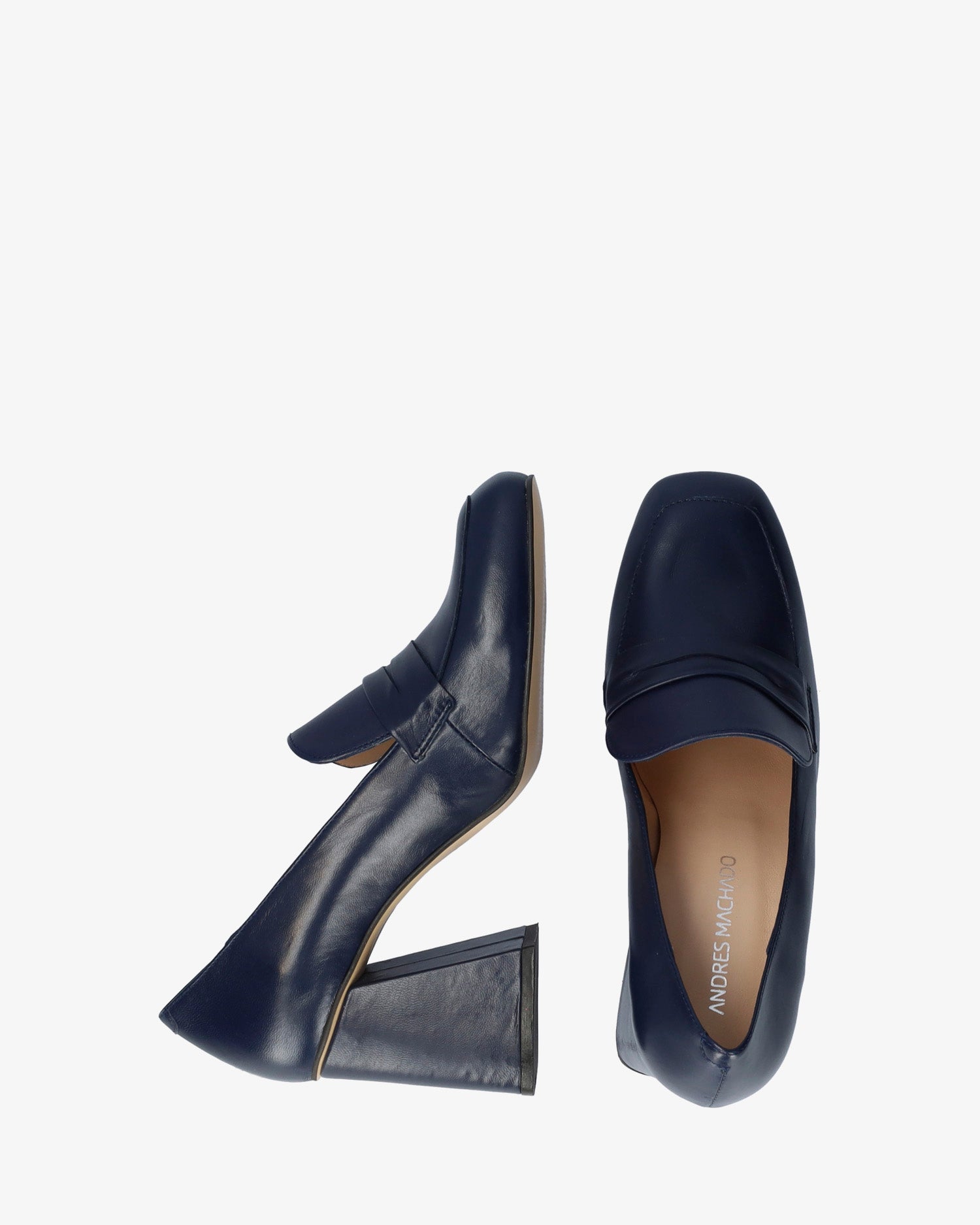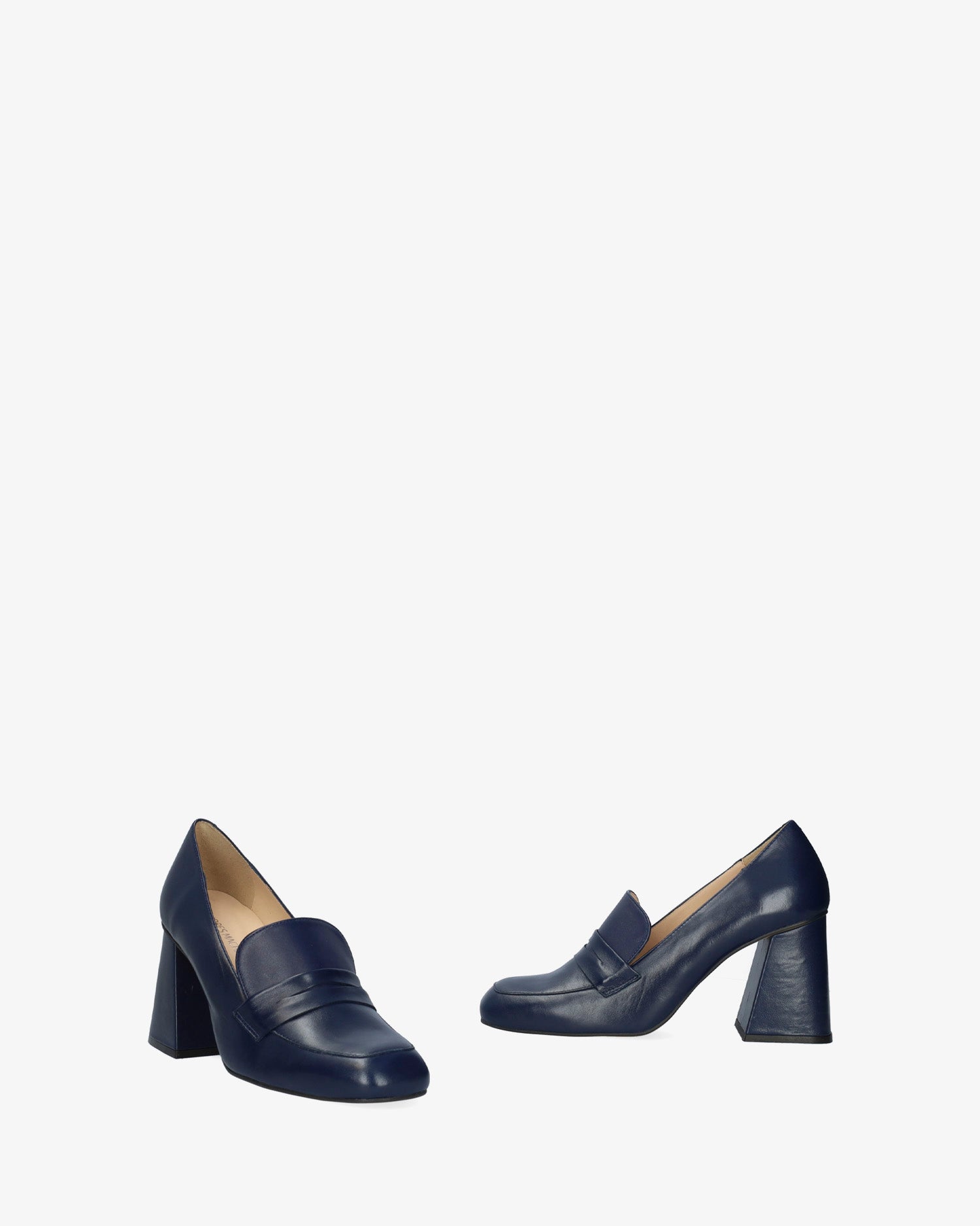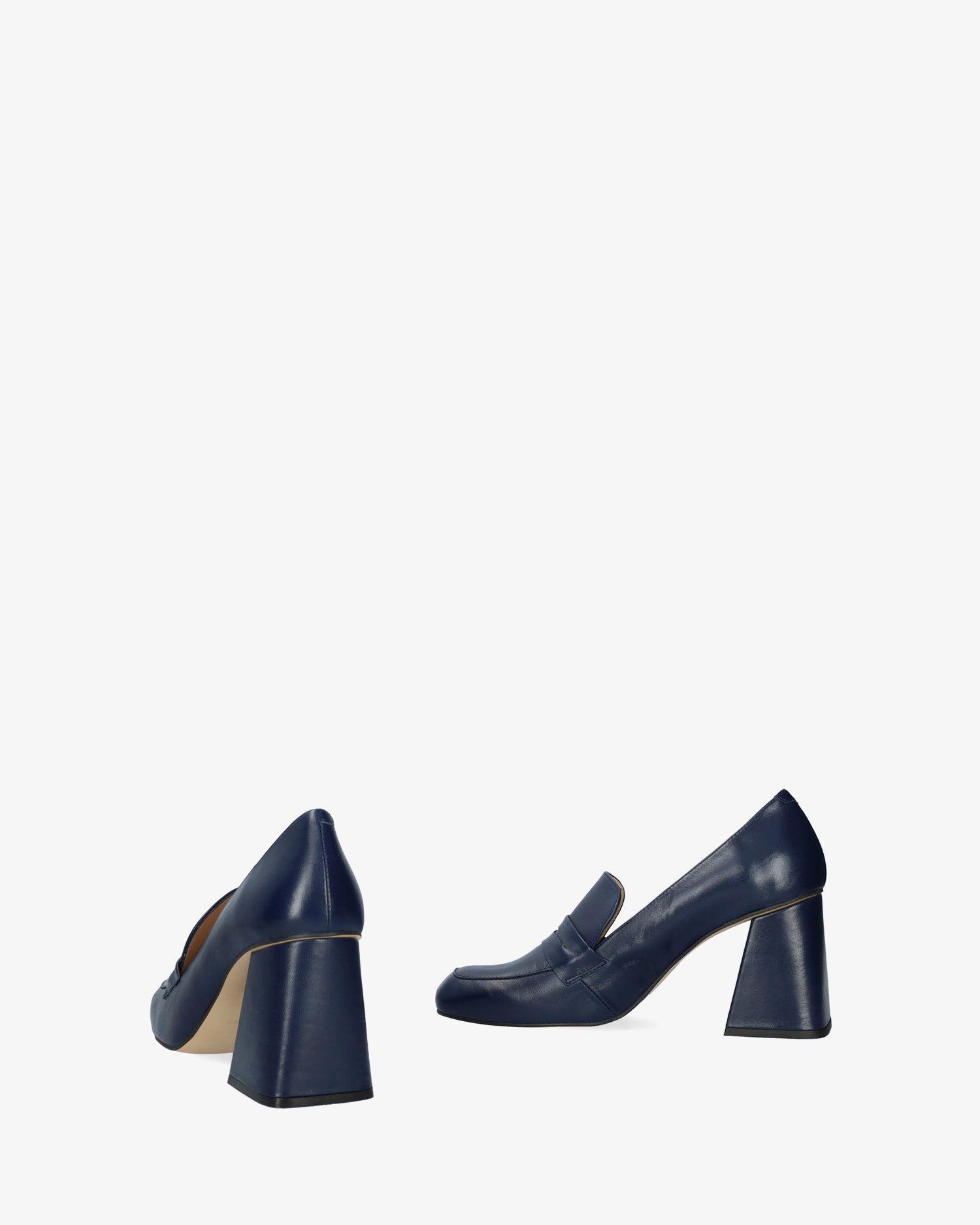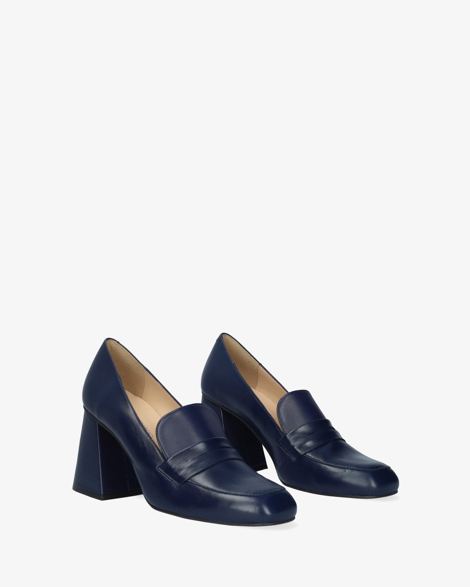 Heeled moccasins in navy leather. Matching tongue and saddle. Finished in a square toe. Beige leather inner lining. The flare heel, lined in matching leather, is 7.5 cm / 2.95`` high for small sizes from 32 to 35 EU, 8 cm / 3.14`` high for medium sizes from 36 to 41 EU and 8.5 cm / 3.34`` high for large sizes from 42 to 45 EU. Made in Spain.