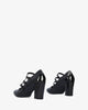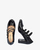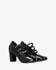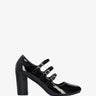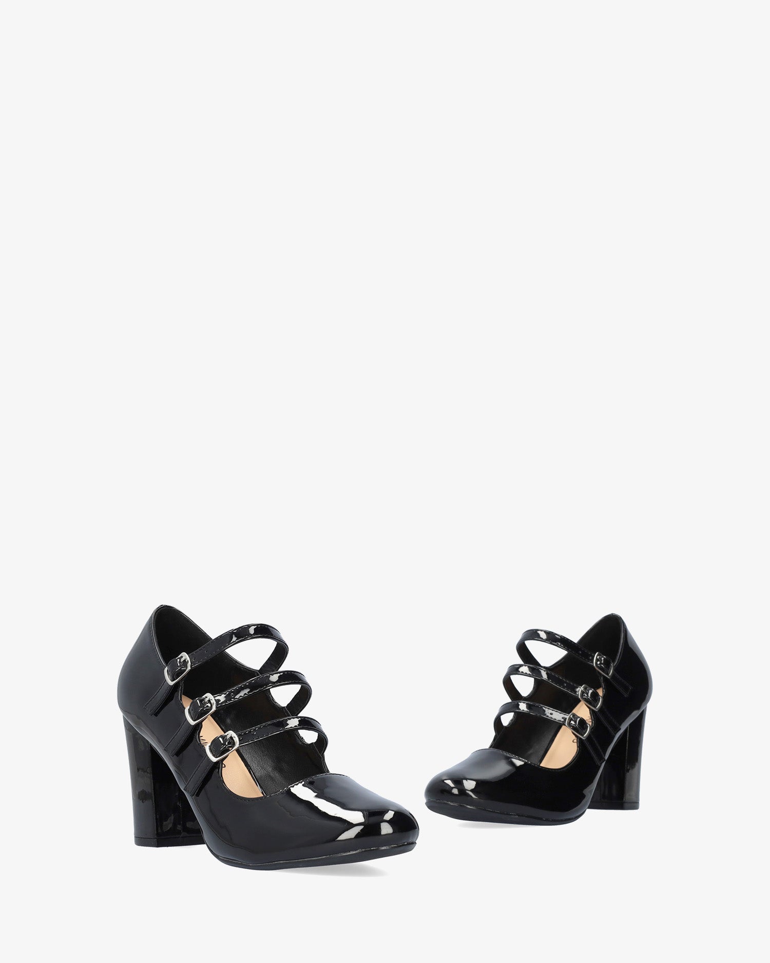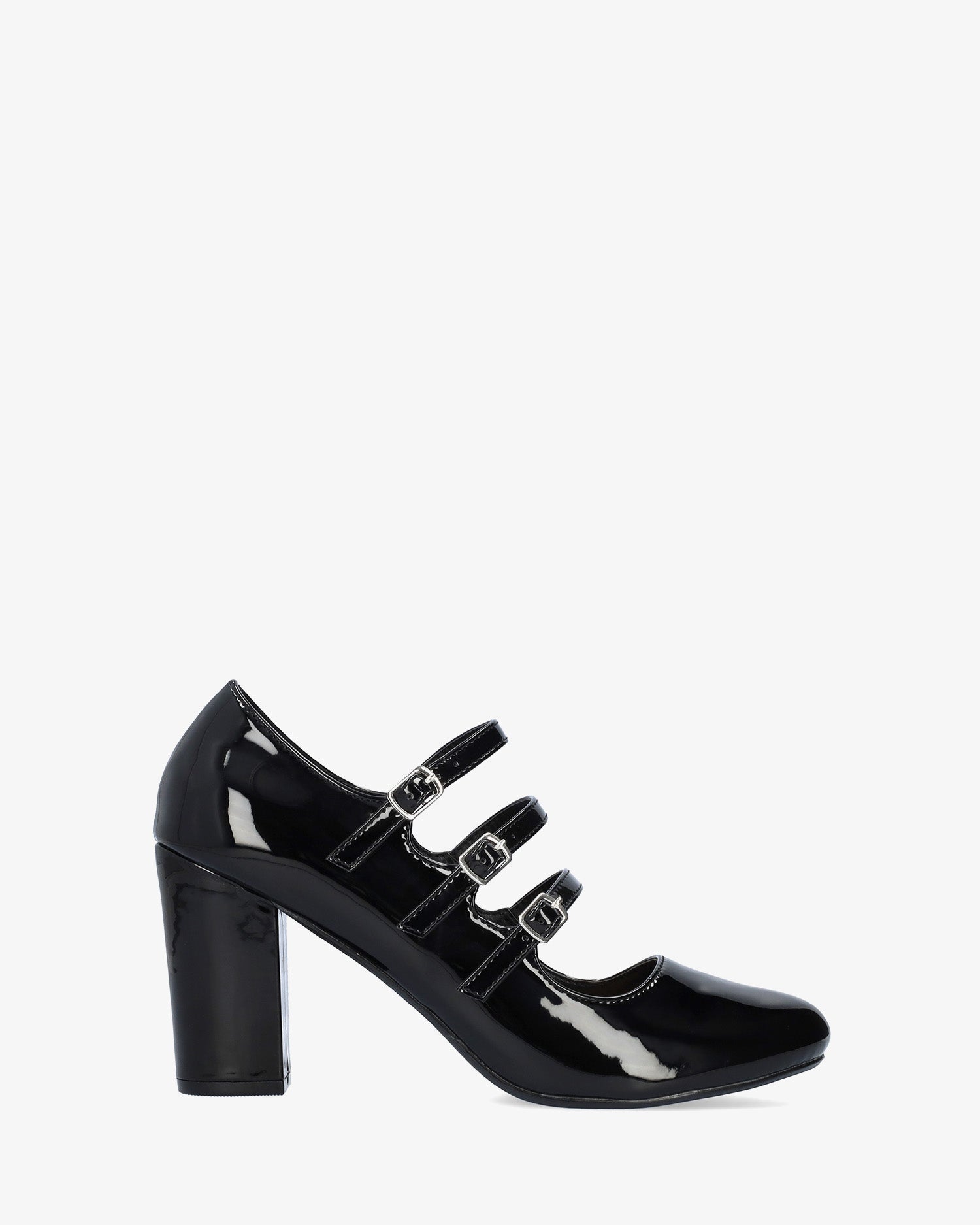 Heeled Mary Jane style shoe in black patent leather. Finished with round toe and 3 wraparound straps on the instep with a side metal buckle. The square heel lined to the tone measures 3,54 inch for small sizes from 32 to 35 and 3,74 inch for large sizes from 43 to 45. This model may vary from the standard, we recommend you check the cms of the insole.