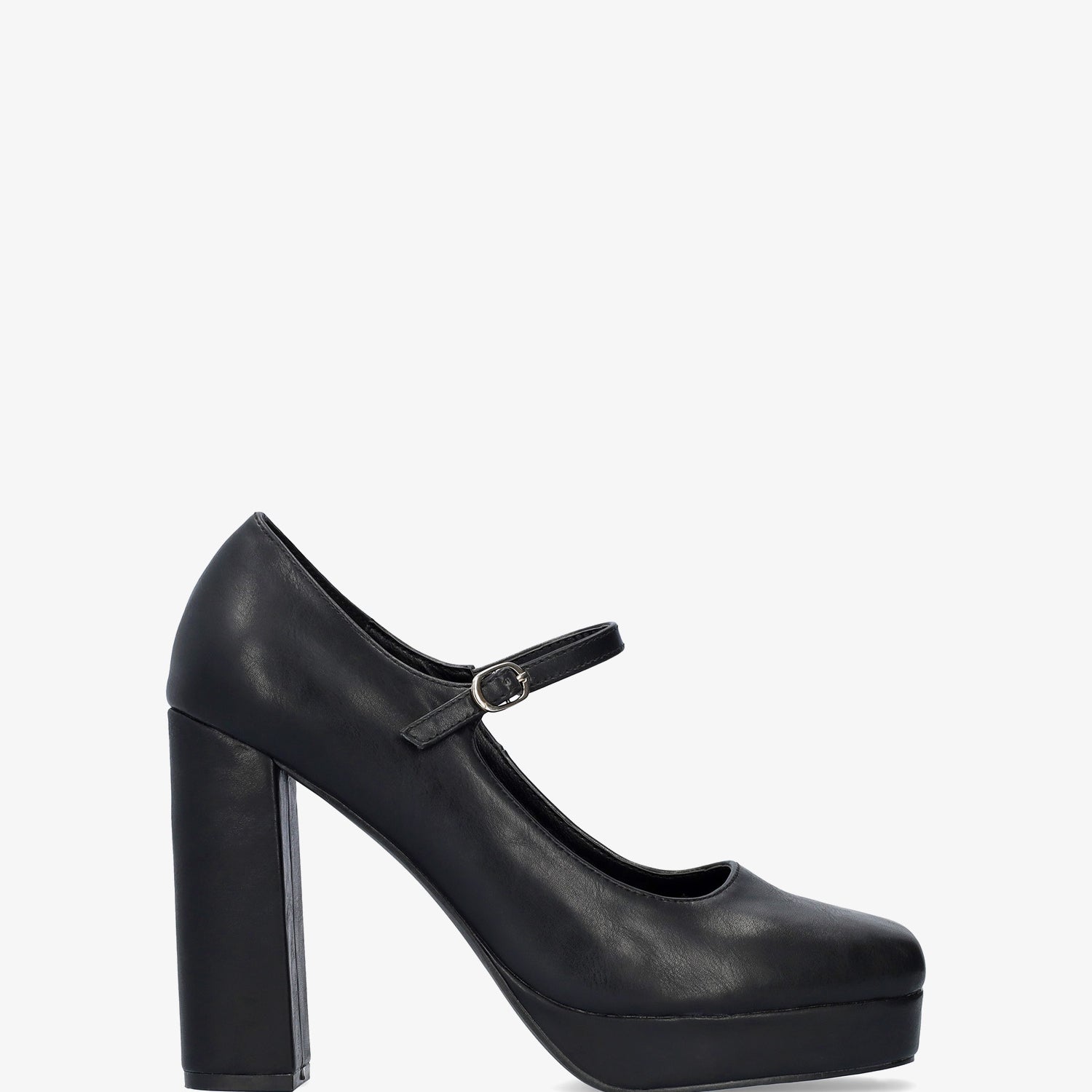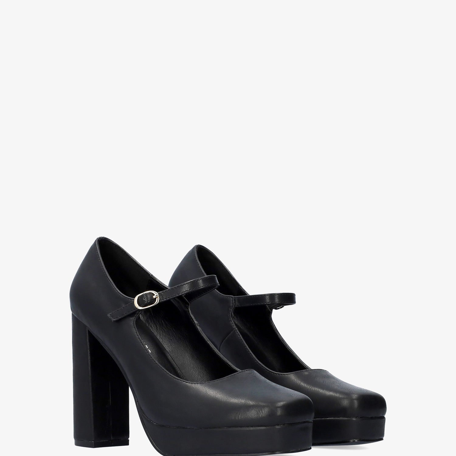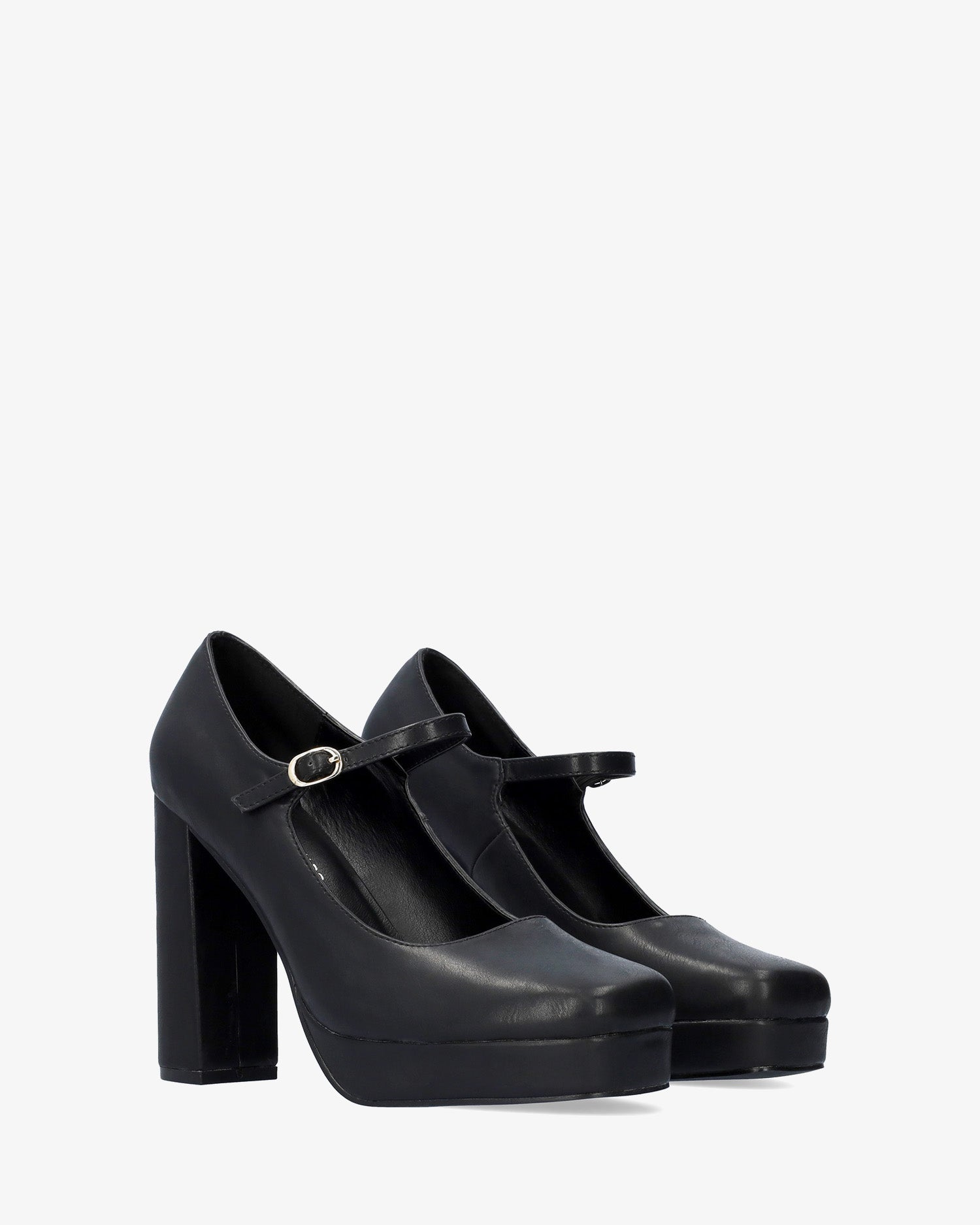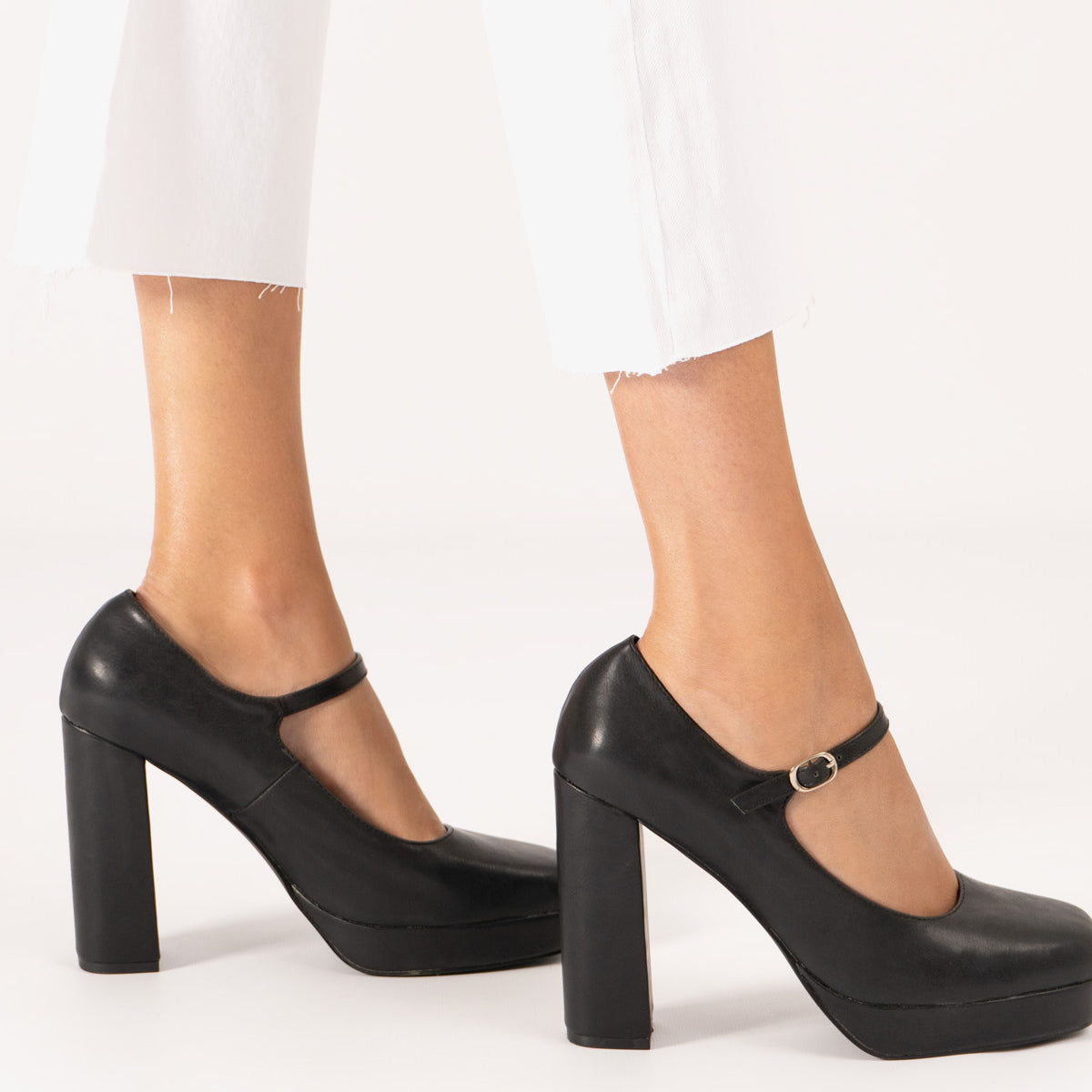 Mary Jane style heeled shoes in black coloured soft material. The design features a squared toe and a strap over the vamp which finishes with a metallic buckle. The lined high heel measures 11cm / 4,33" and the platform 2cm / 0,78" for small sizes from 32 to 35 and 12cm / 4,72" heel & 2,5cm / 0,98" platform for large sizes from 42 to 45.