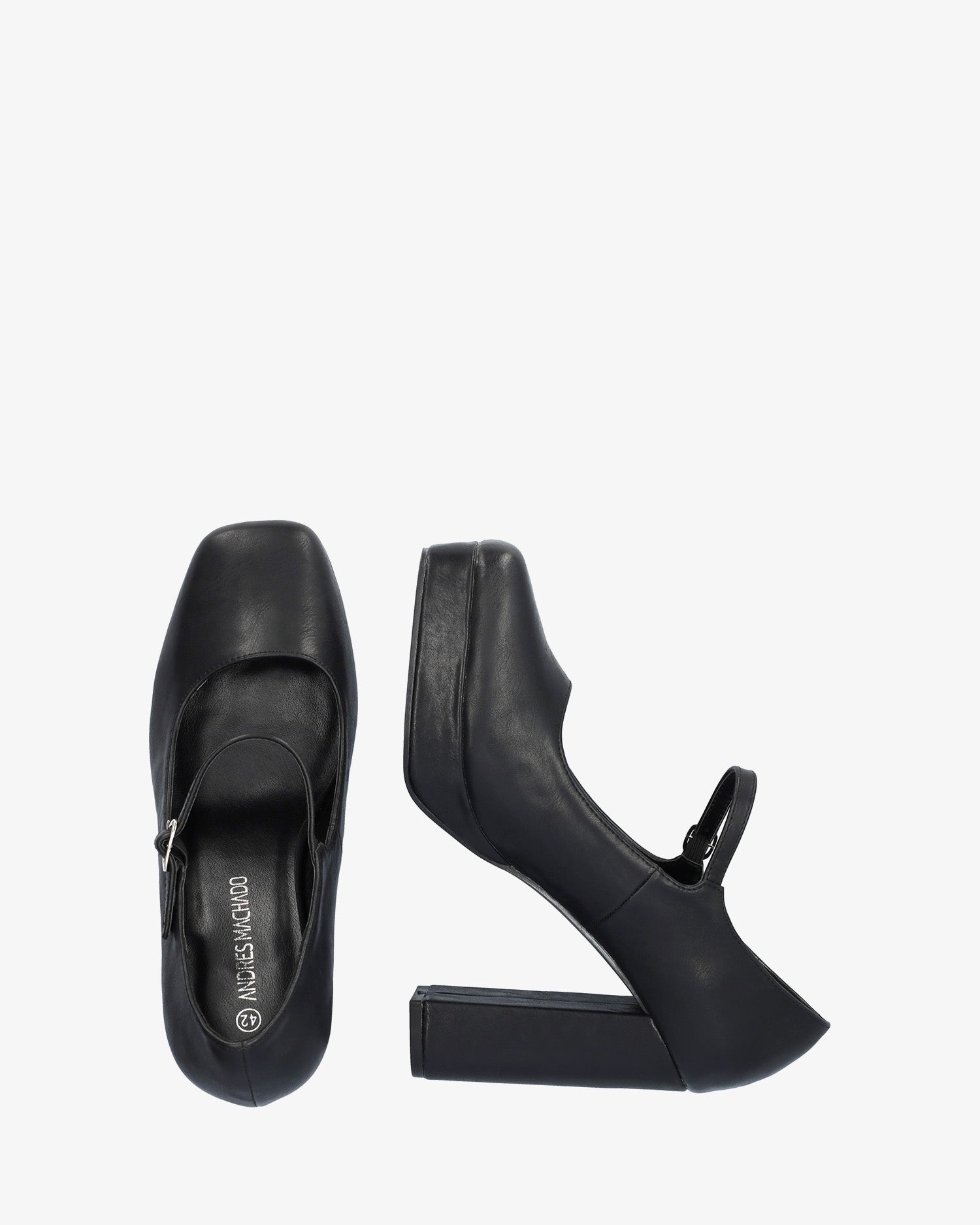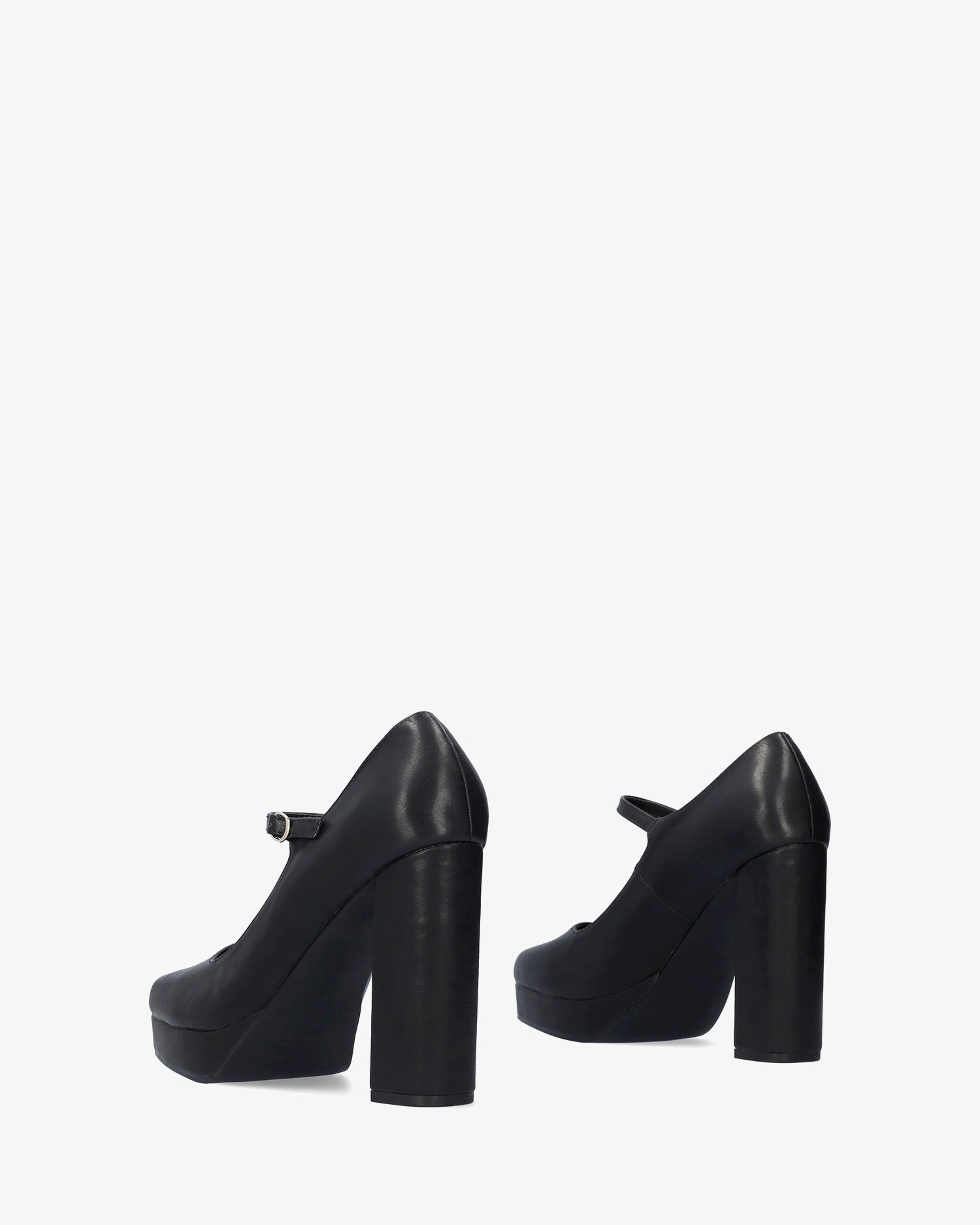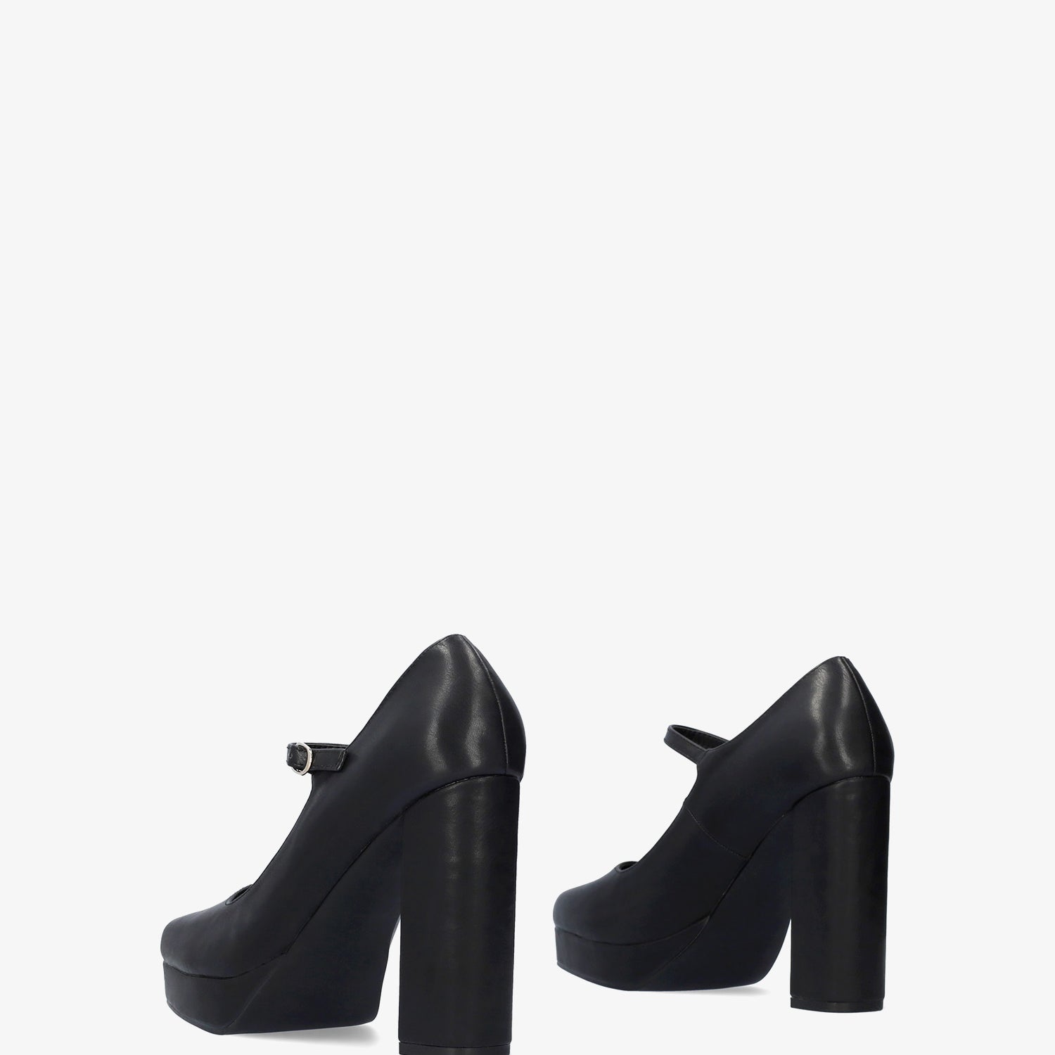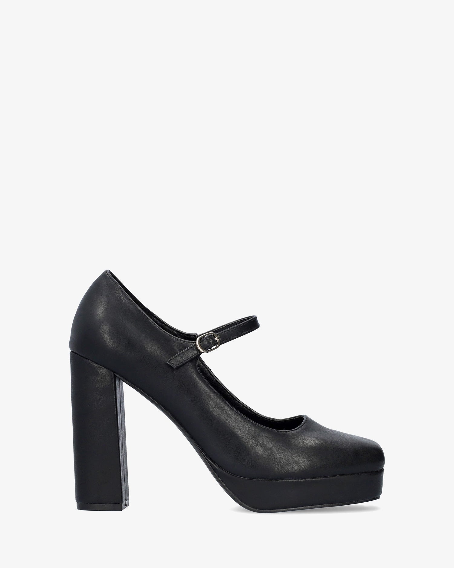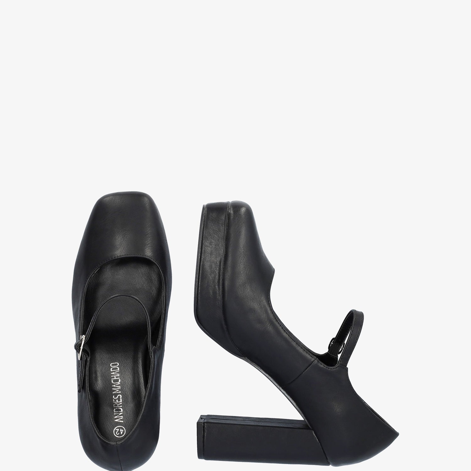 Mary Jane style heeled shoes in black coloured soft material. The design features a squared toe and a strap over the vamp which finishes with a metallic buckle. The lined high heel measures 11cm / 4,33" and the platform 2cm / 0,78" for small sizes from 32 to 35 and 12cm / 4,72" heel & 2,5cm / 0,98" platform for large sizes from 42 to 45.