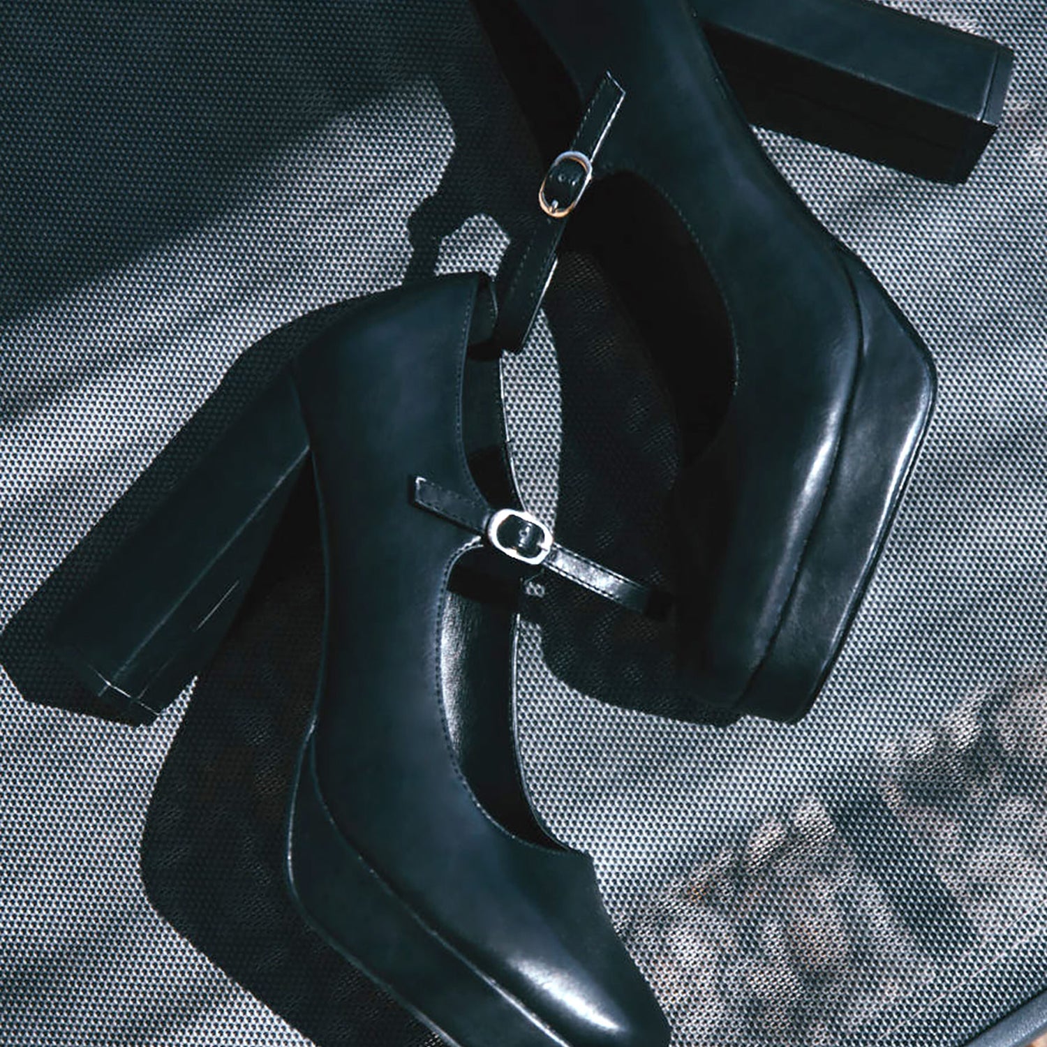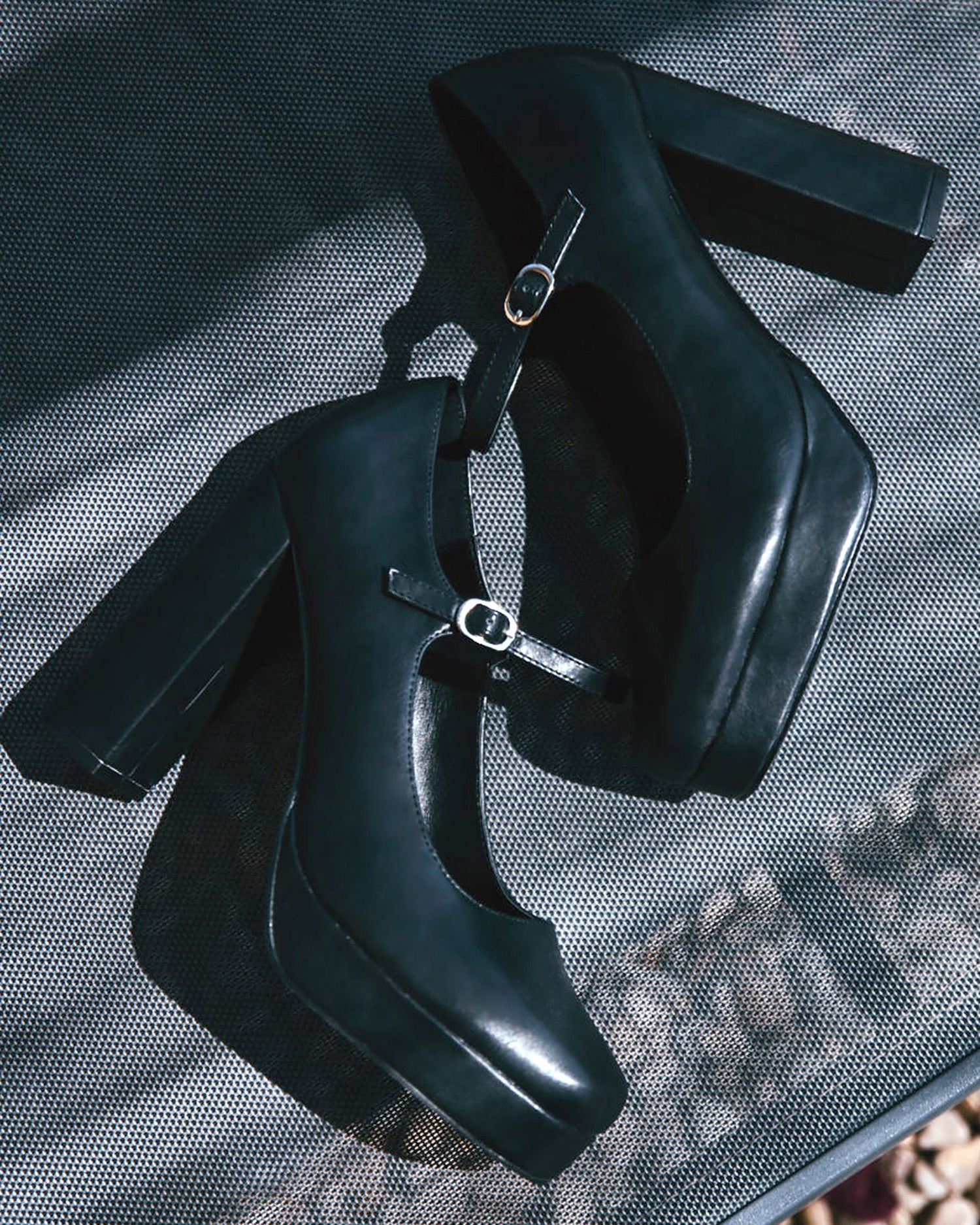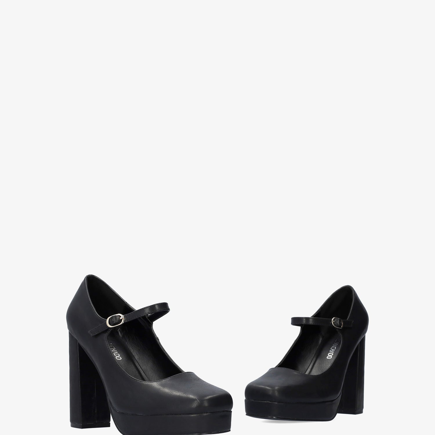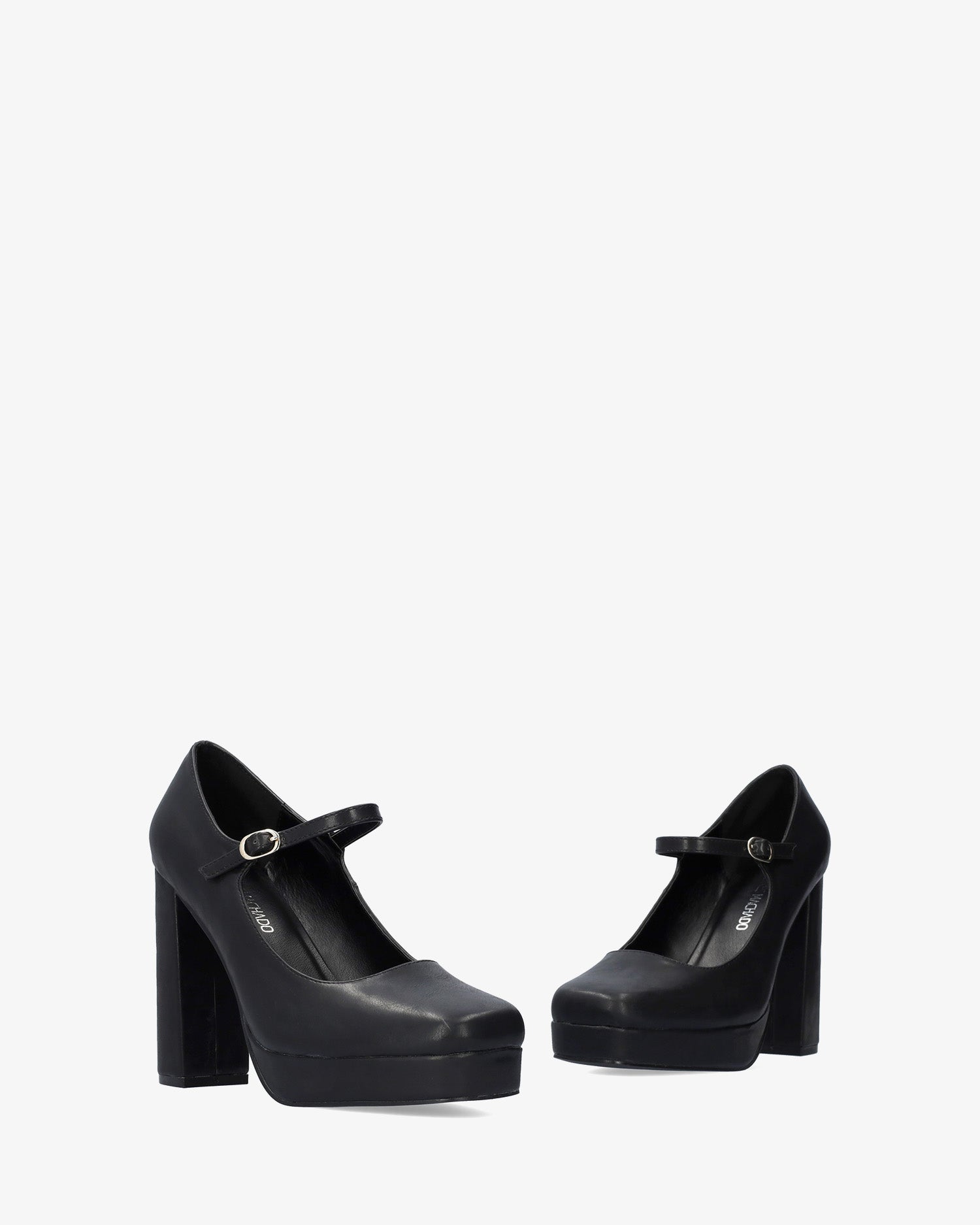 Mary Jane style heeled shoes in black coloured soft material. The design features a squared toe and a strap over the vamp which finishes with a metallic buckle. The lined high heel measures 11cm / 4,33" and the platform 2cm / 0,78" for small sizes from 32 to 35 and 12cm / 4,72" heel & 2,5cm / 0,98" platform for large sizes from 42 to 45.