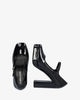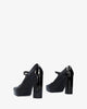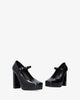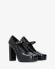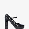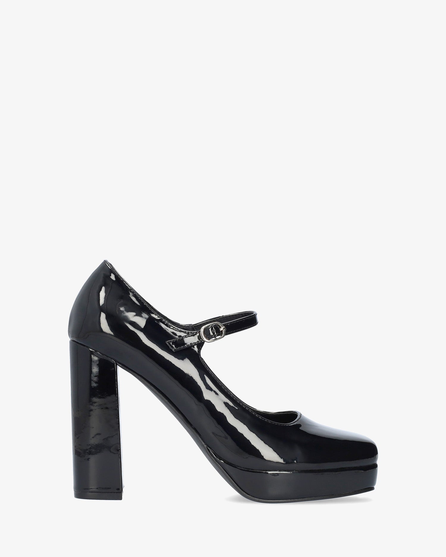 Mary Jane style heeled shoes in black coloured soft patent material. The design features a squared toe and a strap over the vamp which finishes with a metallic buckle. The lined high heel measures 11cm / 4,33" and the platform 2cm / 0,78" for small sizes from 32 to 35 and 12cm / 4,72" heel & 2,5cm / 0,98" platform for large sizes from 42 to 45.