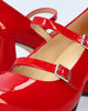 Heel Mary Janes in red patent leather, with three elastic buckled straps over the instep and a rounded to finishing. The squared tone on tone lined heel measures 6,5cm / 2,55" for small sizes from 32 to 35 and 7cm/ 2,75" for large sizes from 42 to 45.