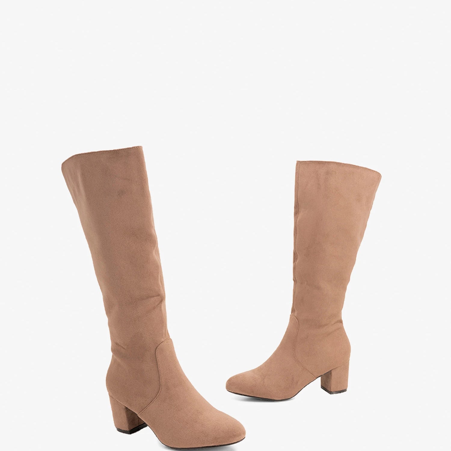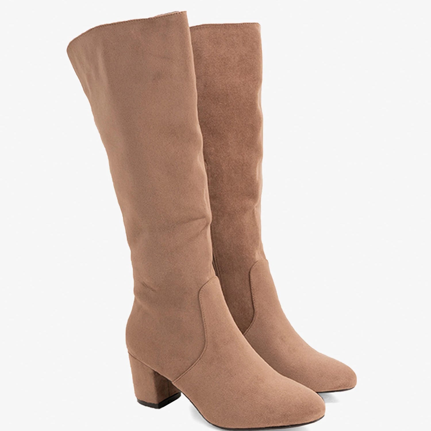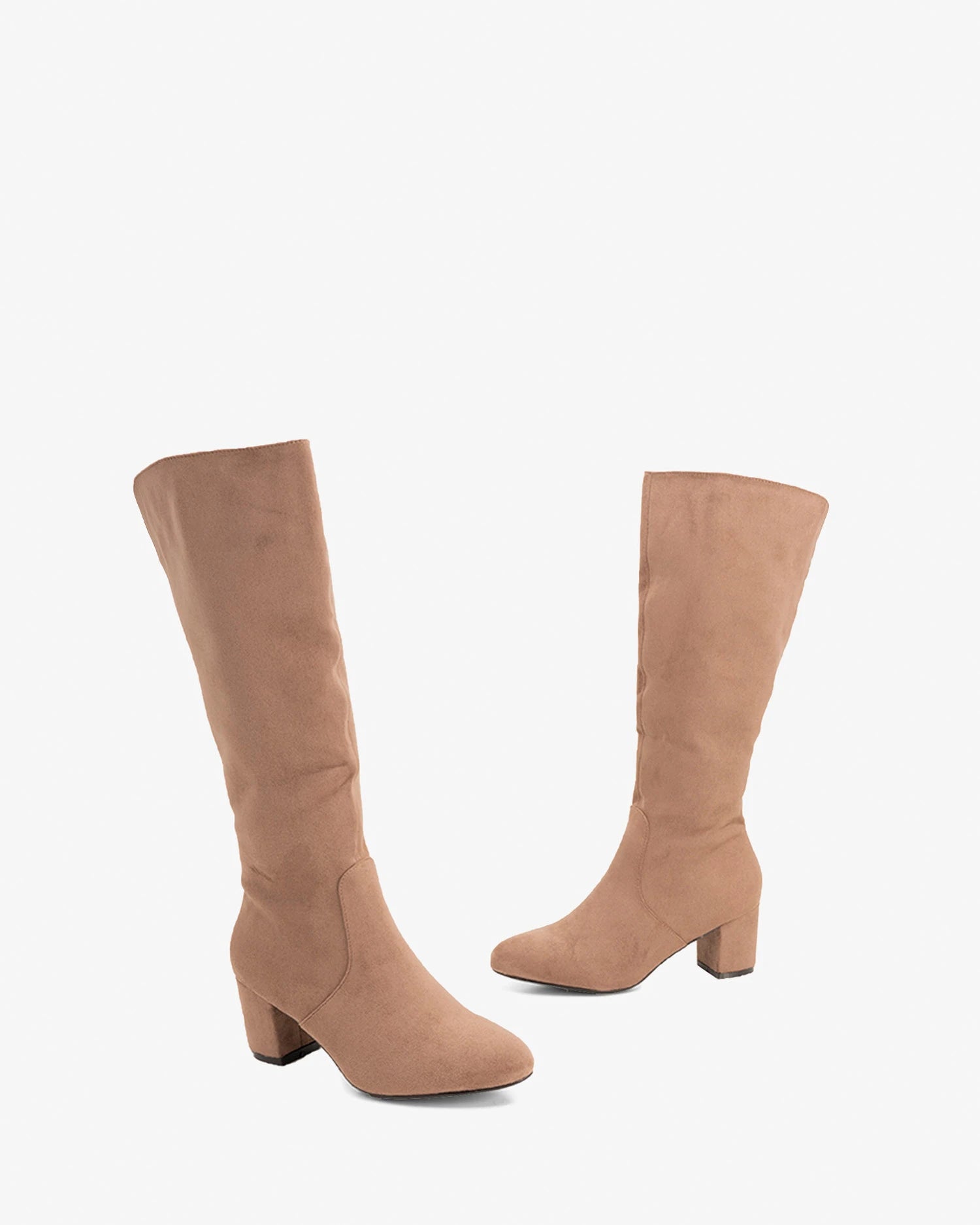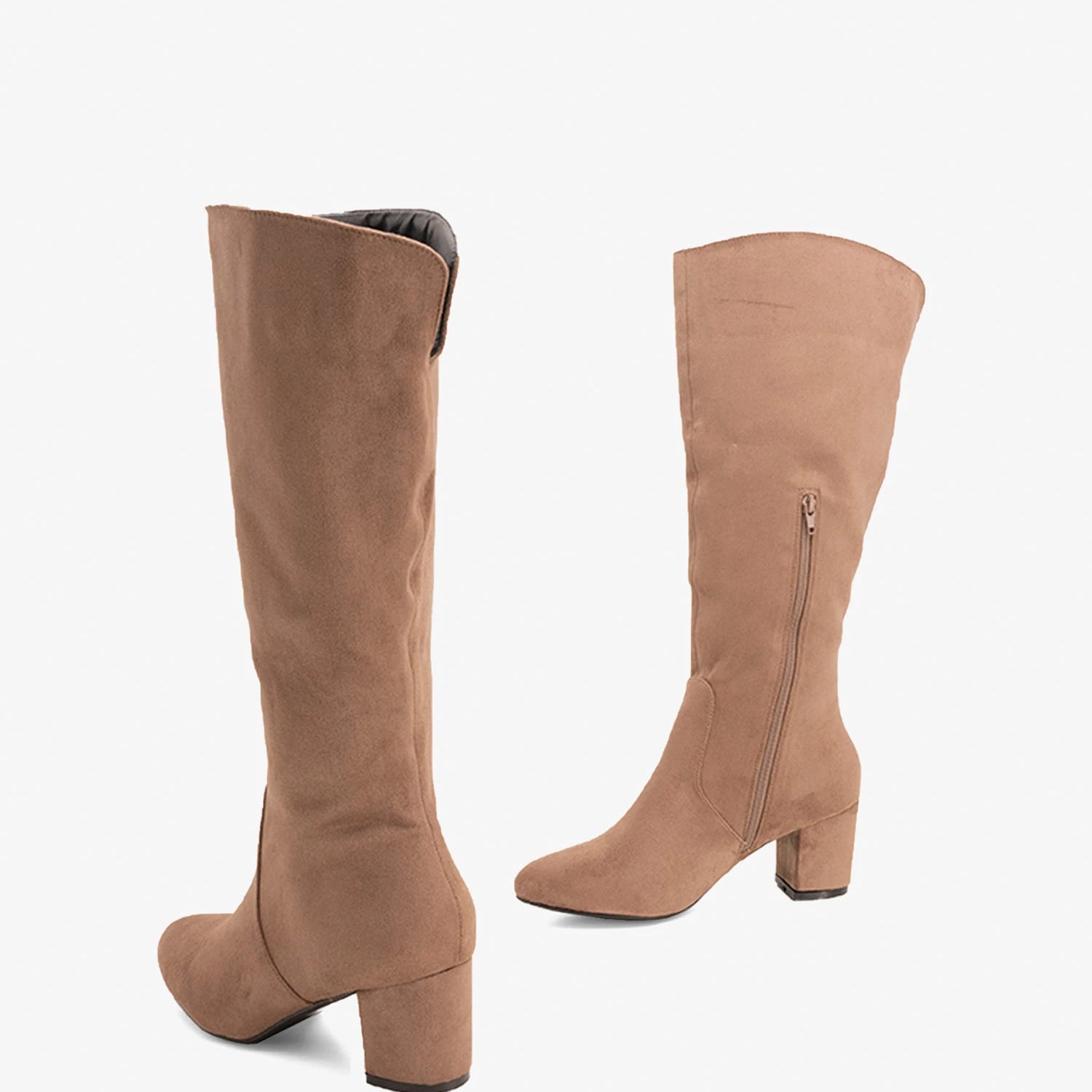 Mid-calf boots in light brown faux suede. Matching zipper closure on the inner, lower half of the shaft. Almond shapped toe box. The lined heel is 5.5 cm / 2.16`` high for small sizes from 32 to 35 EU and 7 cm / 2.75`` high for large sizes from 42 to 45 EU.