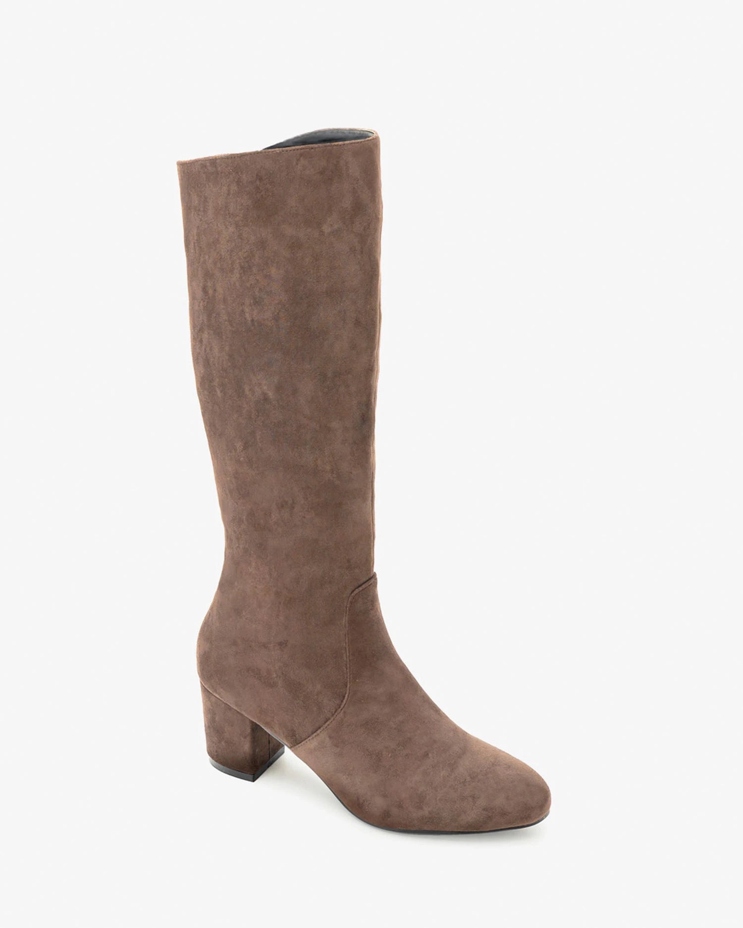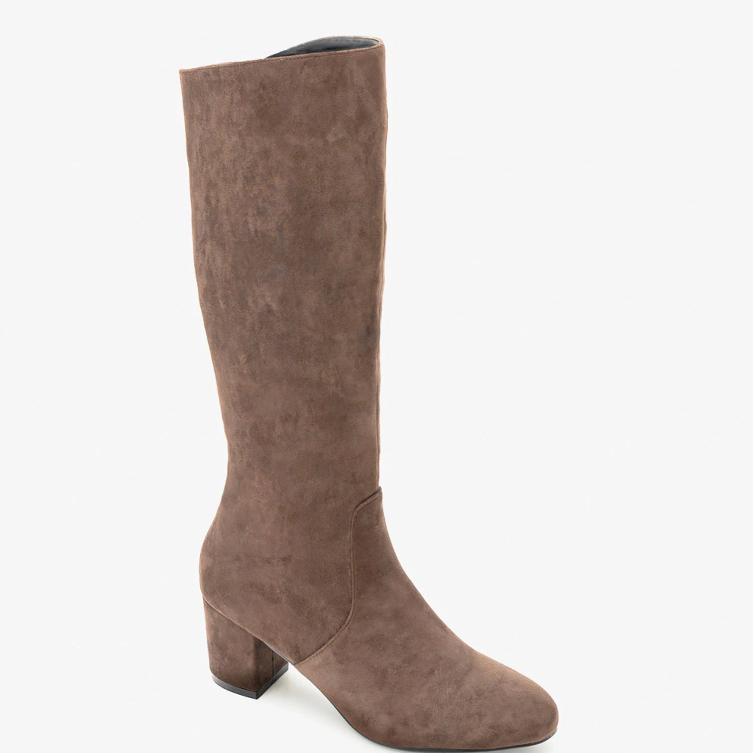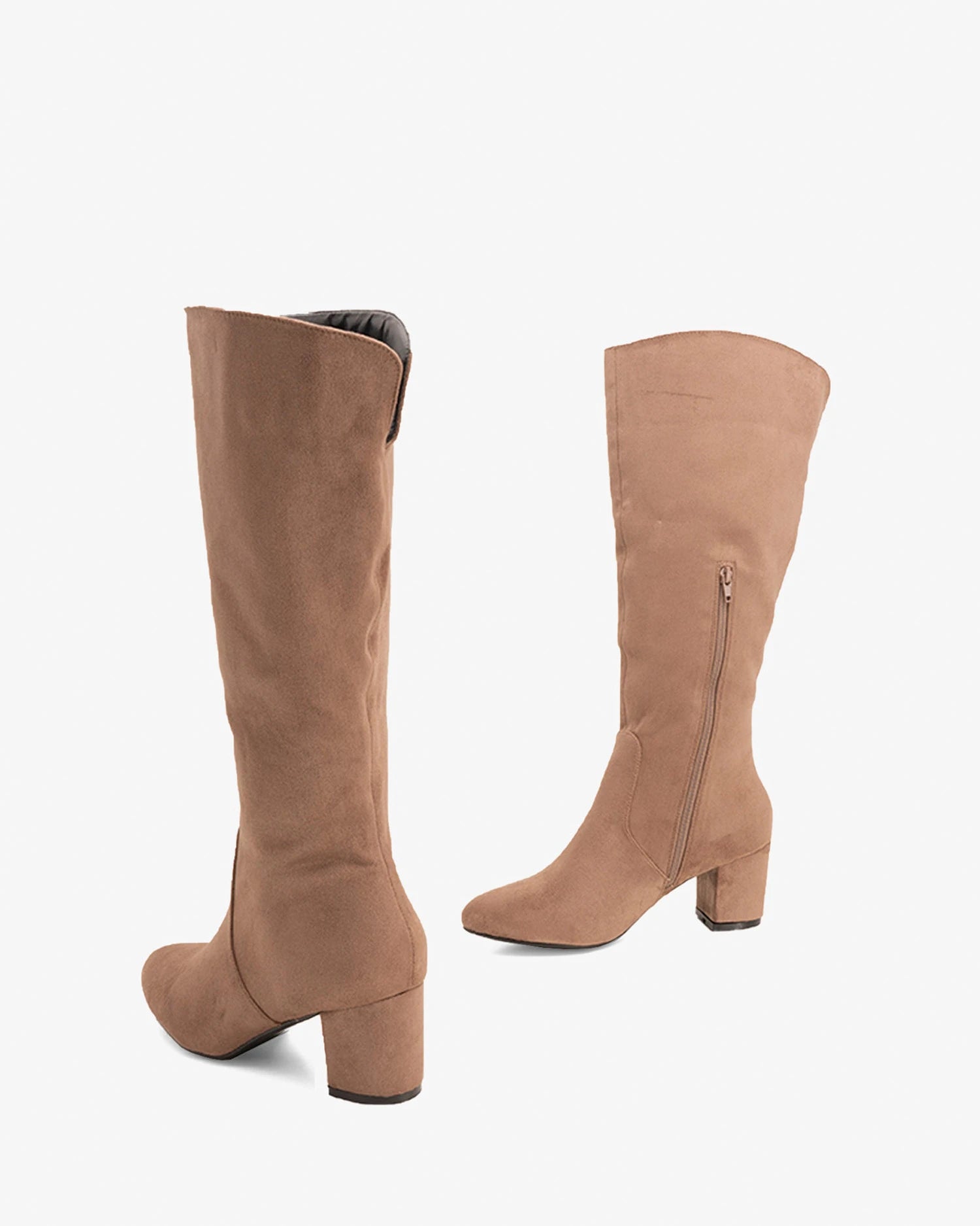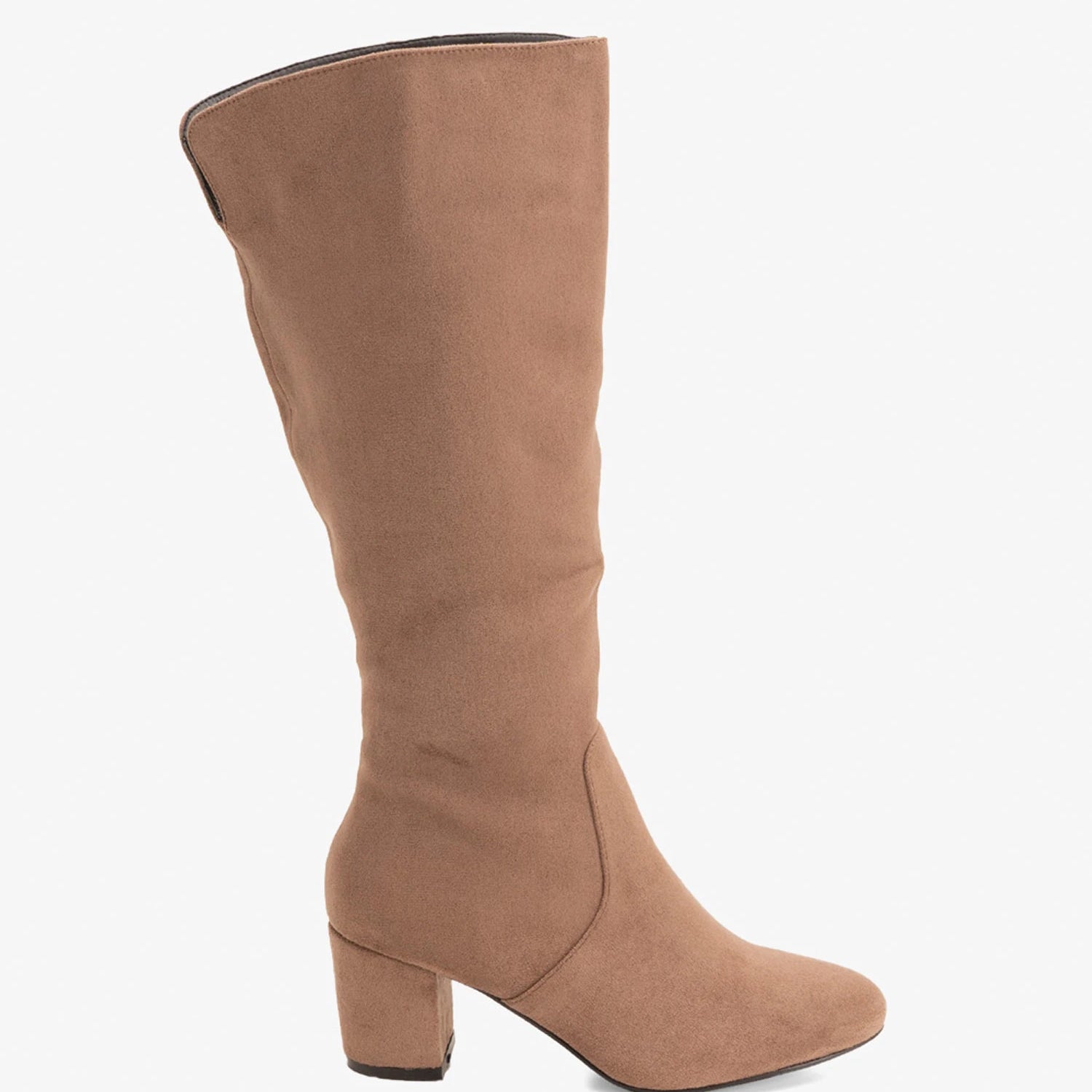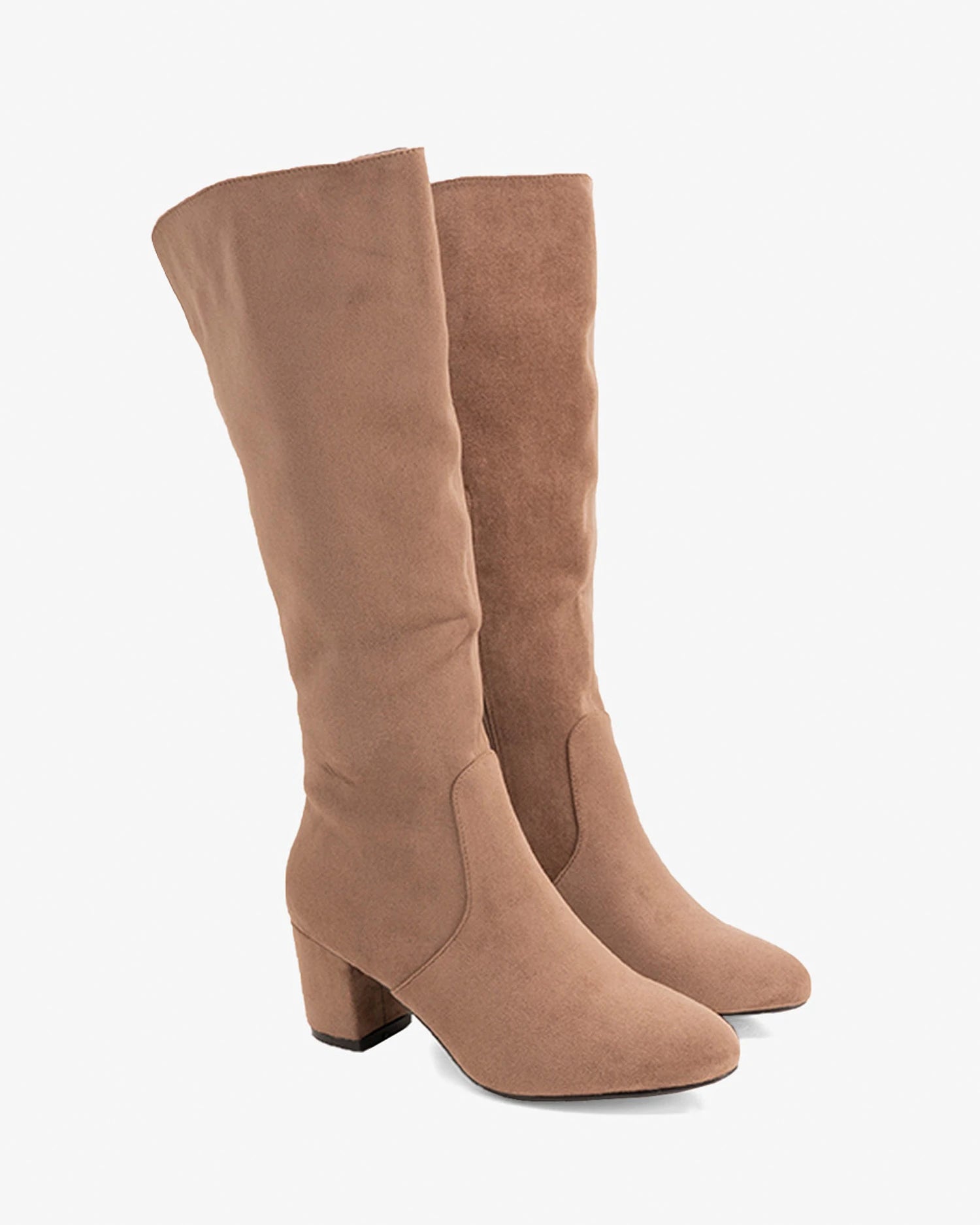 Mid-calf boots in light brown faux suede. Matching zipper closure on the inner, lower half of the shaft. Almond shapped toe box. The lined heel is 5.5 cm / 2.16`` high for small sizes from 32 to 35 EU and 7 cm / 2.75`` high for large sizes from 42 to 45 EU.