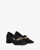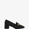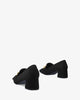 Heeled moccasins in black faux suede with gold chain links and fringes detail on the vamp. Squared shaped toe box. The wide heel is 2,14" high for small sizes from 32 to 35 EU and 2,34" high for large sizes from 42 to 45 EU.