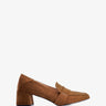 Heeled moccasin in camel colored faux suede
