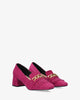 Heeled moccasins in fuxia faux suede with gold chain links and fringes detail on the vamp. Squared shaped toe box. The wide heel is 2,14" high for small sizes from 32 to 35 EU and 2,34" high for large sizes from 42 to 45 EU.