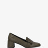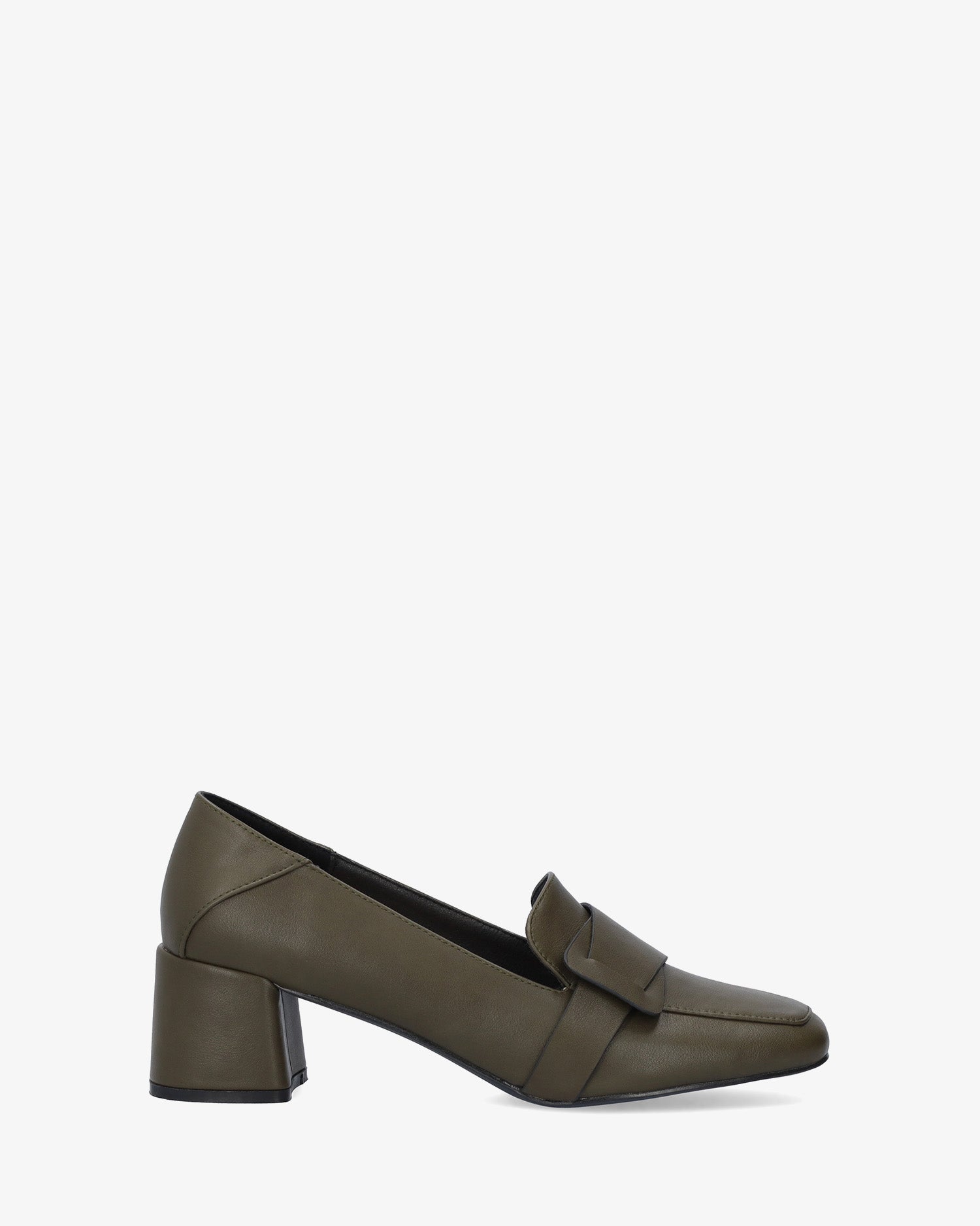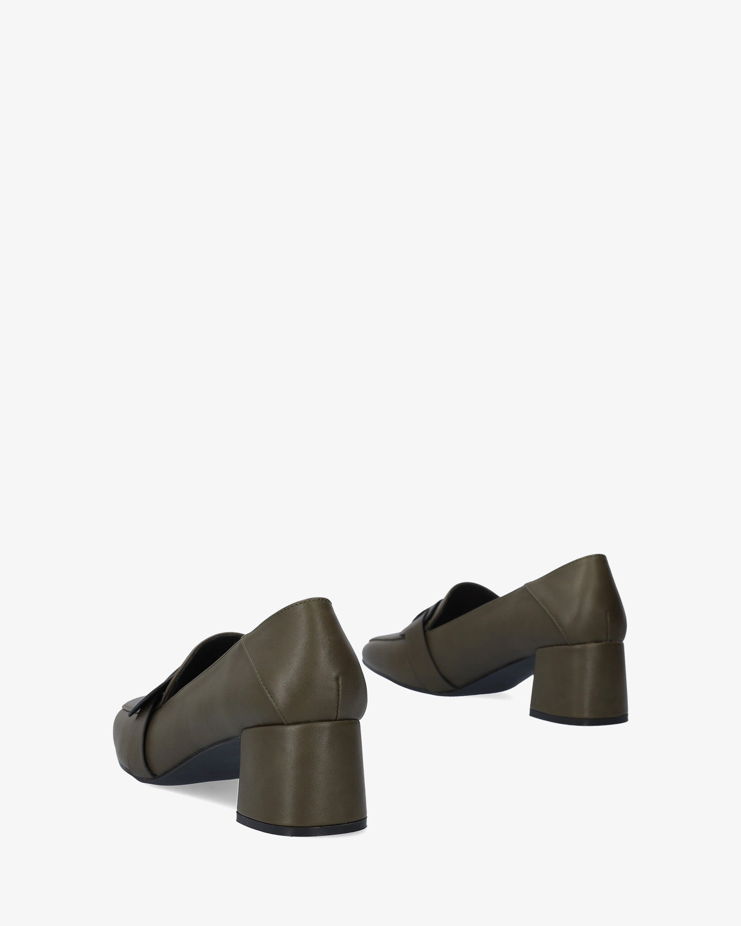 Heeled moccasins in green faux leather with matching saddle detail and decorative stitching on the vamp and the heel. Finished in a square toe. The wide heel is 2,14" high for small sizes from 32 to 35 EU and 2,34" high for large sizes from 42 to 45 EU.