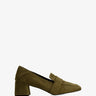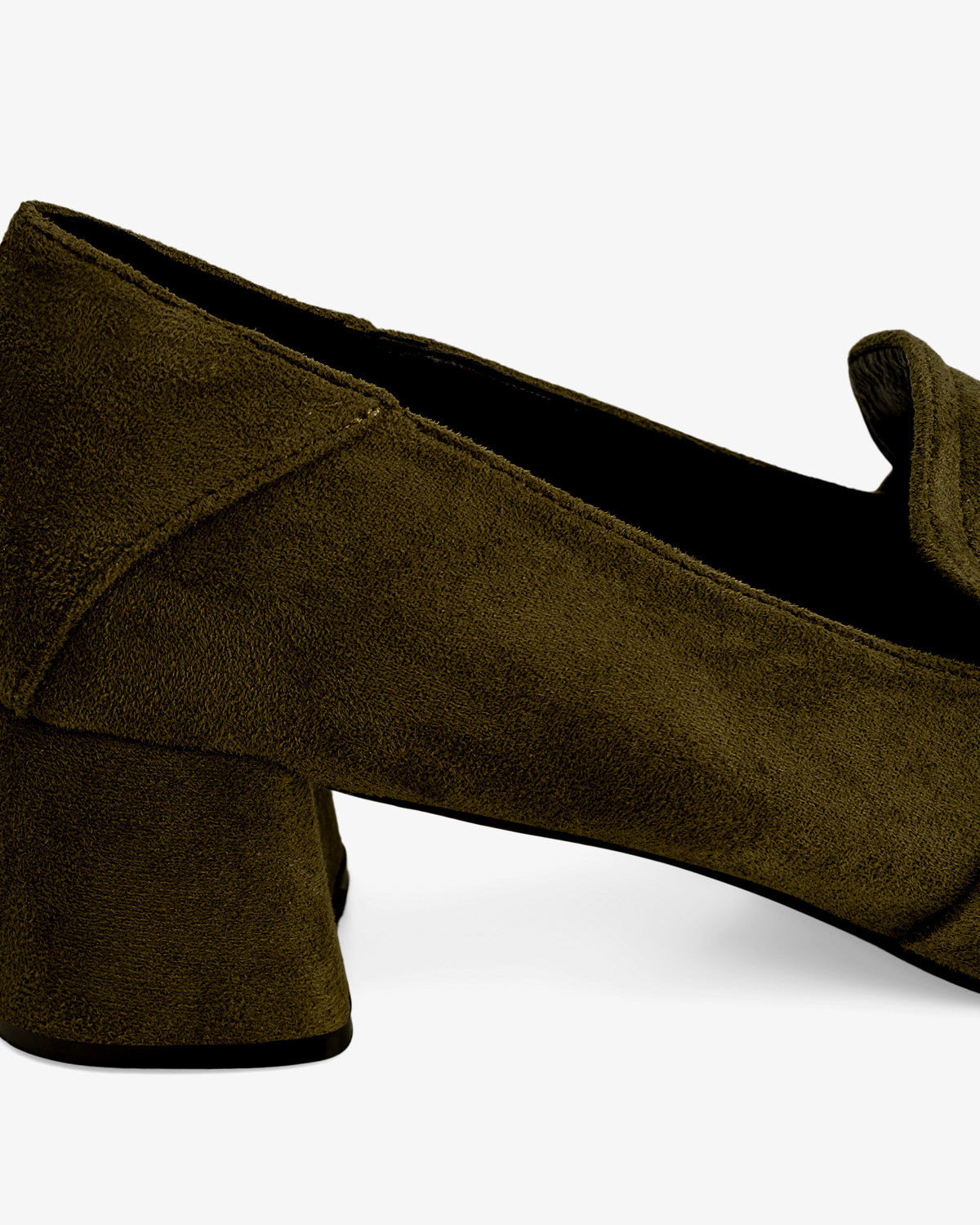 Heeled moccasins in kiwi faux suede with matching saddle detail and decorative stitching on the vamp. Finished in a square toe. The wide heel is 5.5 cm / 2.16`` high for small sizes from 32 to 35 EU and 6 cm / 2.36`` high for large sizes from 42 to 45 EU.