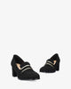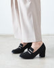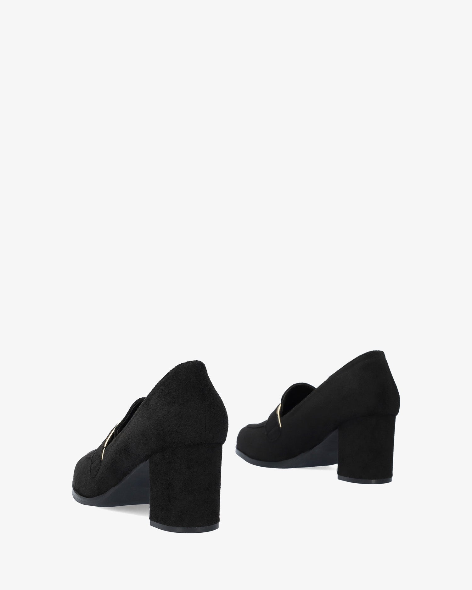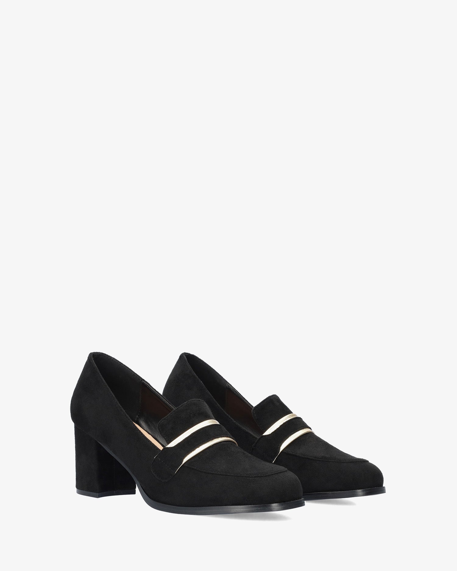 Heeled moccasins in black-colored faux suede with matching mask detail with gold piping on the instep. Rounded shaped toe box. The wide heel is 2,73" high for small sizes from 32 to 35 EU and 2,92" high for large sizes from 42 to 45 EU.