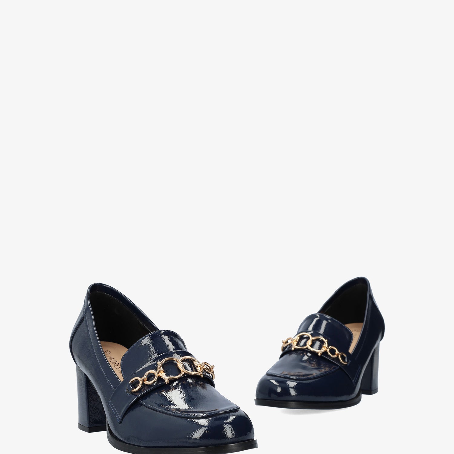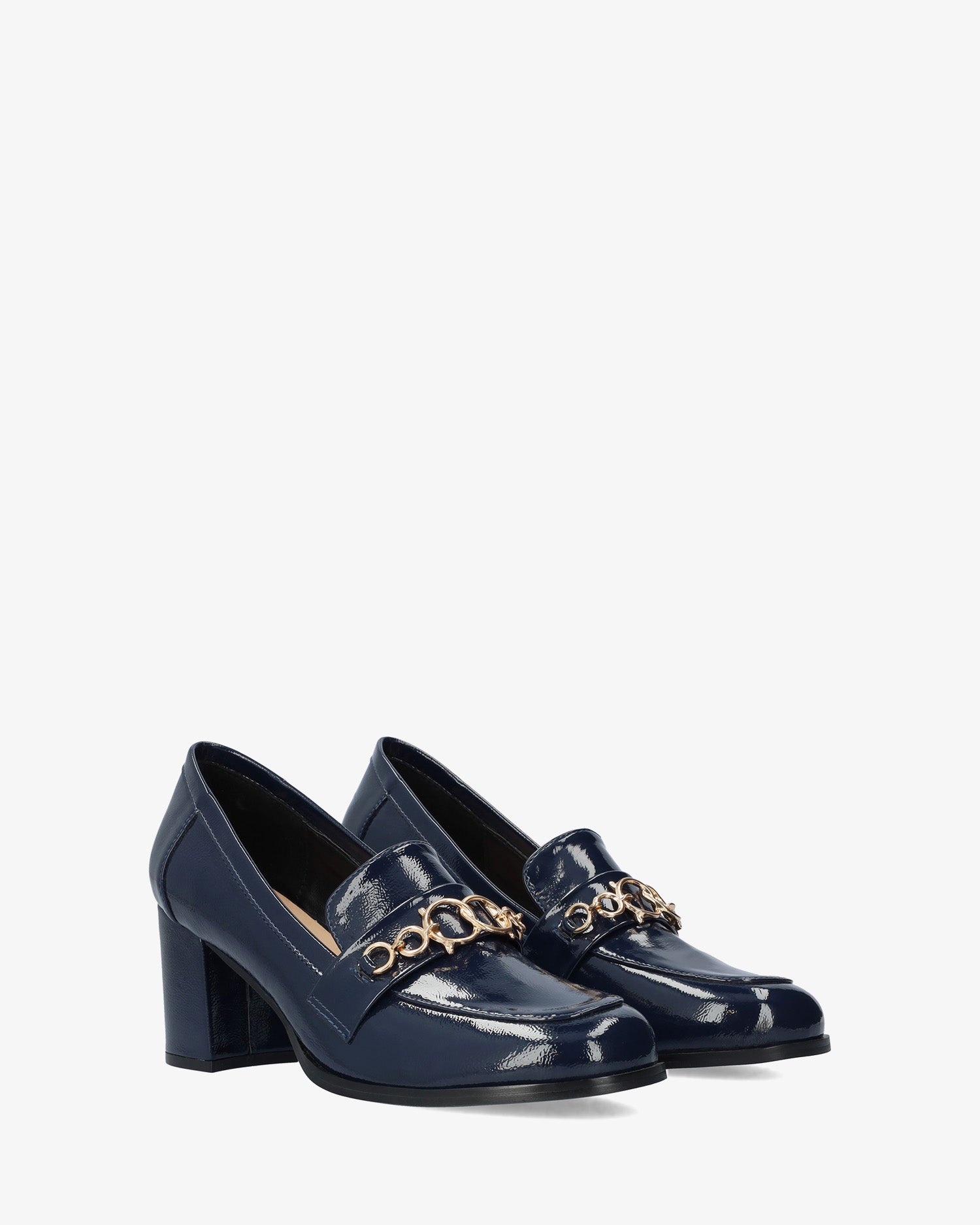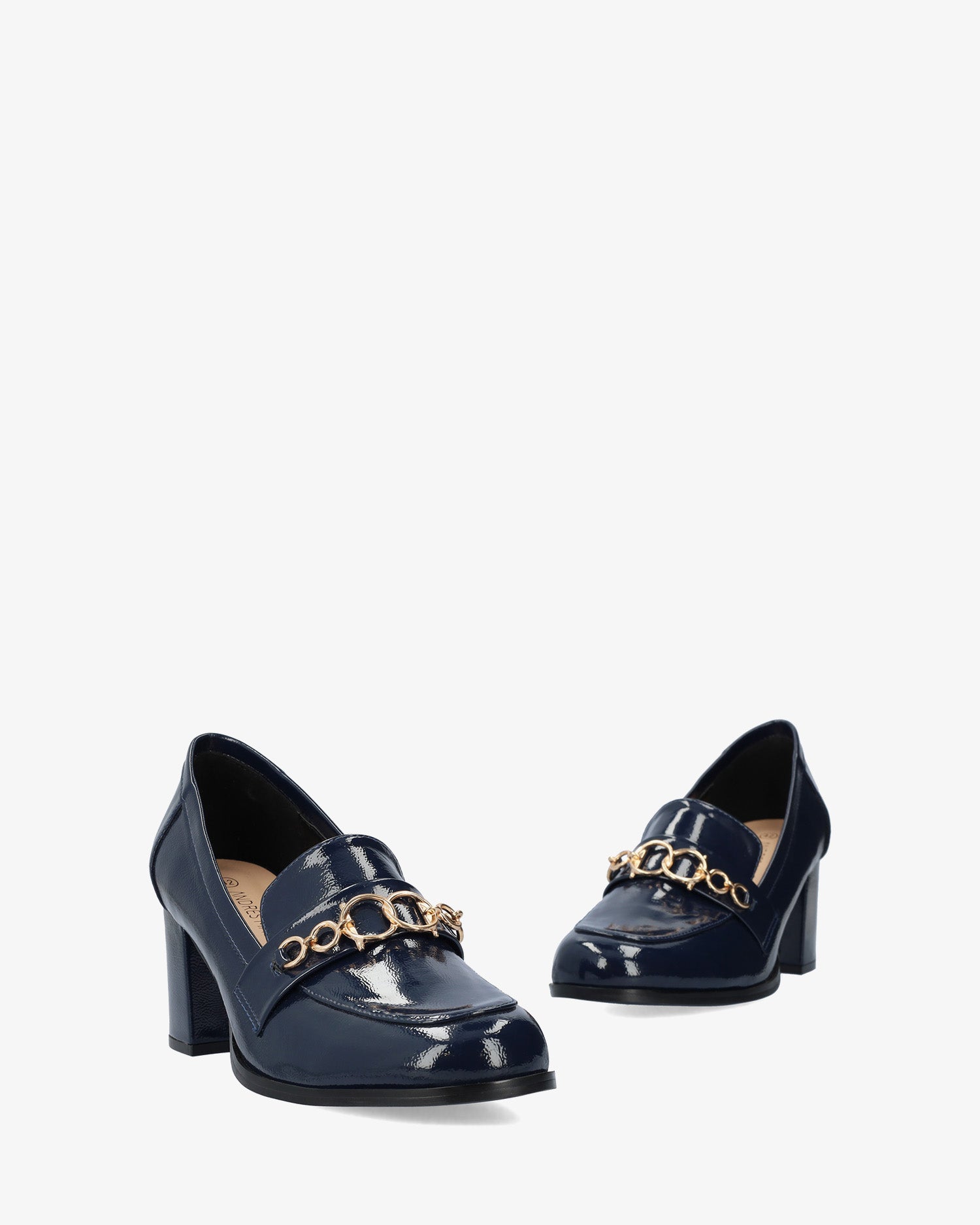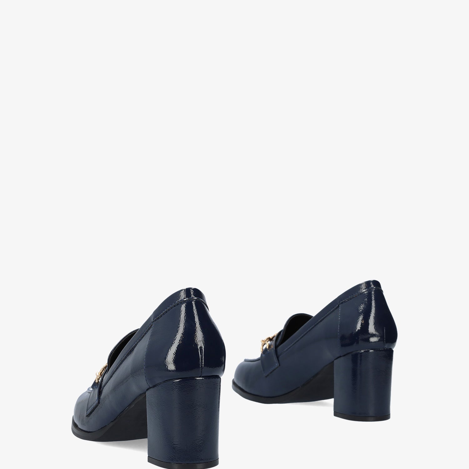 Heeled moccasins in navy patent with gold applique and decorative stitching on the toe box and vamp. Finished in a rounded toe. The heel is 2,73" high for small sizes from 32 to 35 EU and 2,92" high for large sizes from 42 to 45 EU.
