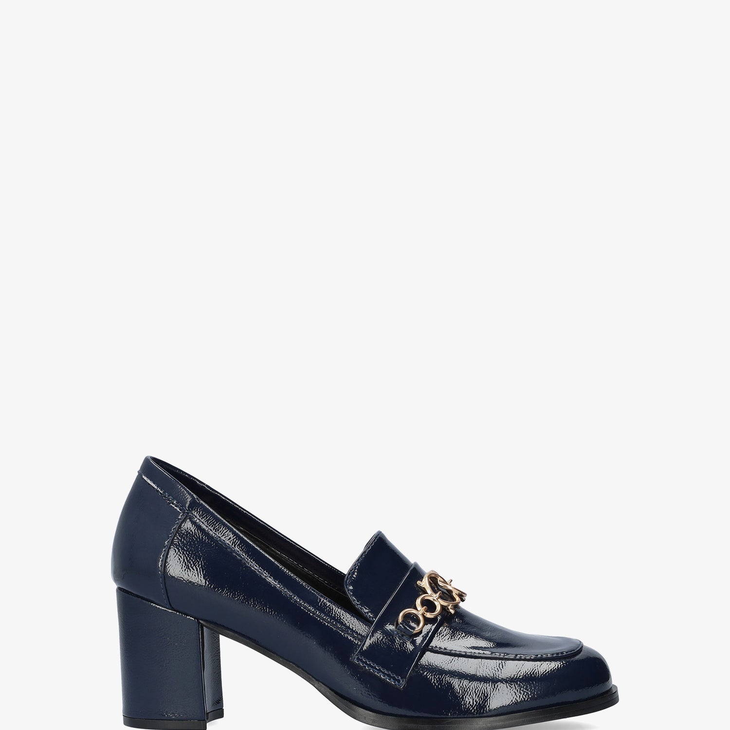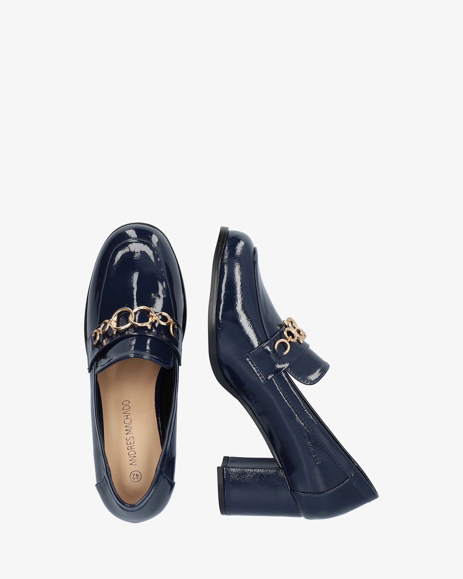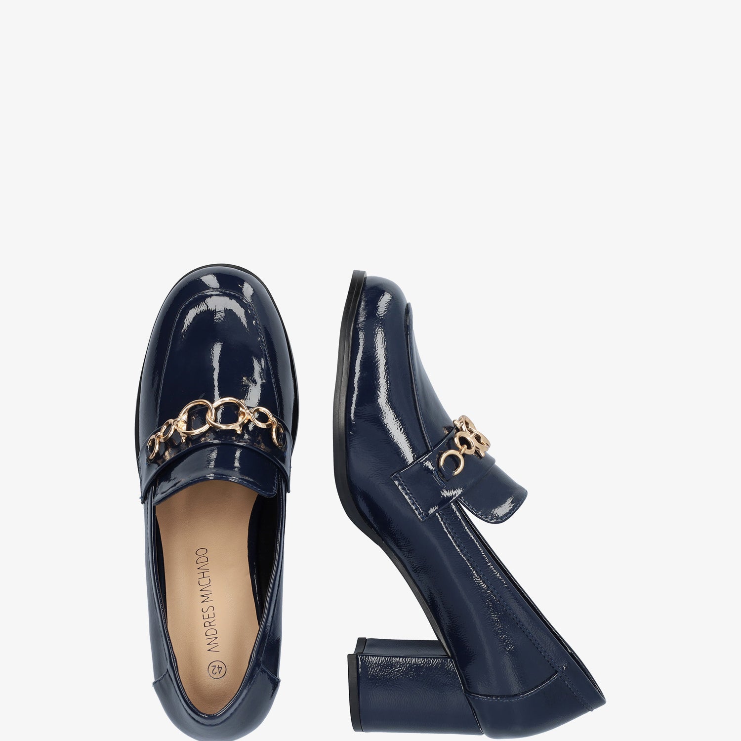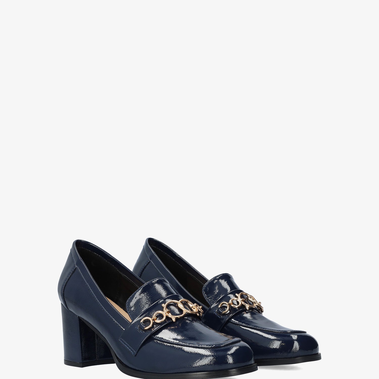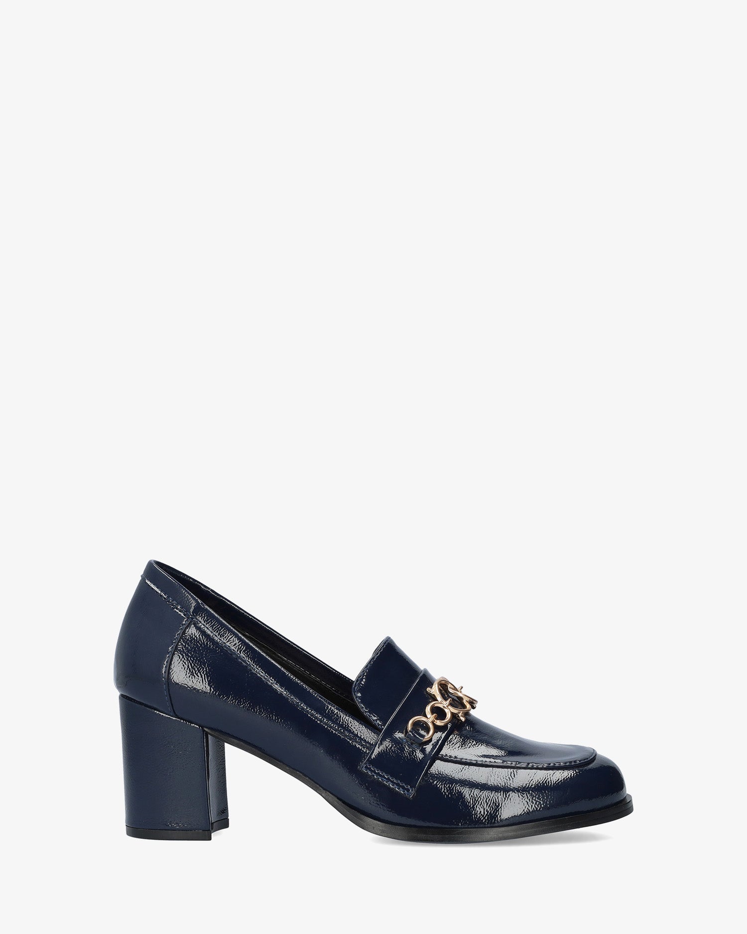Heeled moccasins in navy patent with gold applique and decorative stitching on the toe box and vamp. Finished in a rounded toe. The heel is 2,73" high for small sizes from 32 to 35 EU and 2,92" high for large sizes from 42 to 45 EU.