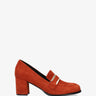 Heeled moccasins in tile-colored faux suede with matching mask detail with gold piping on the instep. Rounded shaped toe box. The wide heel is 2,73" high for small sizes from 32 to 35 EU and 2,92" high for large sizes from 42 to 45 EU.