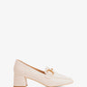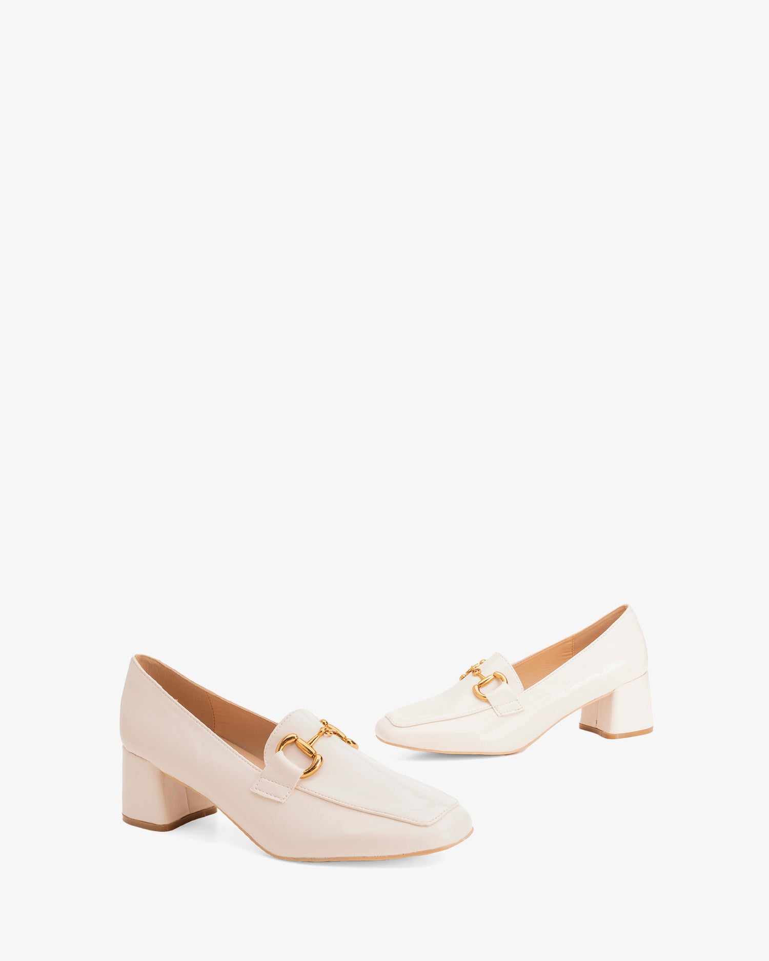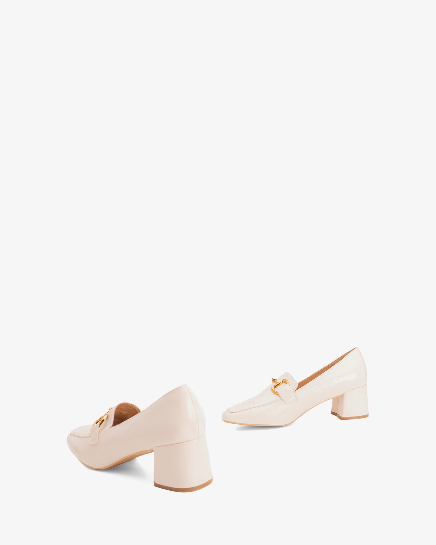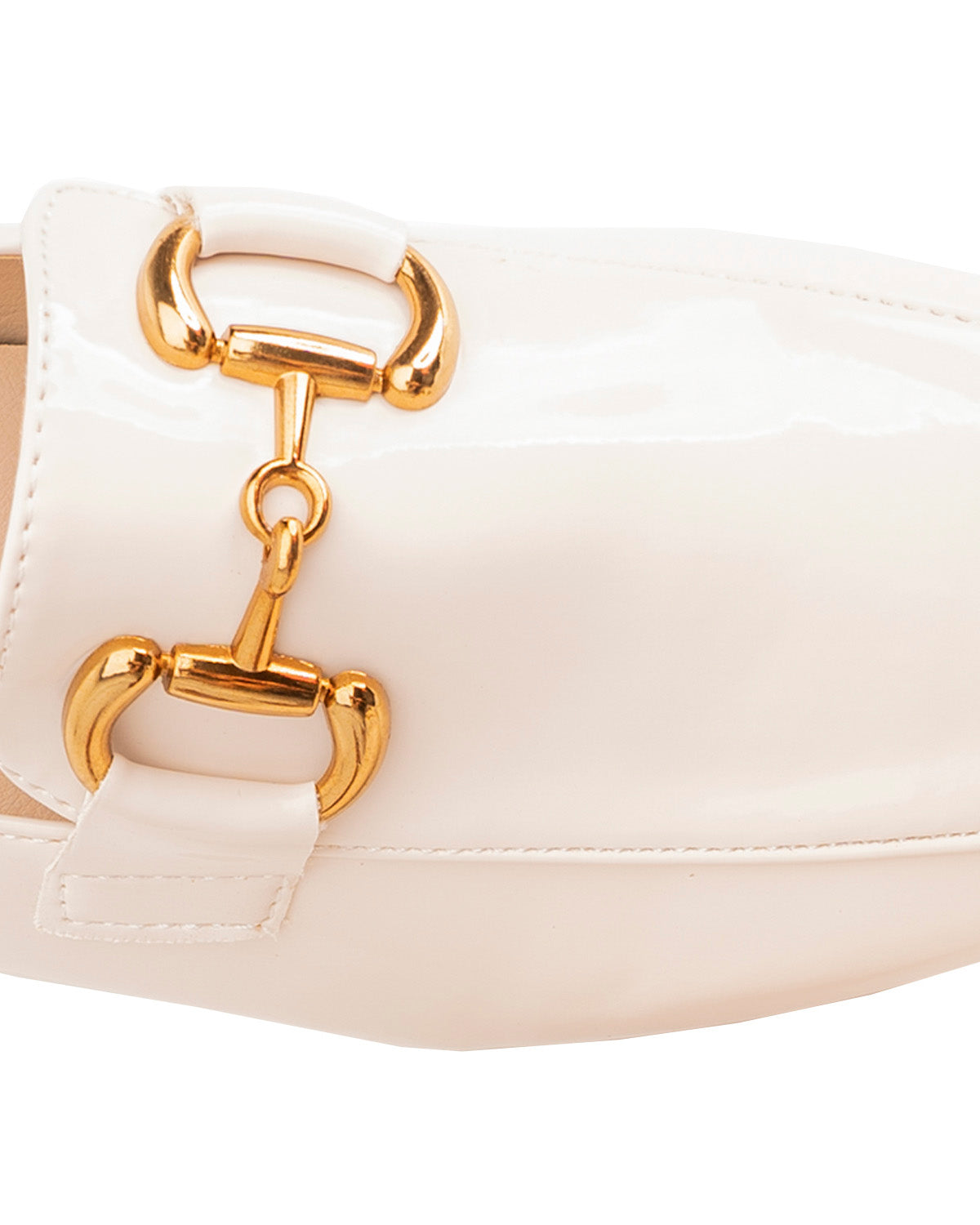 Heeled moccasins in white patent with gold applique and decorative stitching on the toe box and vamp. Finished in a square toe. The heel is 5.5 cm / 2.16`` high for small sizes from 32 to 35 EU and 5.5 cm / 2.16`` high for large sizes from 42 to 45 EU.