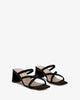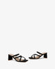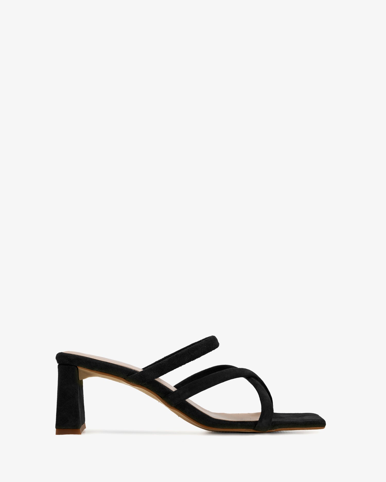 Heeled mules in black split leather. The design features two matching thin straps crossed over the instep. Finised in a square, open toe. Rectangular heel lined with matching leather. Available in sizes 32 to 45 EU. The heel is 5,5 cm / 2.16`` high for sizes from 32 to 37 EU. The heel is 6 cm / 2.36`` high for sizes from 38 to 45 EU. Made in Spain.