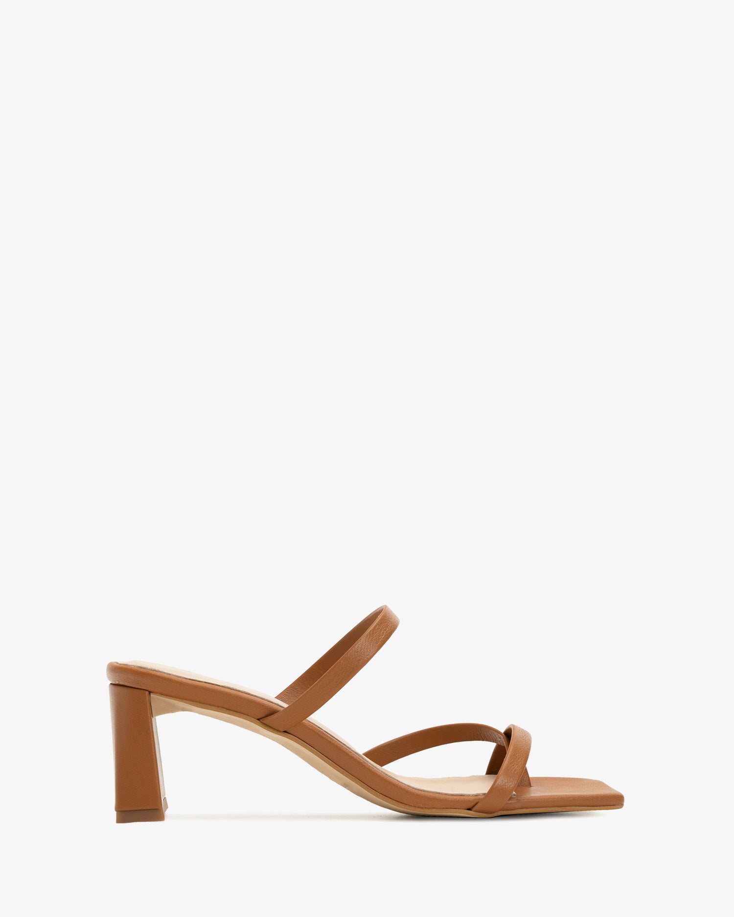 Heeled mules in brown leather. The design features two matching thin straps crossed over the instep, creating a toe strap. Square and open toe. Rectangular heel in brown leather. Available in sizes 32 to 45 EU. The heel is 5.5 cm / 2.16`` high for sizes from 32 to 37 EU. The heel is 6 cm / 2.36`` high for sizes from 38 to 45 EU. Made in Spain.