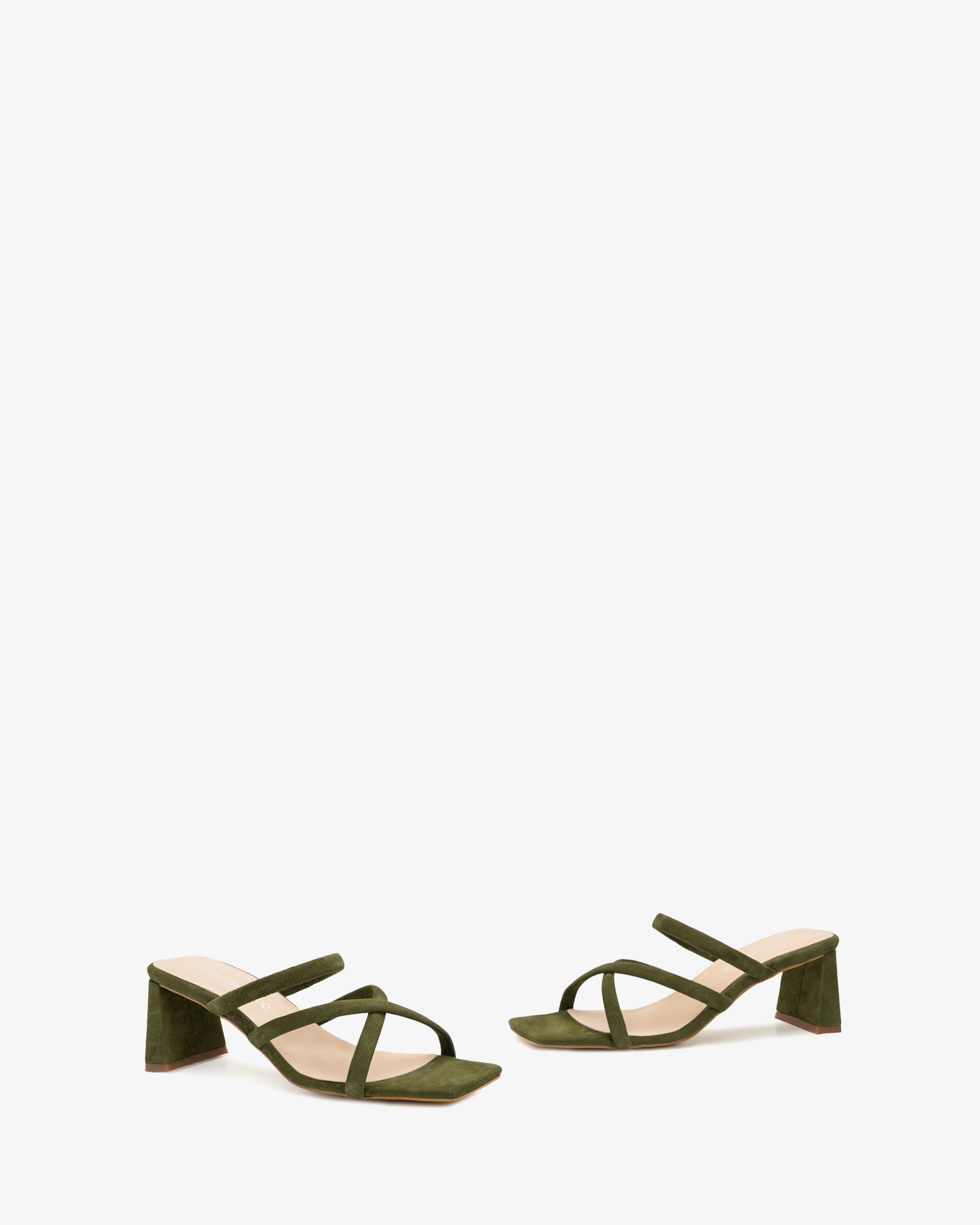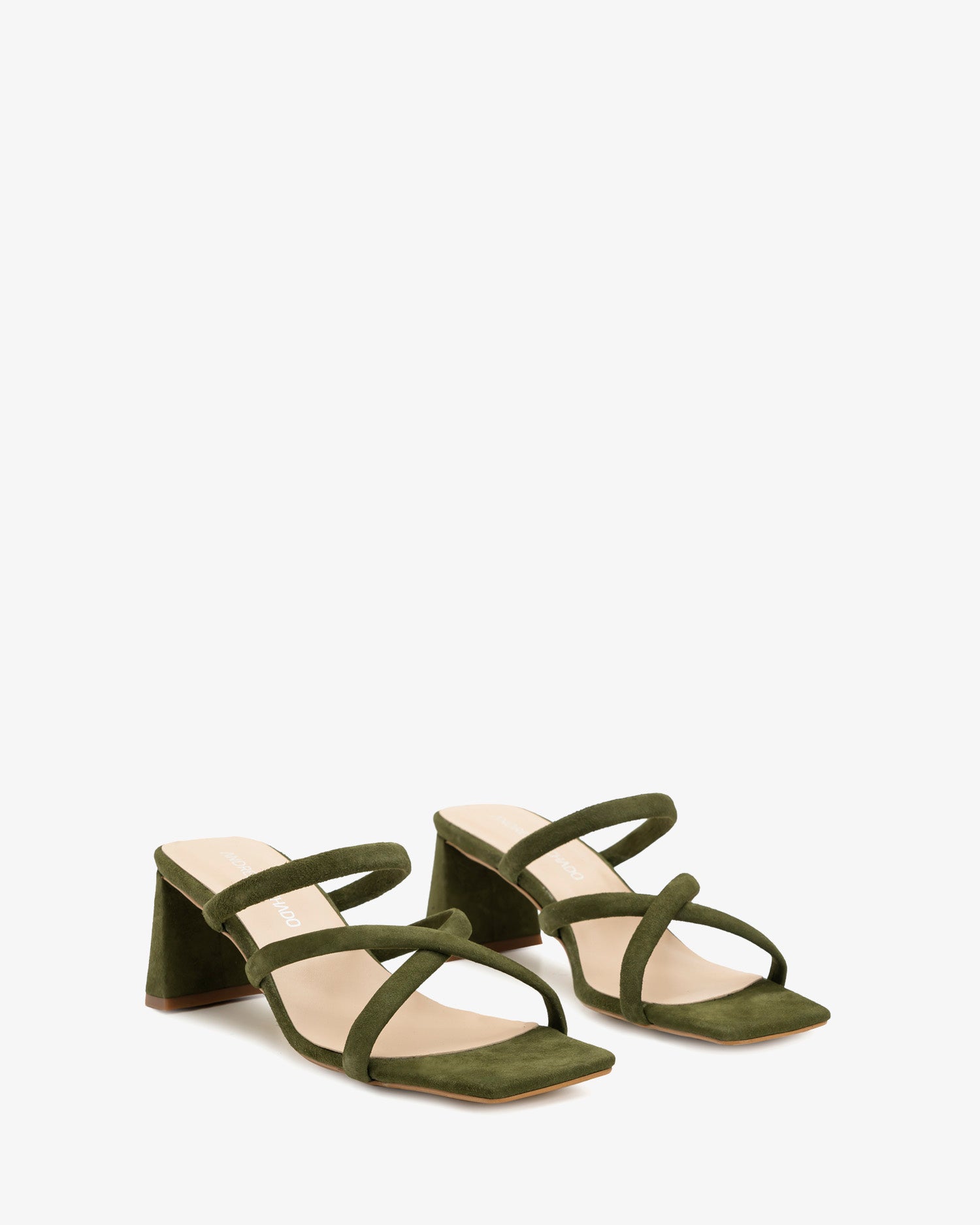 Heeled mules in kaki split leather. The design features two matching thin straps crossed over the instep. Finised in a square, open toe. Rectangular heel lined with matching leather. Available in sizes 32 to 45 EU. The heel is 5,5 cm / 2.16`` high for sizes from 32 to 37 EU. The heel is 6 cm / 2.36`` high for sizes from 38 to 45 EU. Made in Spain.