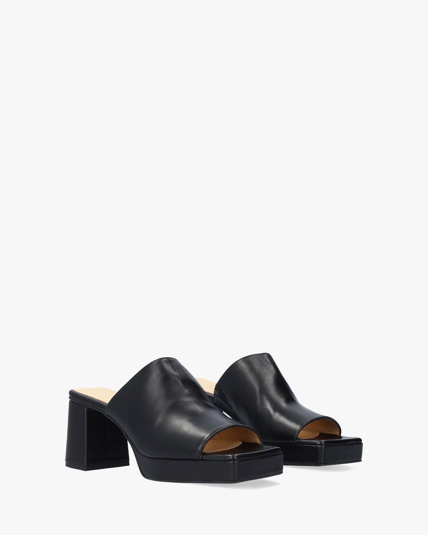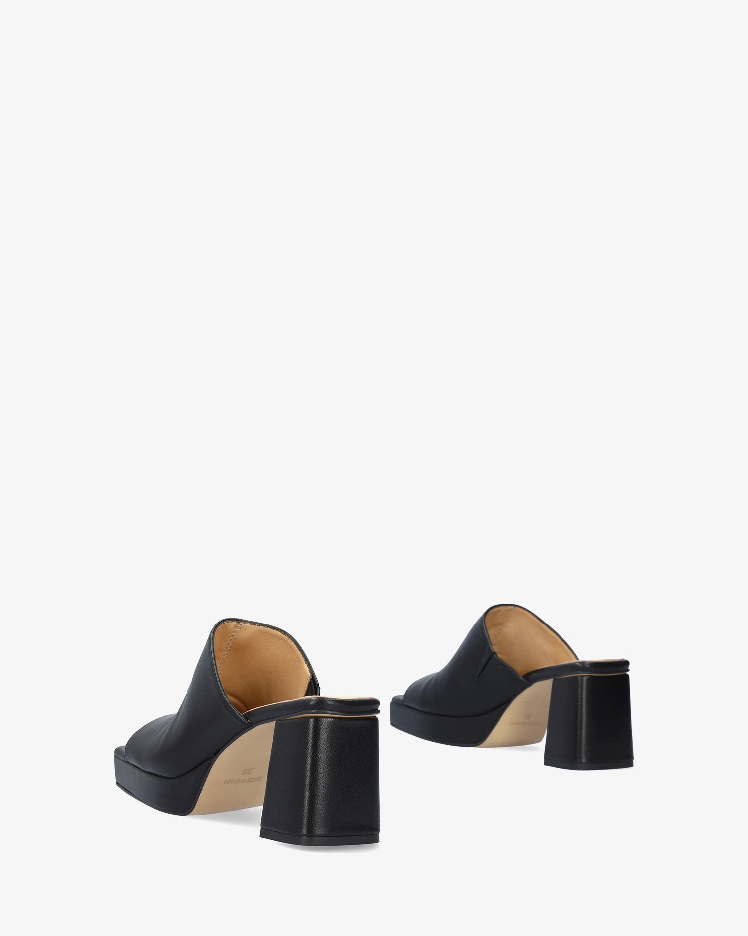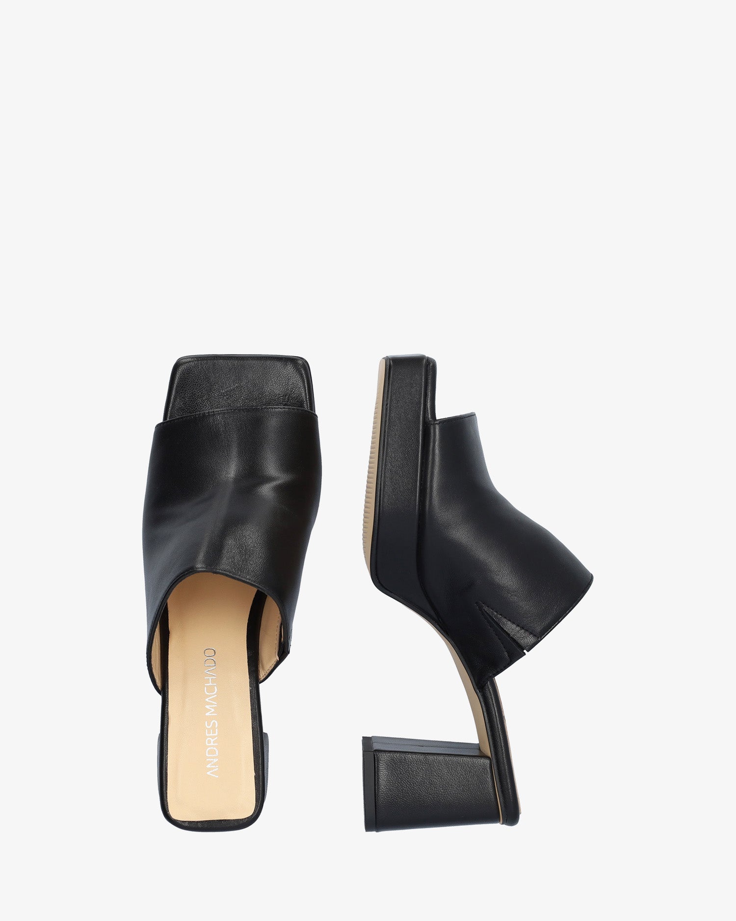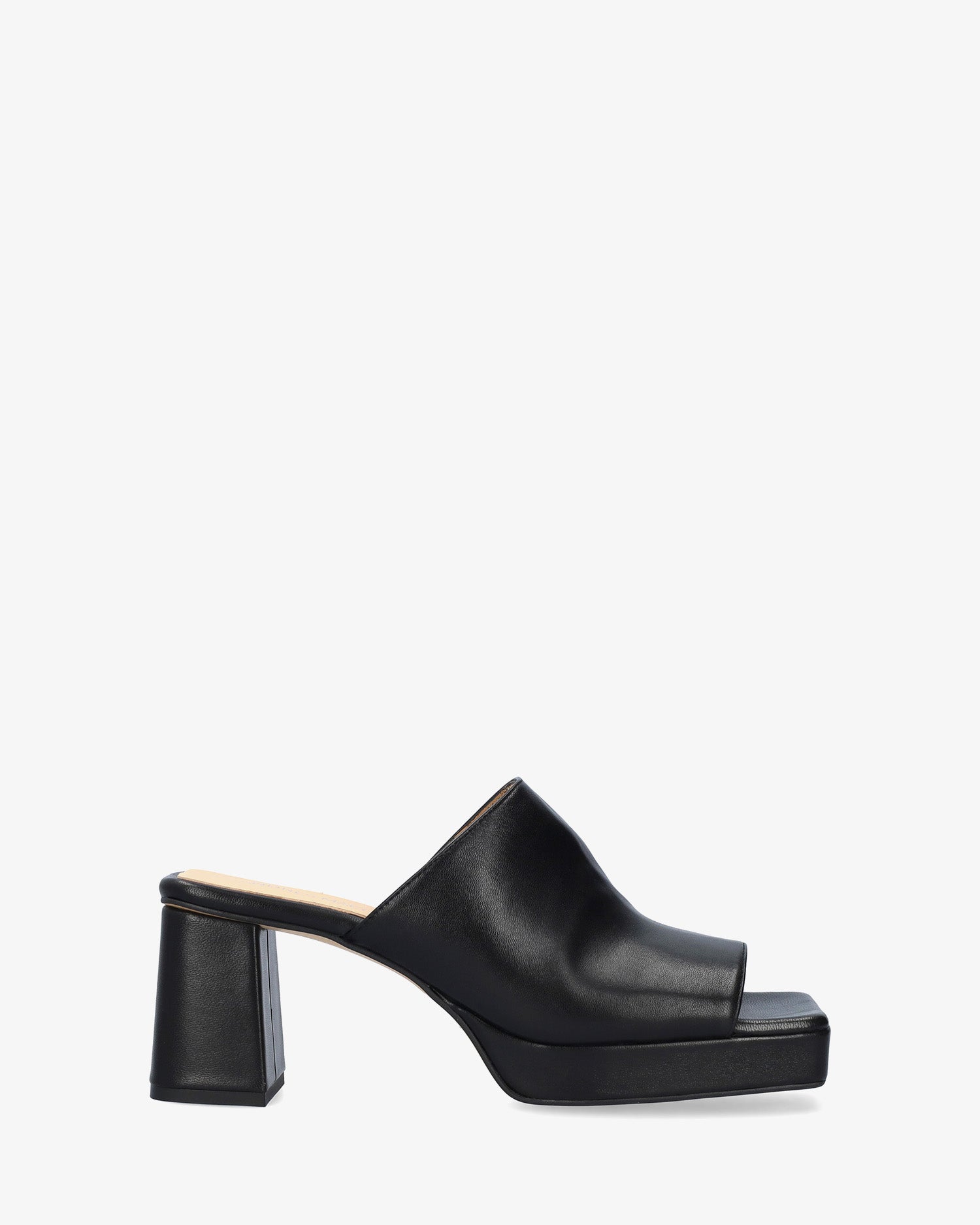 Heeled mules with platform in black leather. The design features a plain cut with an open squared toe. The thick matching lined heel measures 2,95" and the platform 0,98" for small sizes from 32 to 35. And for large sizes from 42 to 45 the heel measures 3,15" and the platform 0,98". Made in Spain.