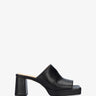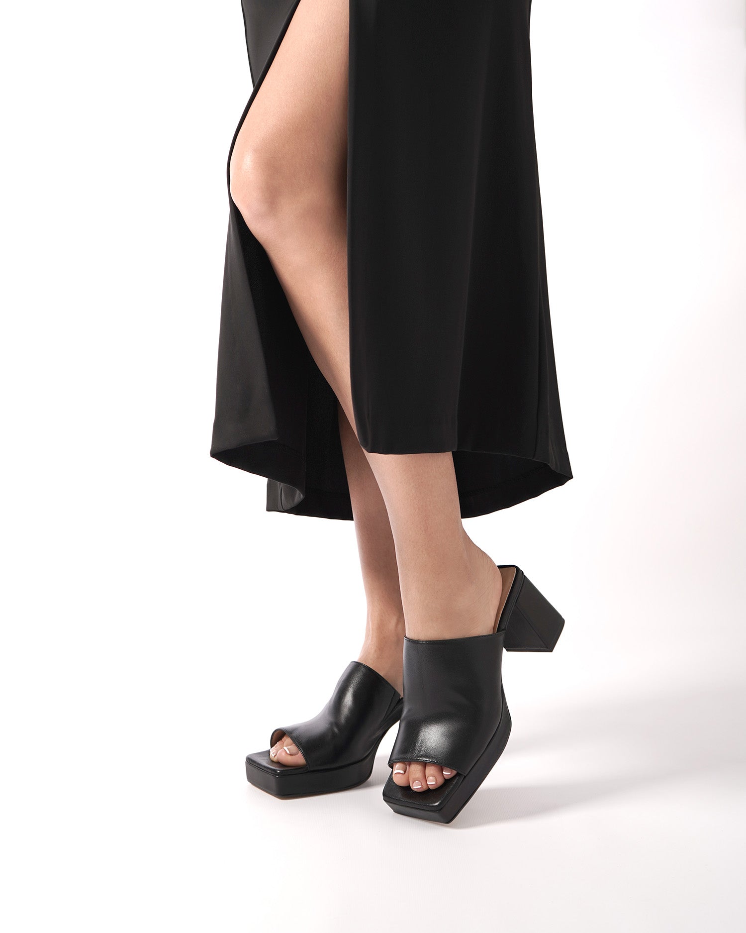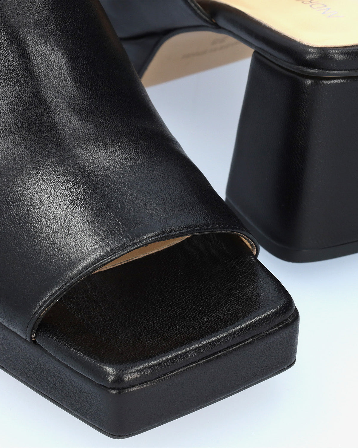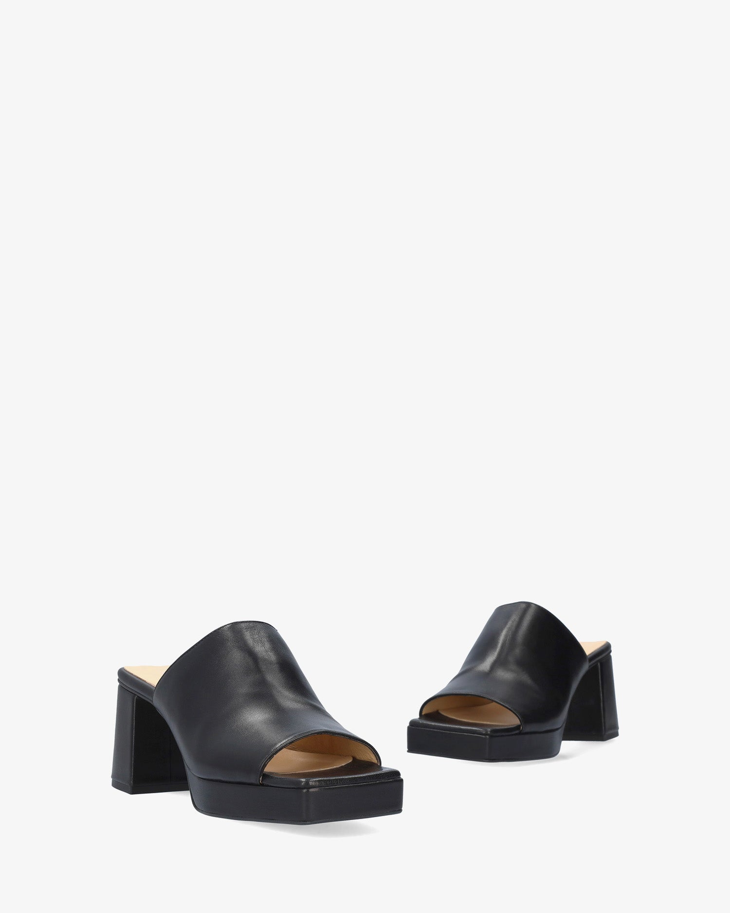 Heeled mules with platform in black leather. The design features a plain cut with an open squared toe. The thick matching lined heel measures 2,95" and the platform 0,98" for small sizes from 32 to 35. And for large sizes from 42 to 45 the heel measures 3,15" and the platform 0,98". Made in Spain.