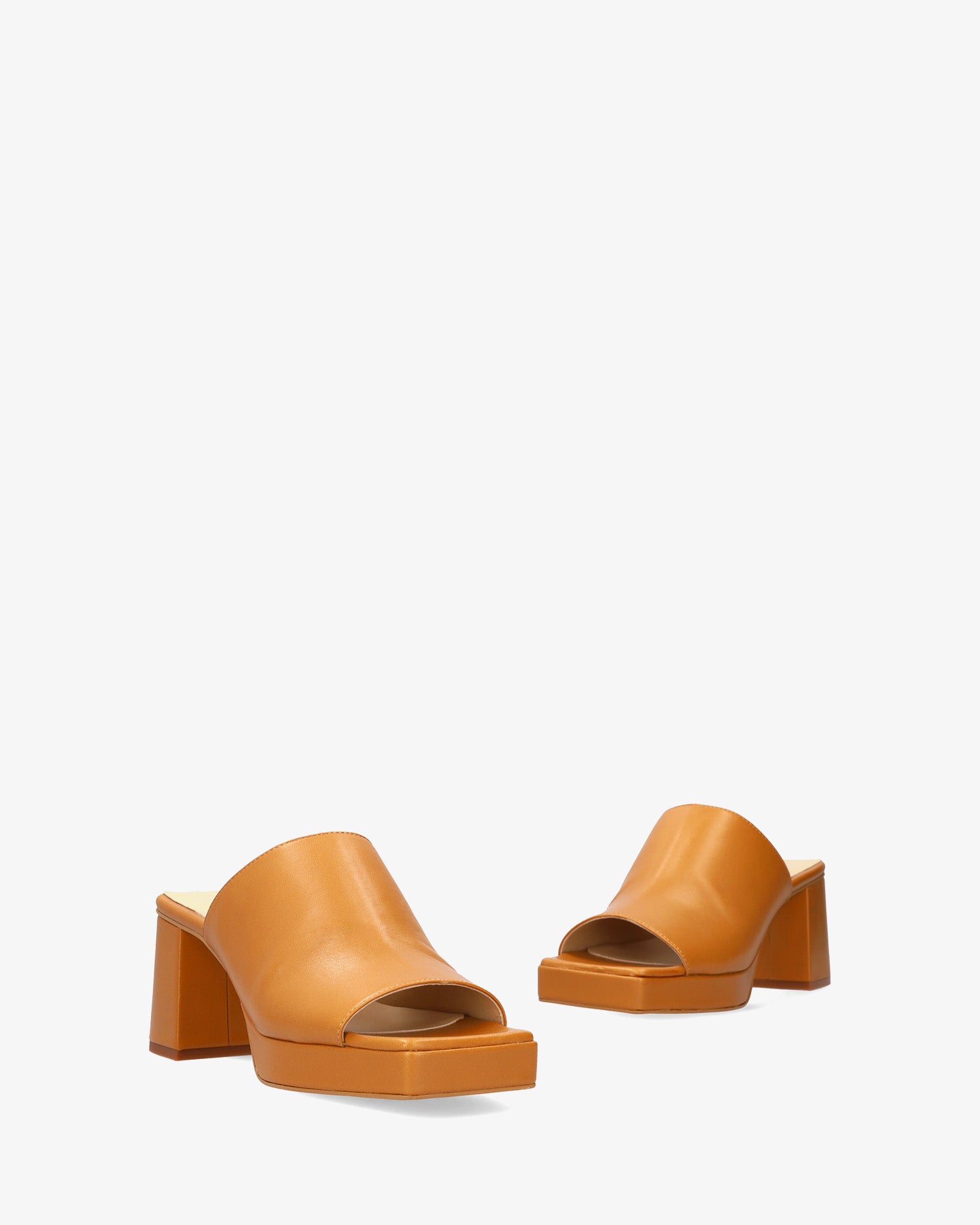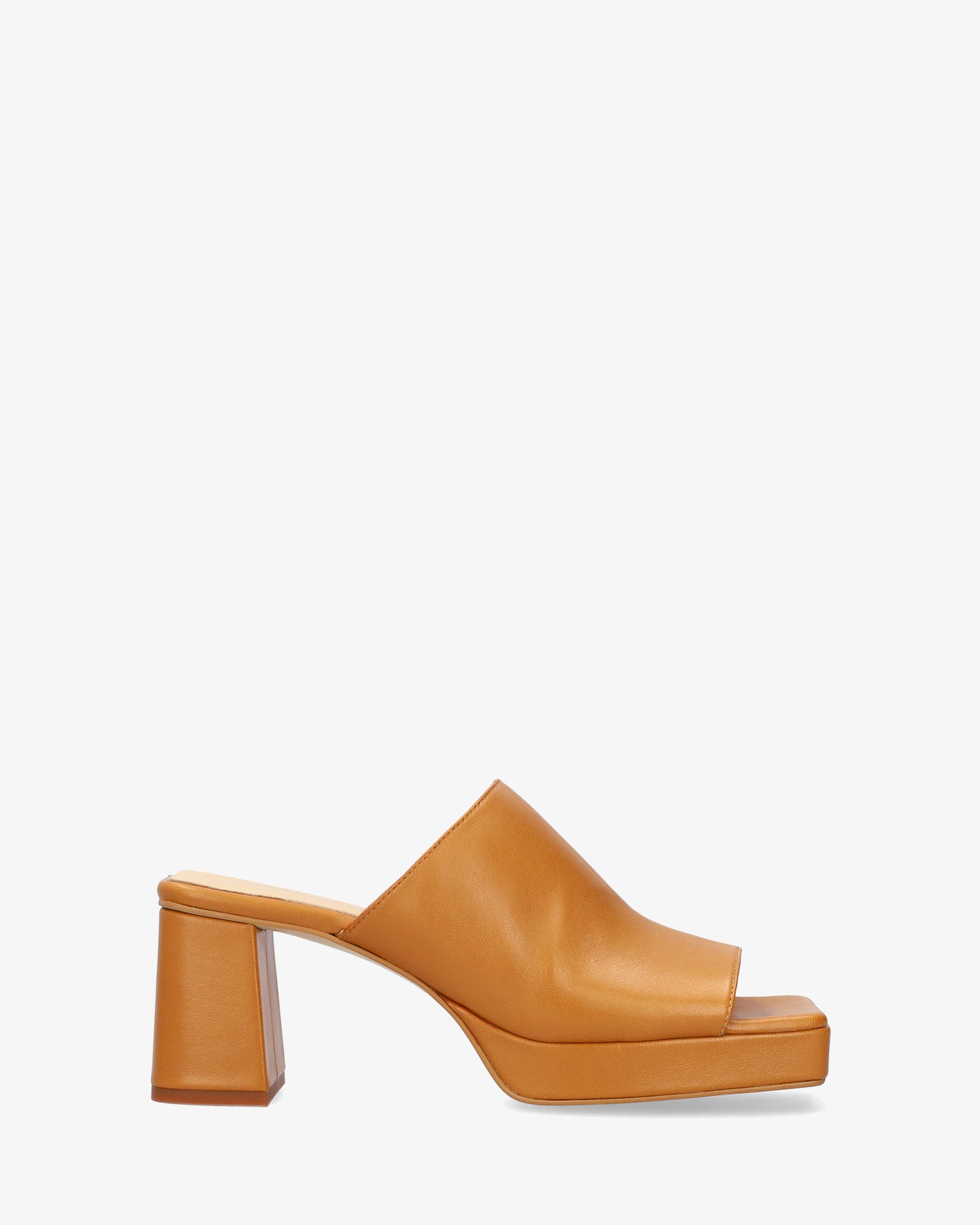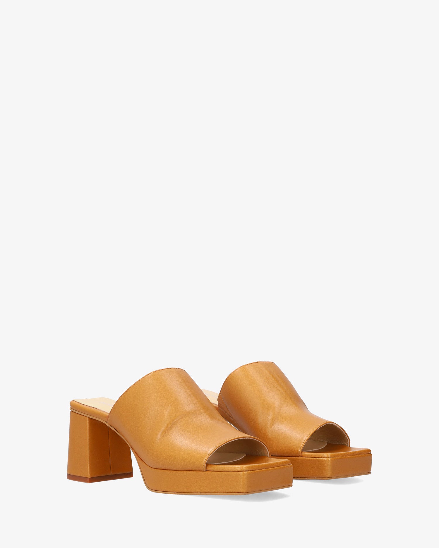Heeled mules with platform in camel leather. The design features a plain cut with an open squared toe. The thick matching lined heel measures 2,95" and the platform 0,98" for small sizes from 32 to 35. And for large sizes from 42 to 45 the heel measures 3,15" and the platform 0,98". Made in Spain.