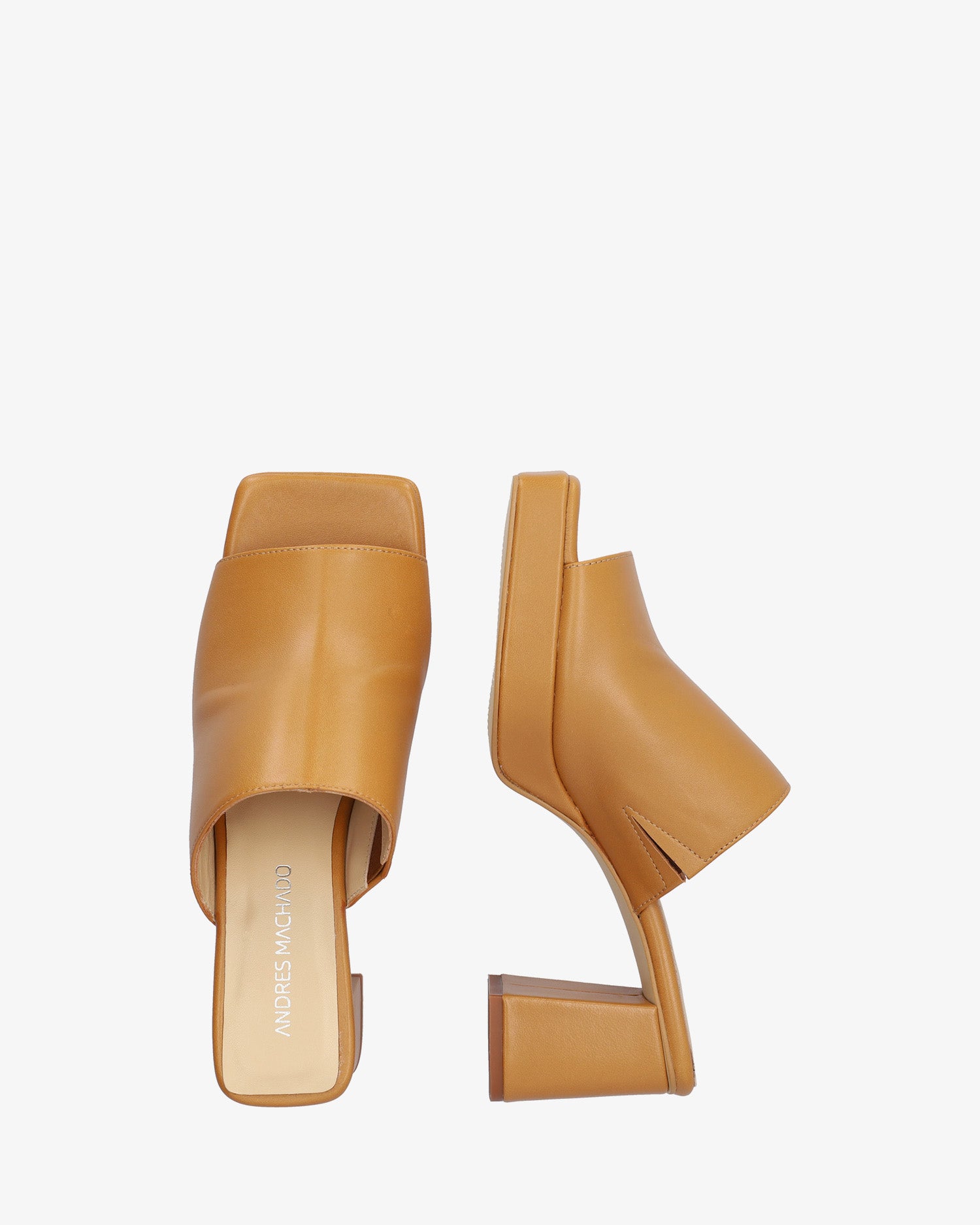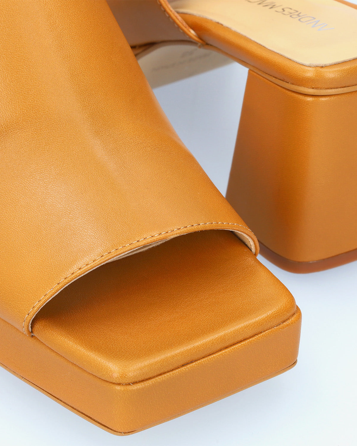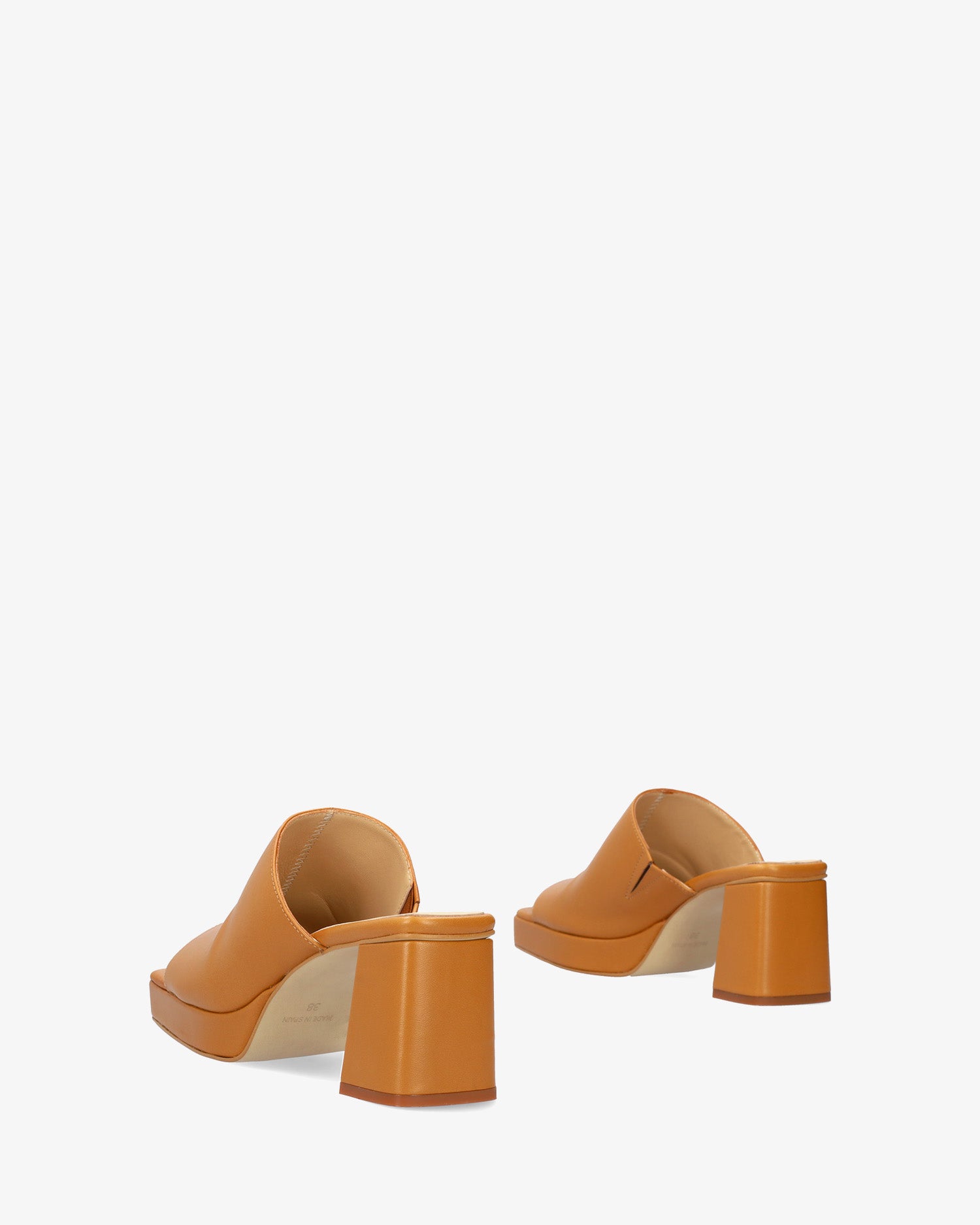 Heeled mules with platform in camel leather. The design features a plain cut with an open squared toe. The thick matching lined heel measures 2,95" and the platform 0,98" for small sizes from 32 to 35. And for large sizes from 42 to 45 the heel measures 3,15" and the platform 0,98". Made in Spain.