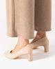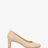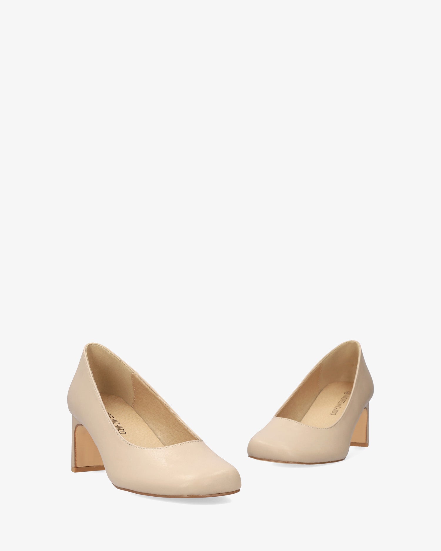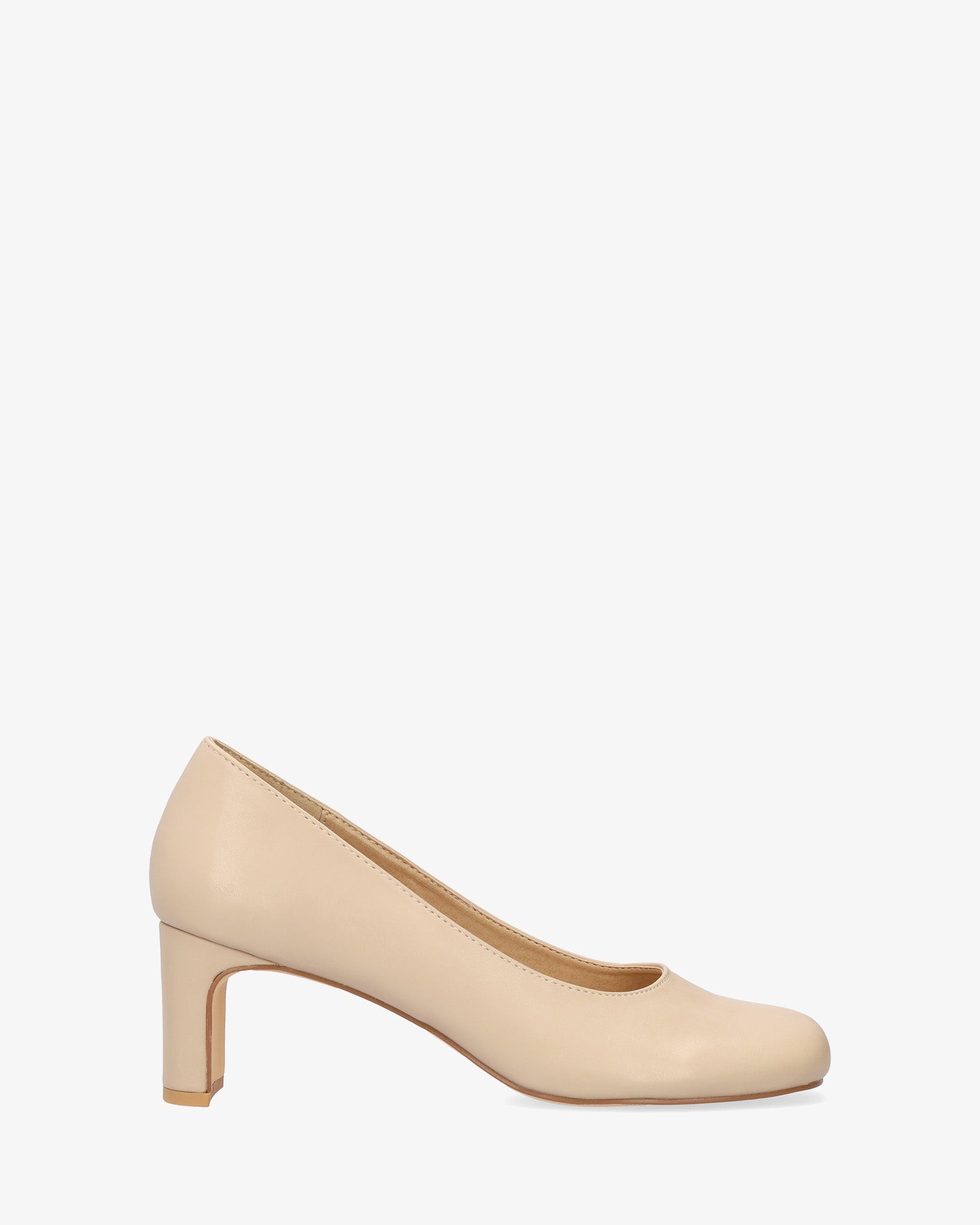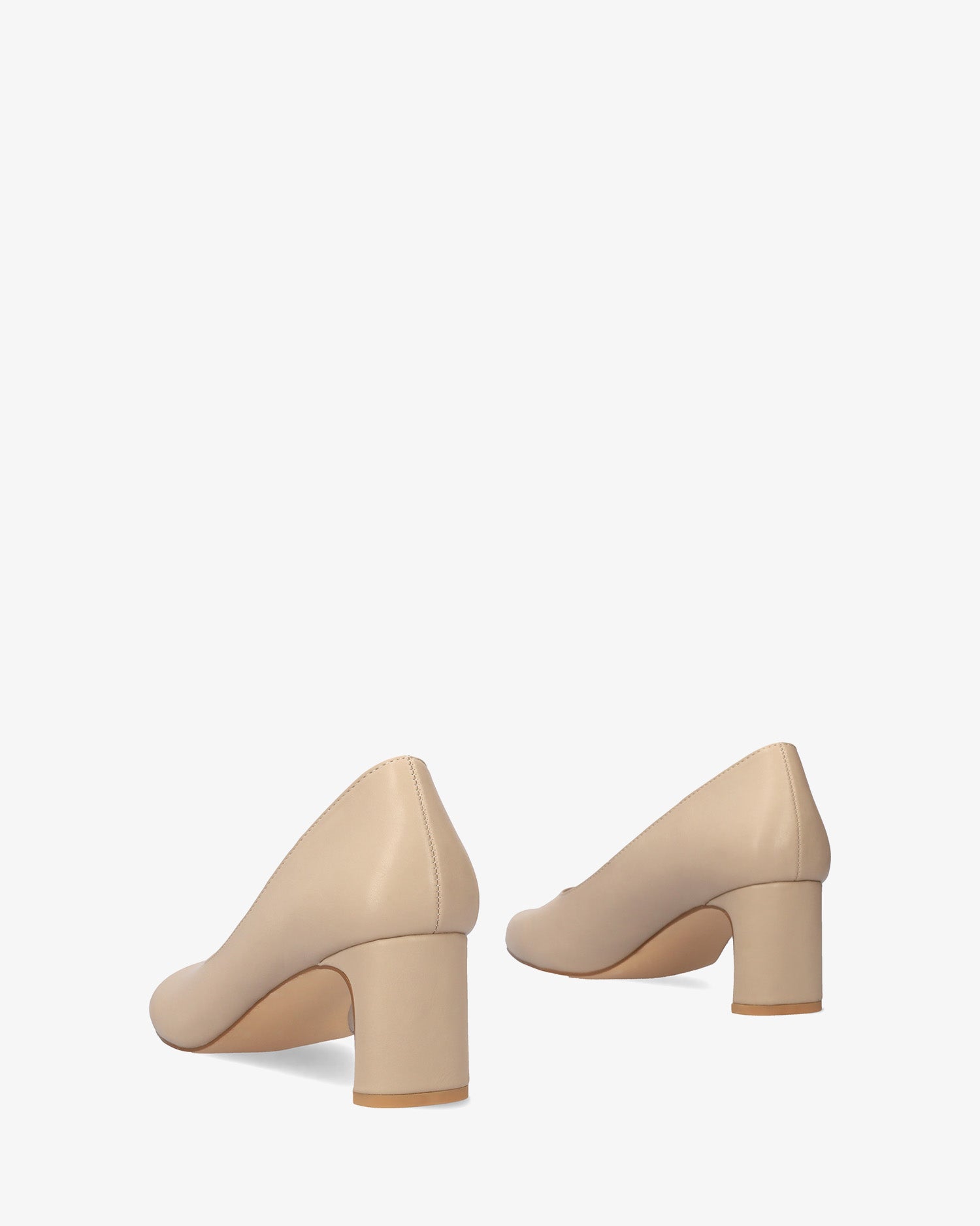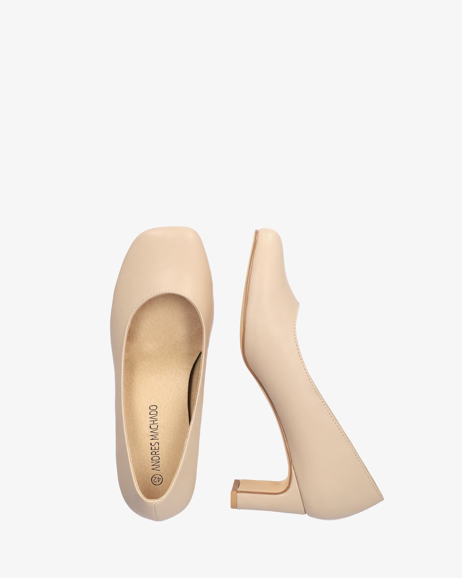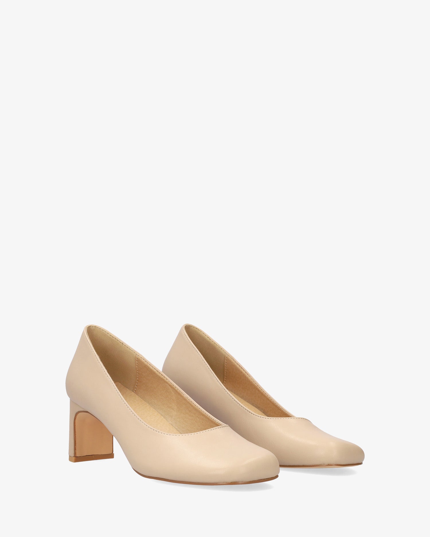 Heeled pumps in soft beige faux leather. This pointy-toed pumps feature a mid-squared lined heel which measures 7cm / 2,75" for small sizes from 32 to 35 and 7cm / 2,75" for large sizes from 43 to 45.