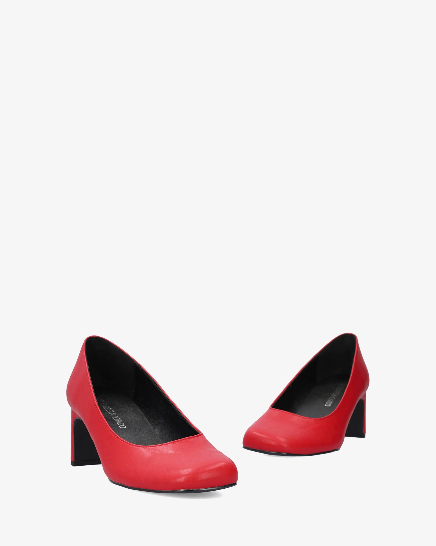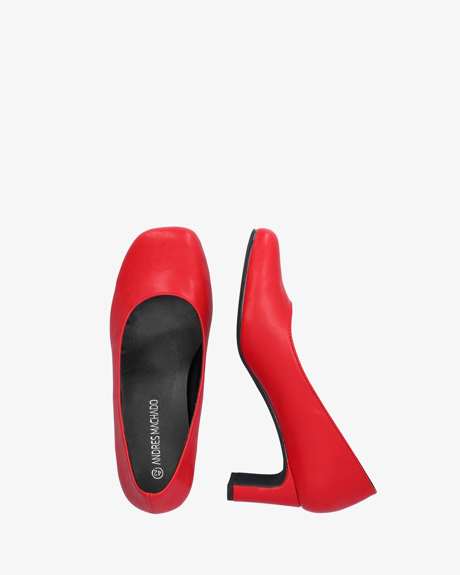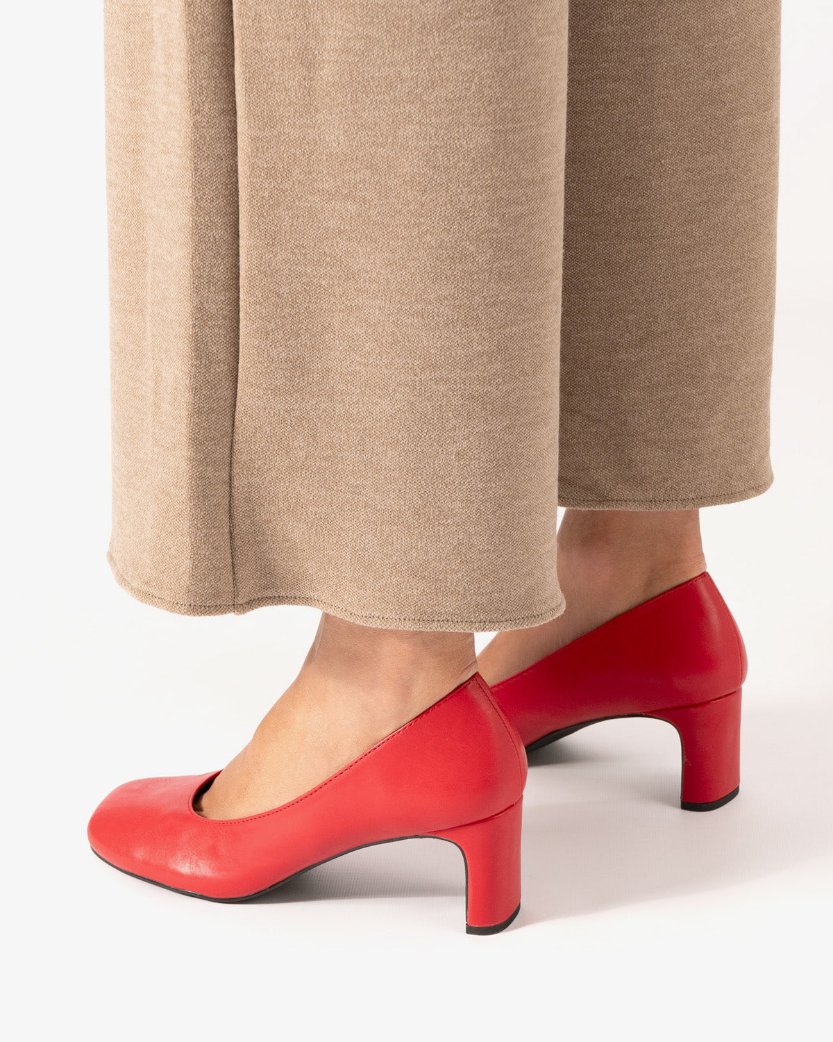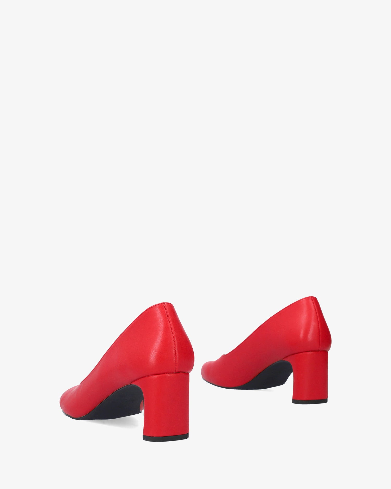 Heeled pumps in soft red faux leather. This pointy-toed pumps feature a mid-squared lined heel which measures 7cm / 2,75" for small sizes from 32 to 35 and 7cm / 2,75" for large sizes from 42 to 45.