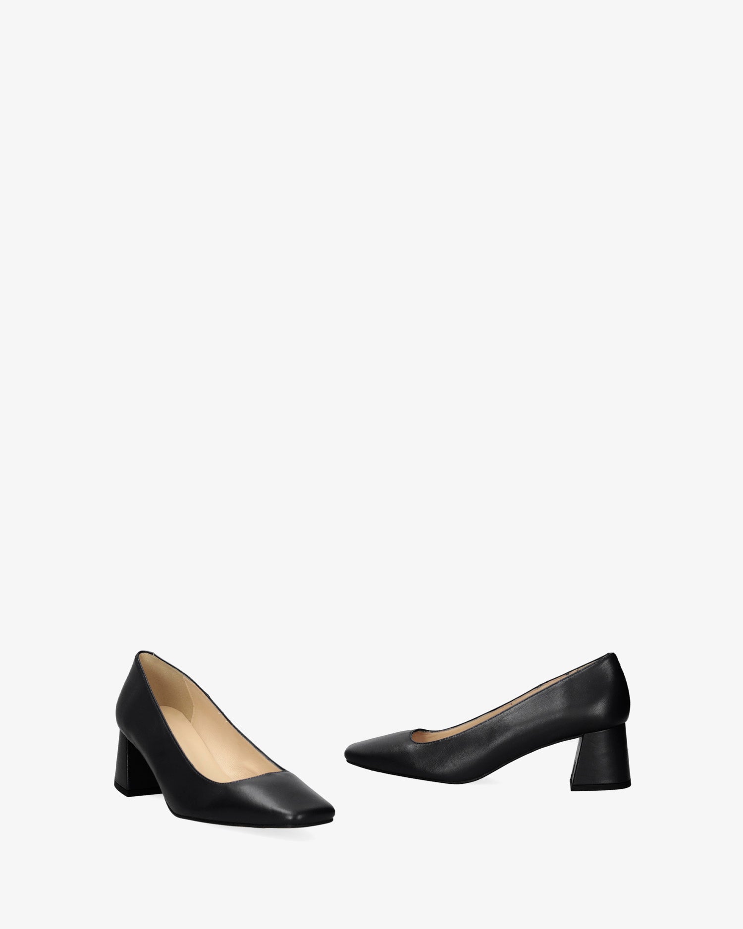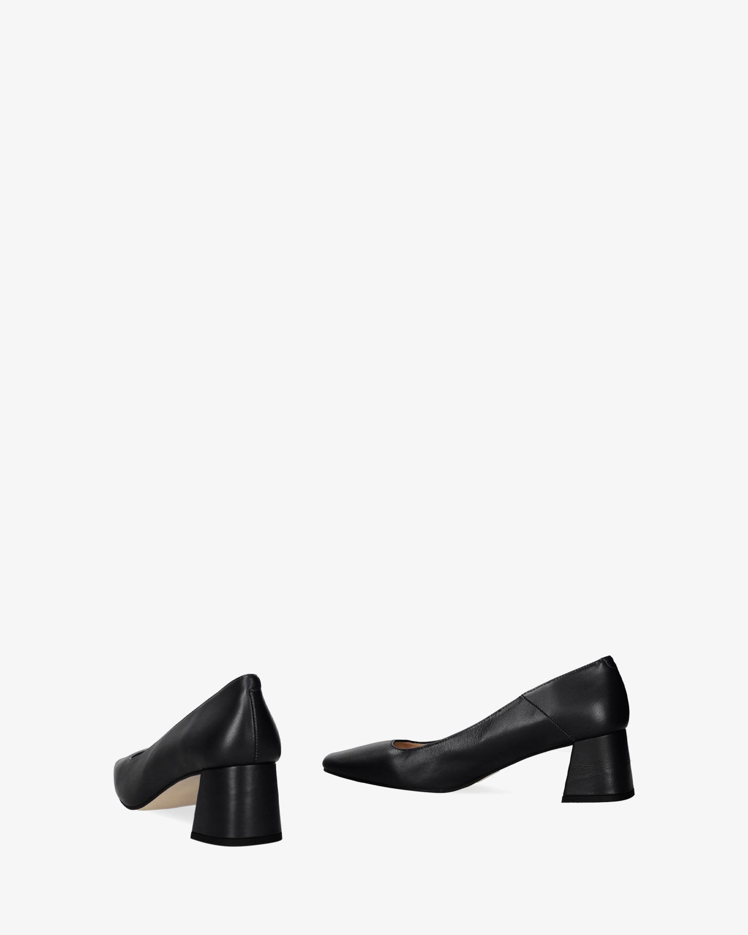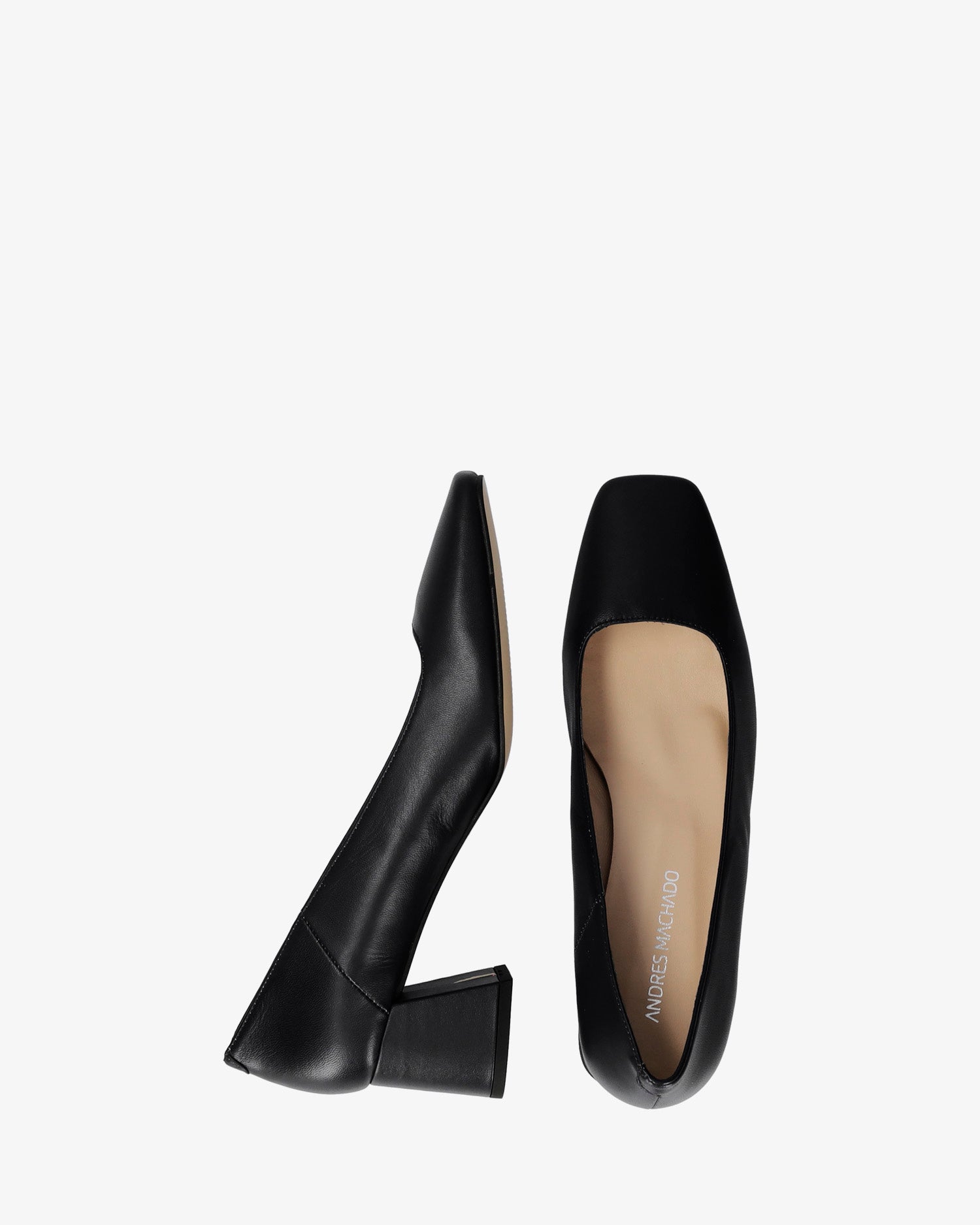 Black leather shoes. Beige leather inner lining. Finished in a square toe. The flare heel, lined in matching leather, is 5 cm / 1.96`` high for small sizes from 32 to 35 EU, 5 cm / 1.96`` high for medium sizes from 36 to 41 EU and 6 cm / 2.36`` high for large sizes from 42 to 45 EU. Made in Spain.