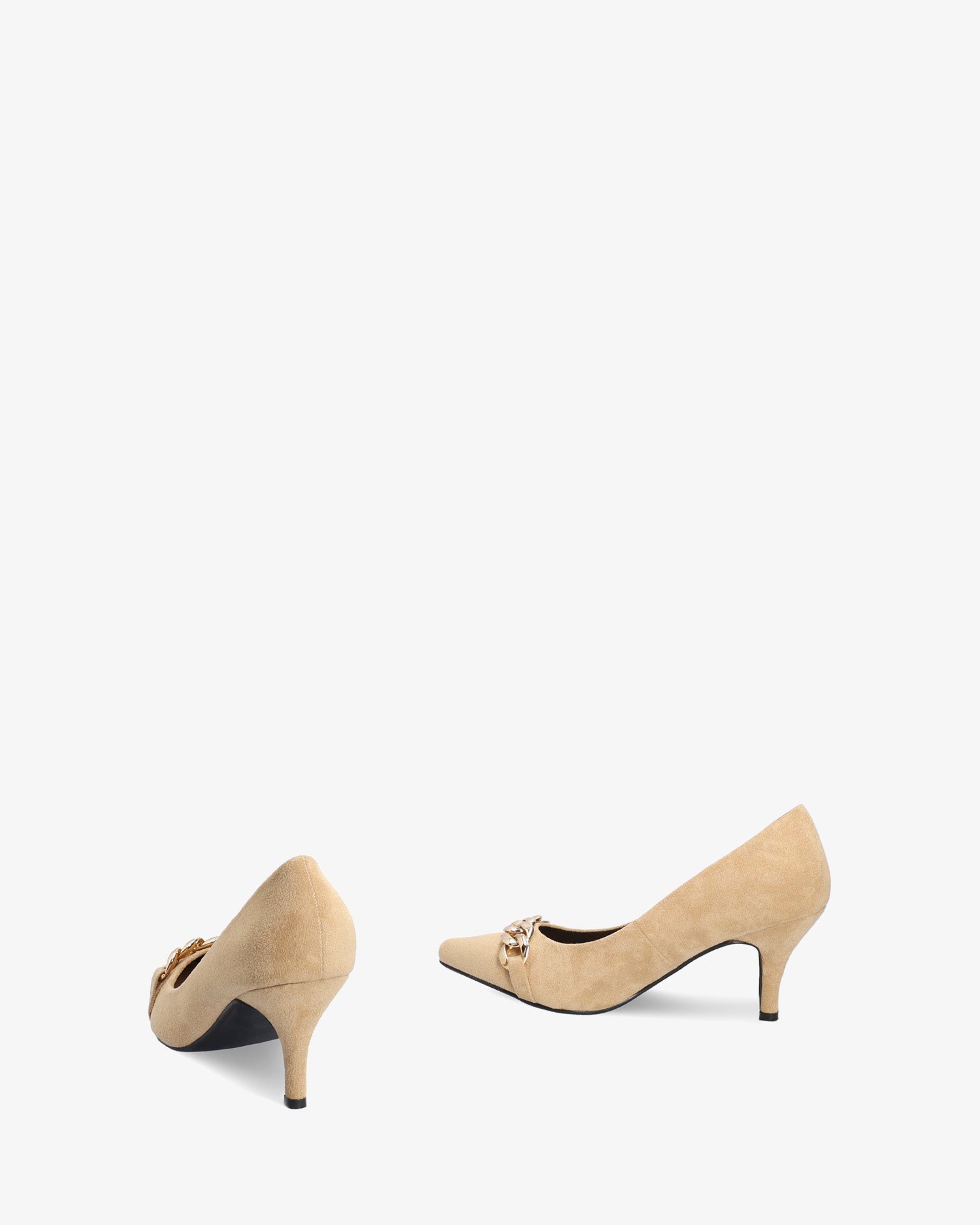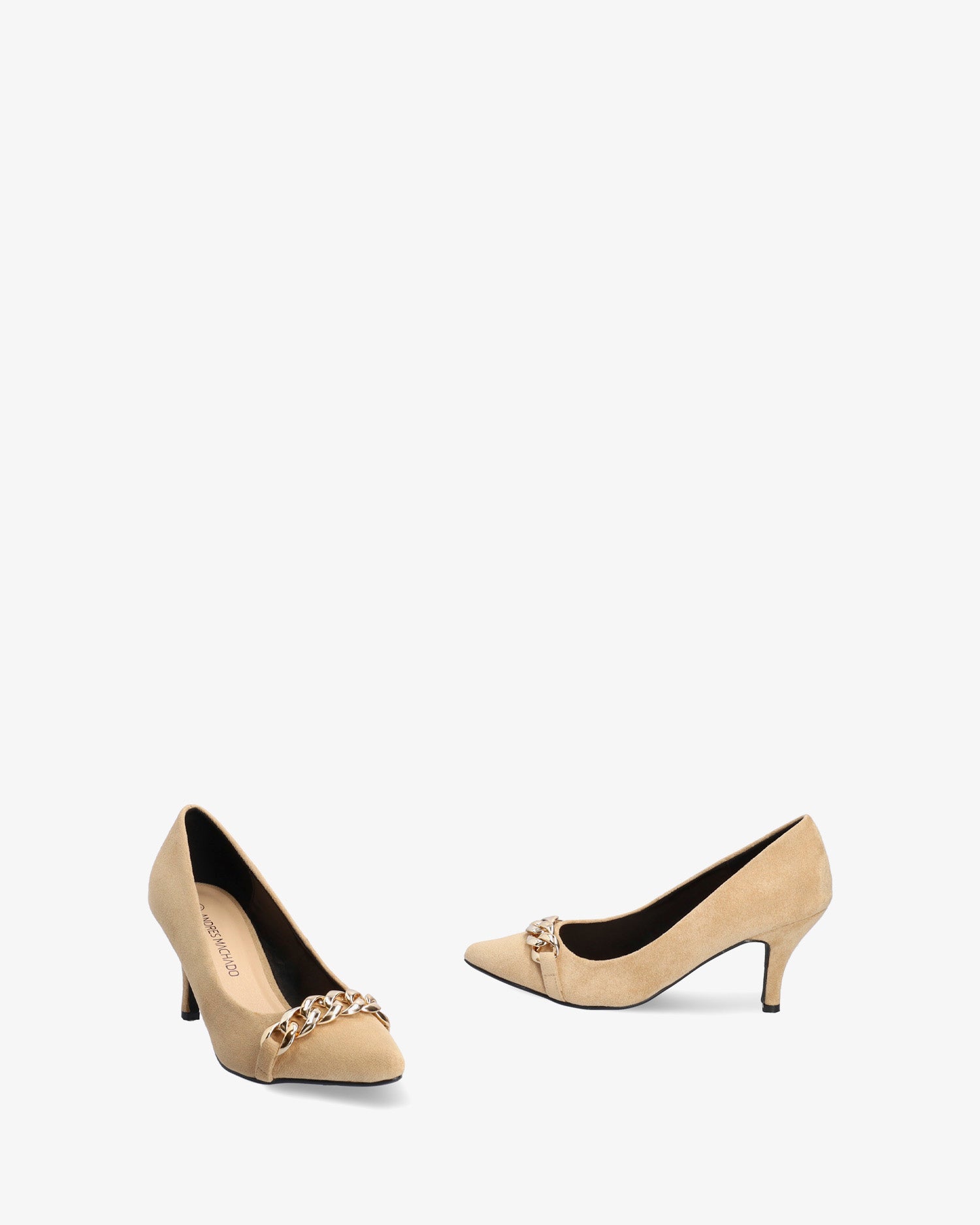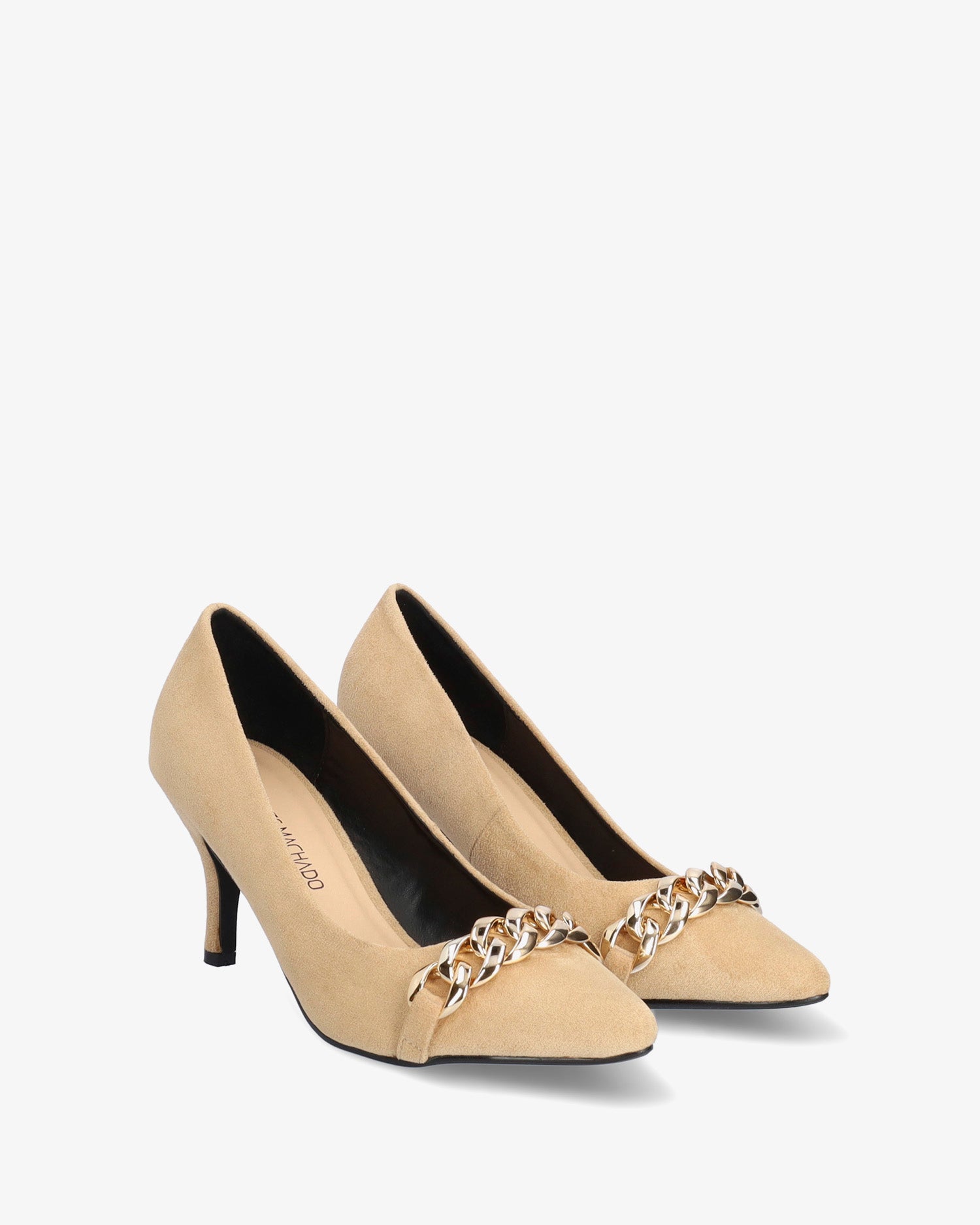 Heeled shoes in beige faux suede and gold chain links detail on the vamp. Finished in a pointed toe. The thin heel is 6 cm / 2.36" high for small sizes from 32 to 35 EU and 8 cm / 3.14" high for large sizes from 42 to 45 EU. This model fits small, we recommend taking one size larger than usual.